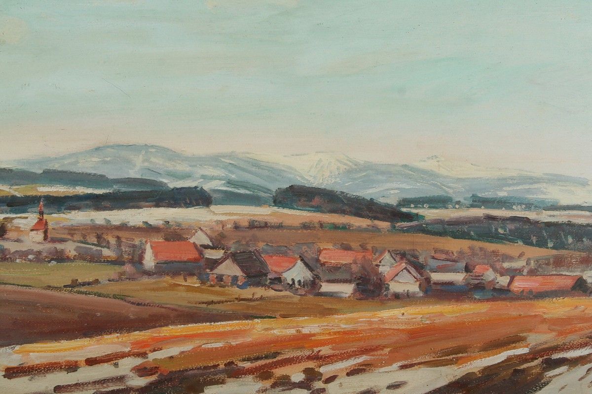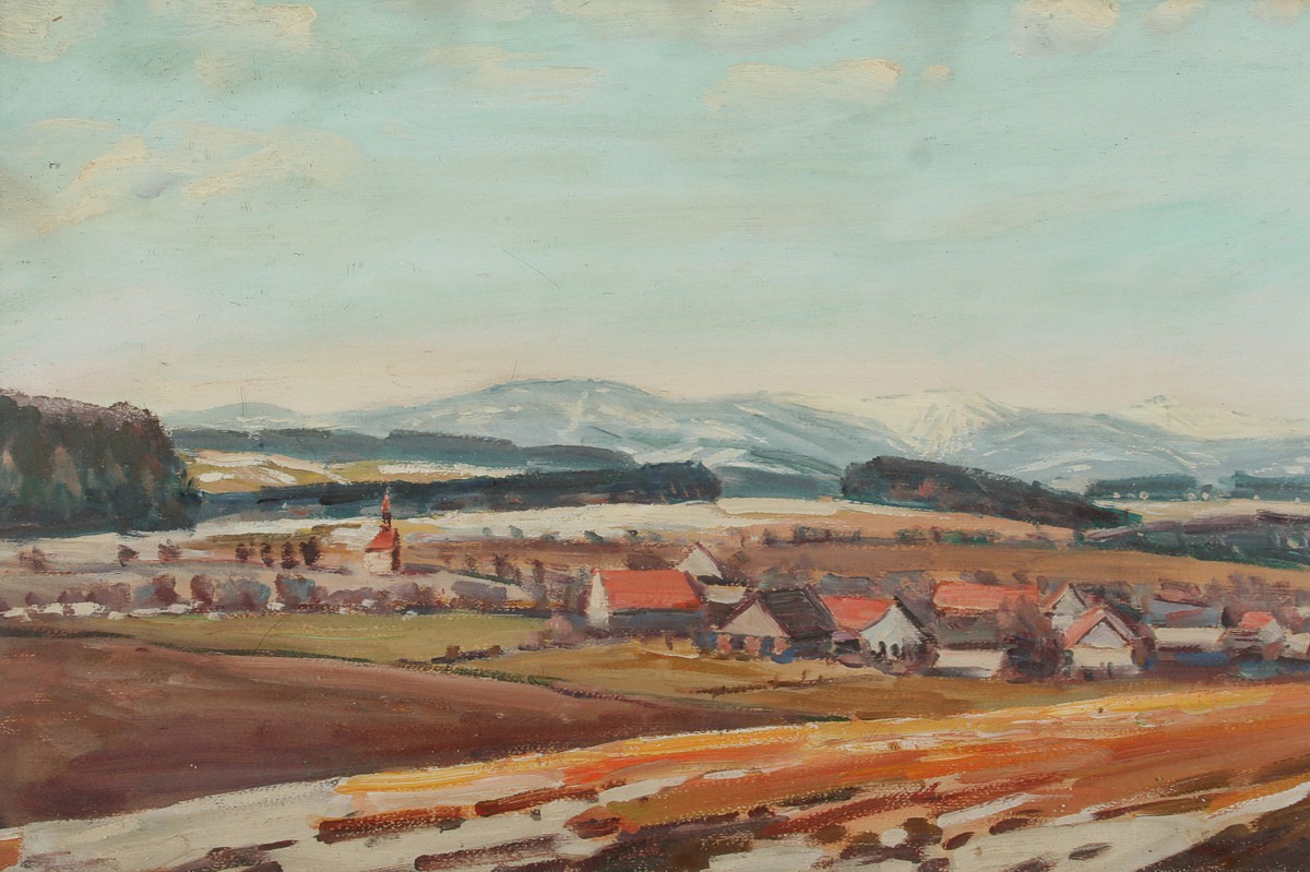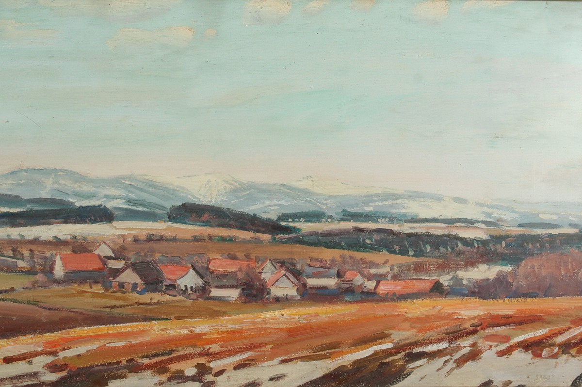 obraz podhorské jarní krajiny, rozsáhlý pohled na Lhotky u Náchoda s Krkonošemi v pozadí, olej nakartonu 40 x 80 cm s rámem 50 x 89 cm, autor Karel Šafář, podepsáno vpravo dole K. Šafář na zadní straně autodedikace Jasný jarní den na Lhotkách 1977, rámováno