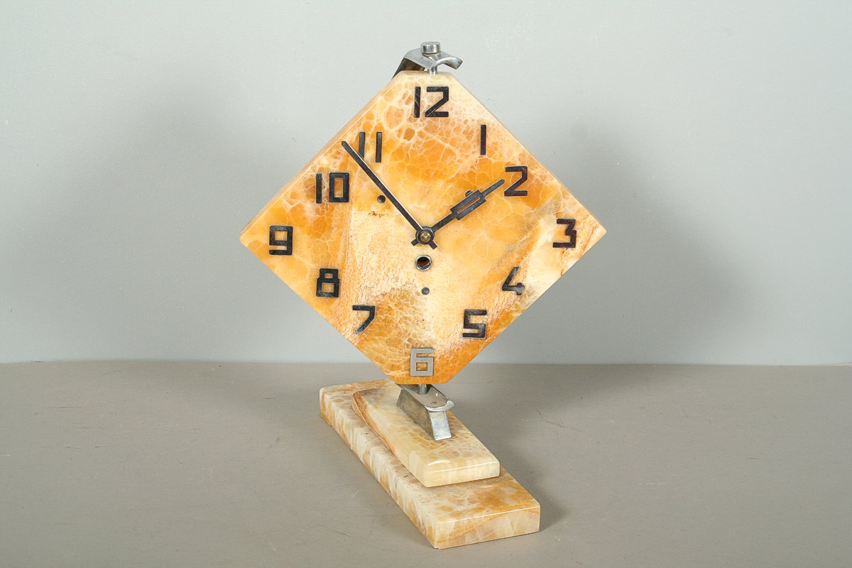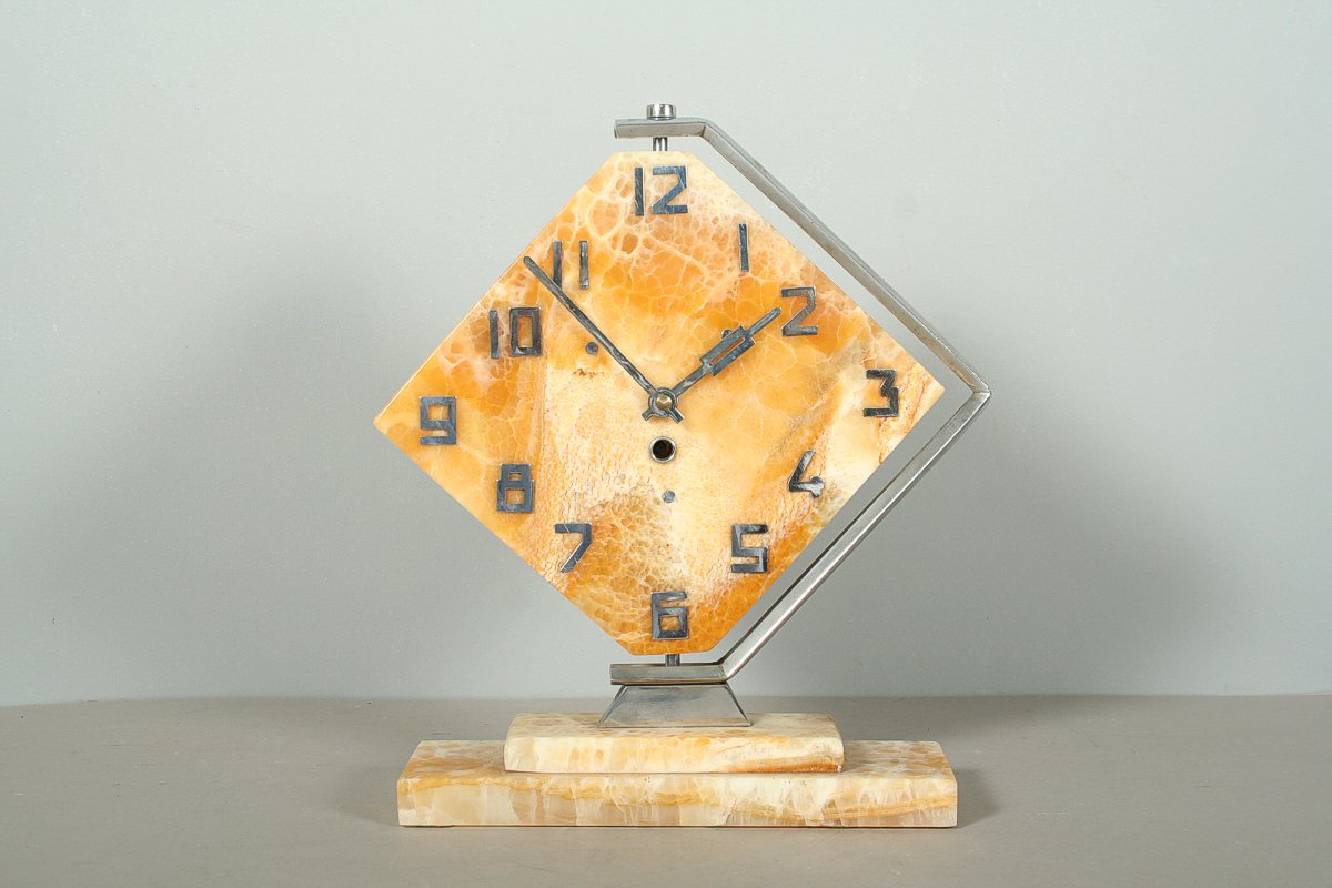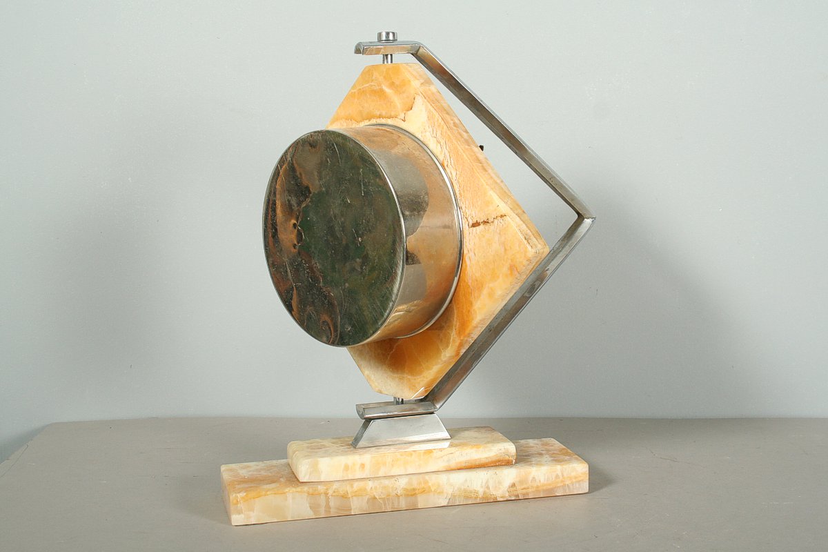 stolní hodiny z 30. let 20. století, styl art deco, onyxový ciferník (Royal Honey Onyx) v otáčivé kovové pochromované montáži, stroj pérový, značený Kinzle, 33 x 28 cm, klíček, funkční stav
