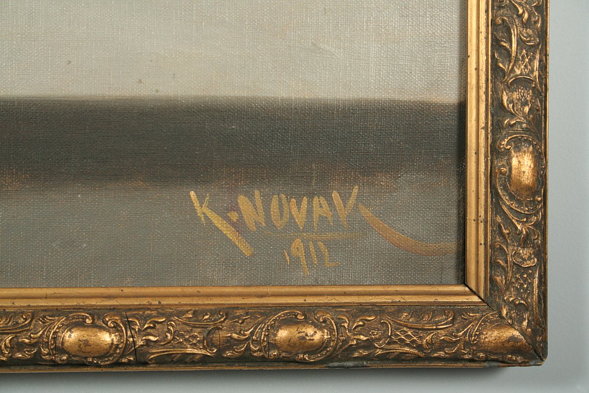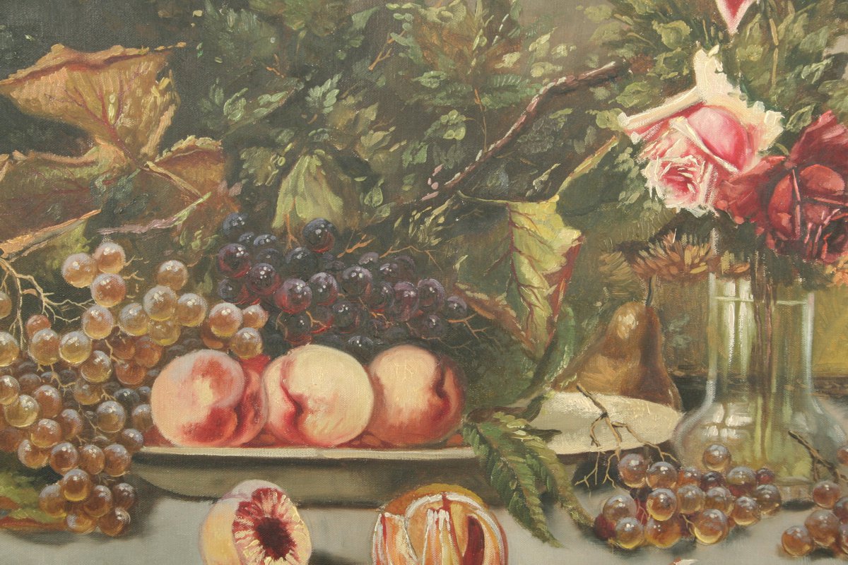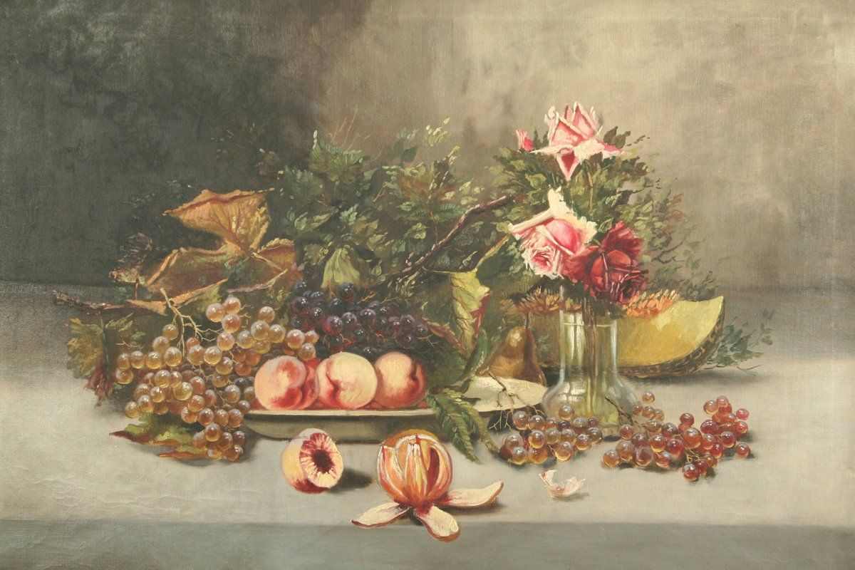 obraz zátiší s ovocem a vázou růží na stole, olej na plátně 74 x 100 cm, s rámem 80 x 106 cm, autor K. Novák, podepsáno vpravo dole K. Novák 1912, rámováno v původním zlaceném a zdobeném rámu