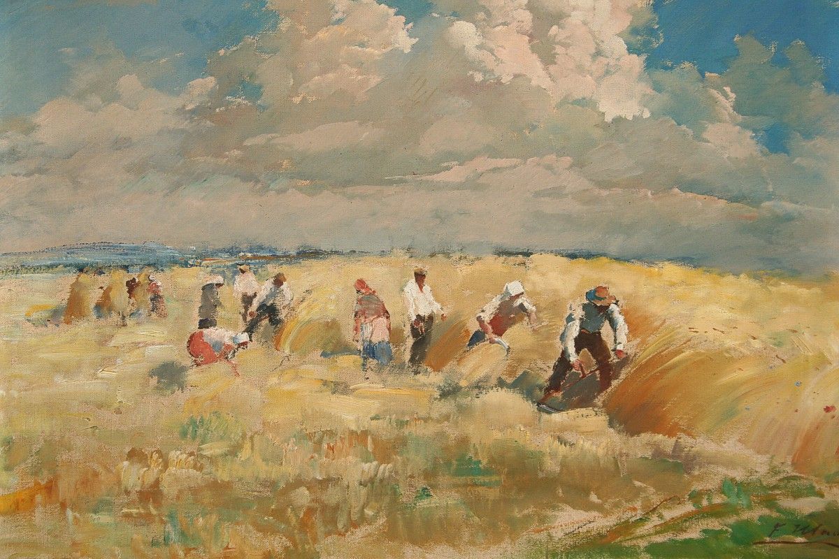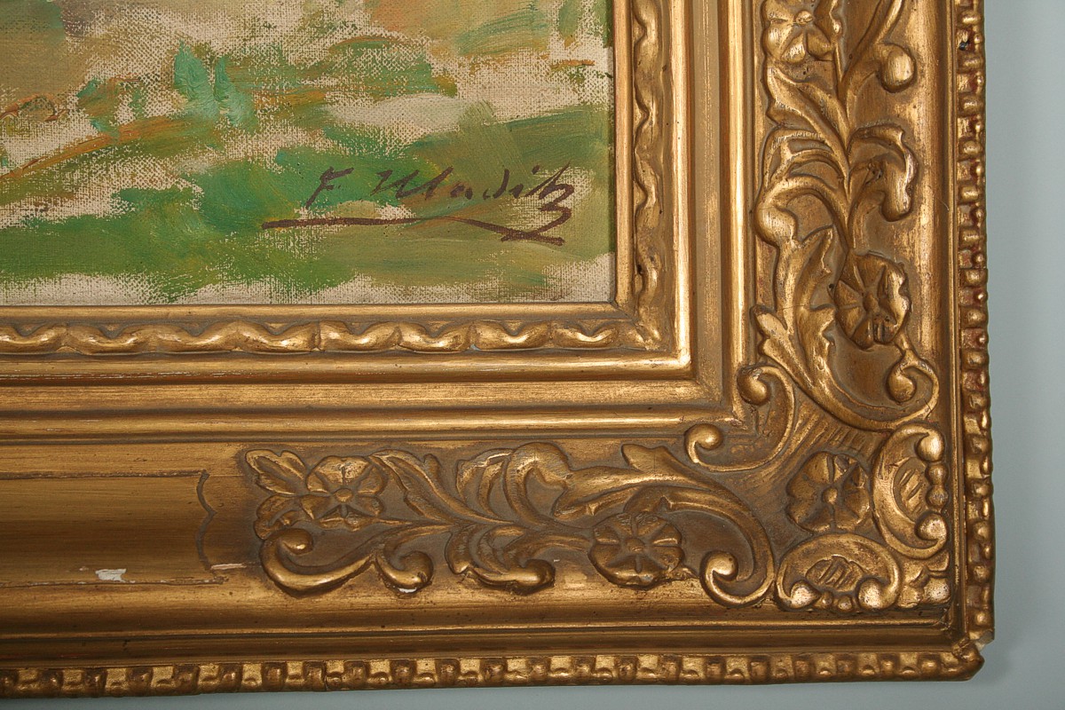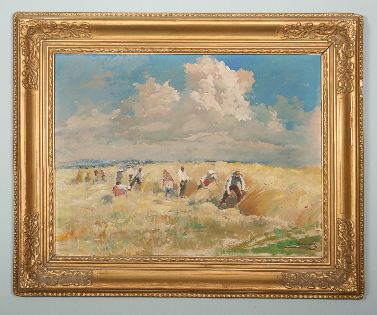 obraz letní krajiny se senosečí, olej na plátně 50 x 66 cm s rámem 70 x 85 cm, autor František Hladík, podepsáno vpravo dole F. Hladík, rámováno v původním zdobeném rámu