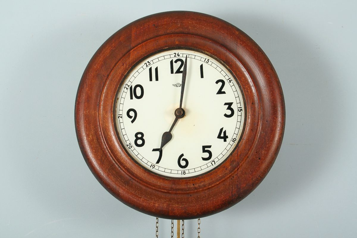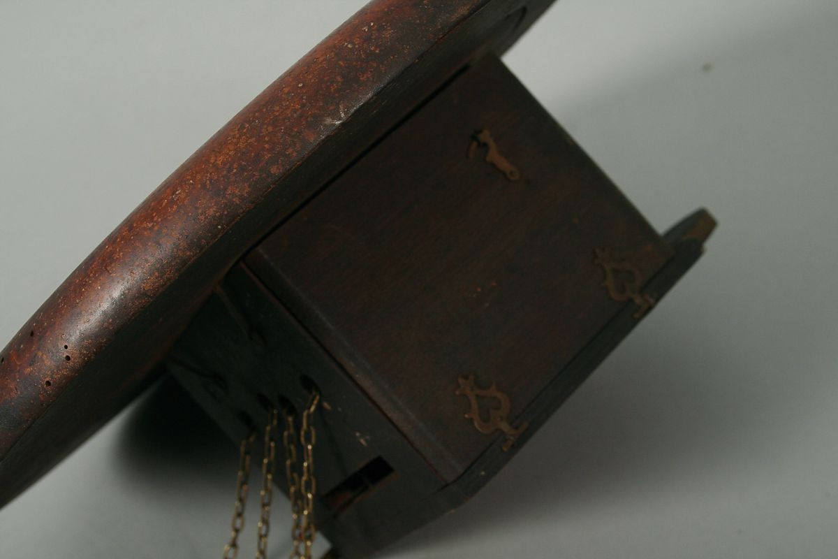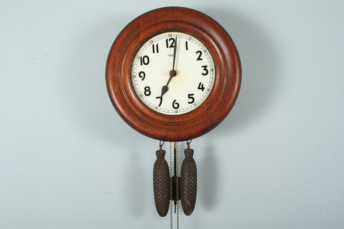 kulaté závěsné hodiny, skleněný ciferník v dřevěném rámu značený Kienzle, hodinový stroj s kyvadlem dvouzávažový s půlovým bitím do spirály, minimální staré stopy po červotoči, celkový průměr hodin 29 cm od stěny vystupují 12 cm, hodiny jsou s bočními dvířky ve funkčním stavu