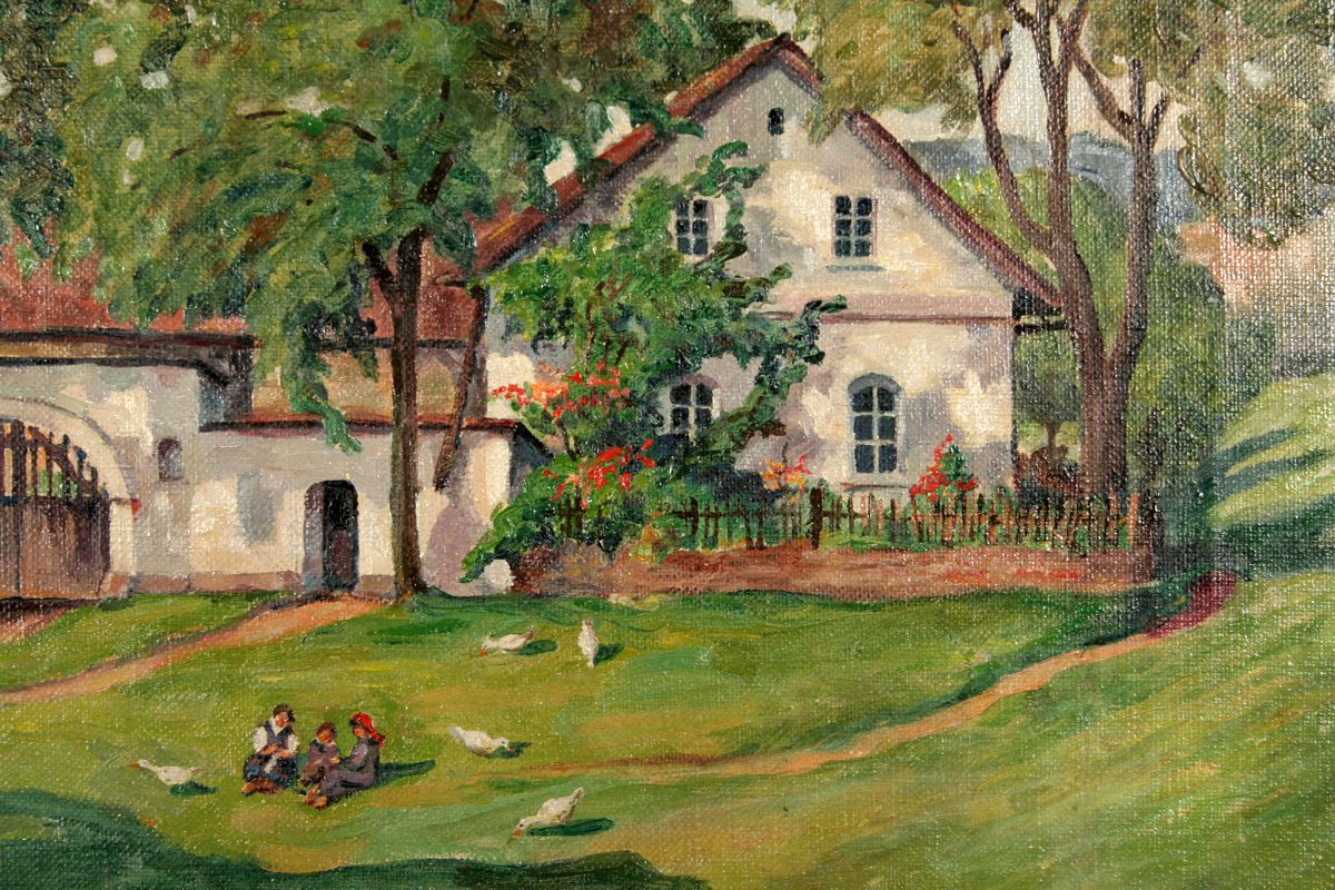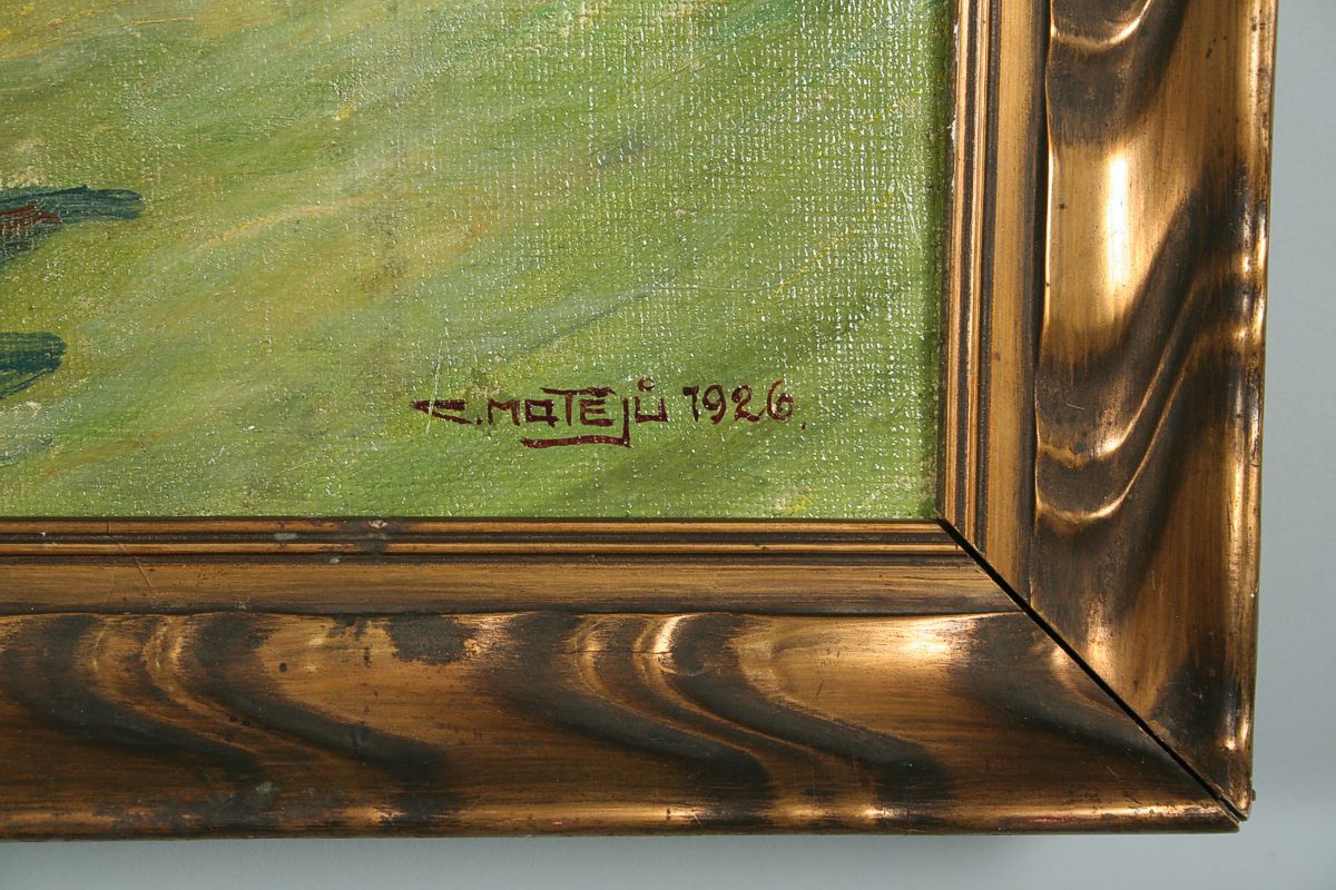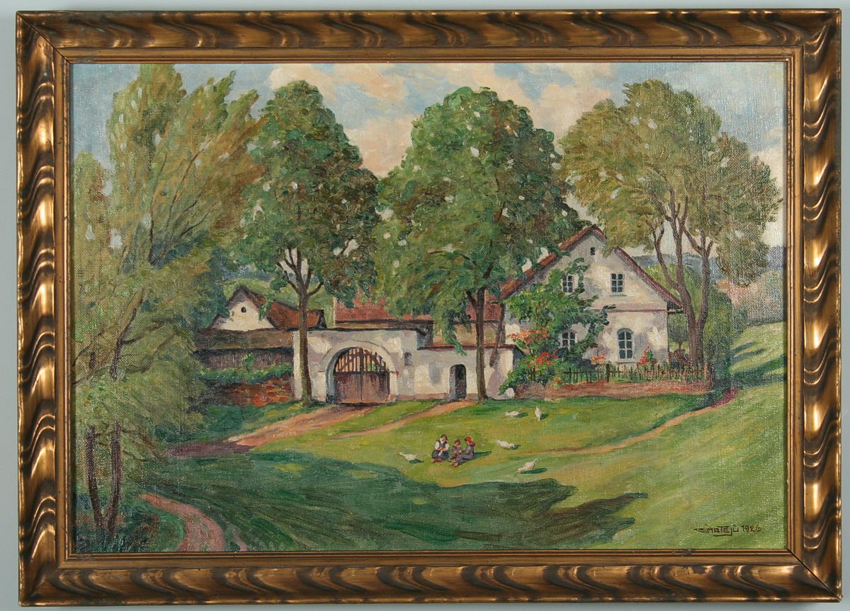 obraz veselé letní krajiny se statkem na Náchodsku a figurální stafáží hrajících si dětí, olej na plátně 40 x 57 cm, s rámem, 47 x 65 cm, autor Celestin Matějů, podepsáno vpravo dole C. Matějů 1926, rámováno v původním zlaceném rámu