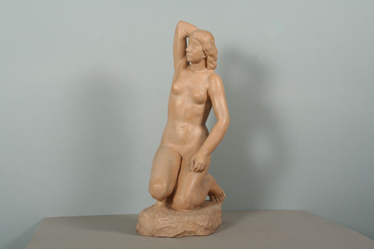 klečící dívčí akt s názvem Překvapená, autor Břetislav Benda, terakota, 56 cm, značeno na podstavci B. Benda