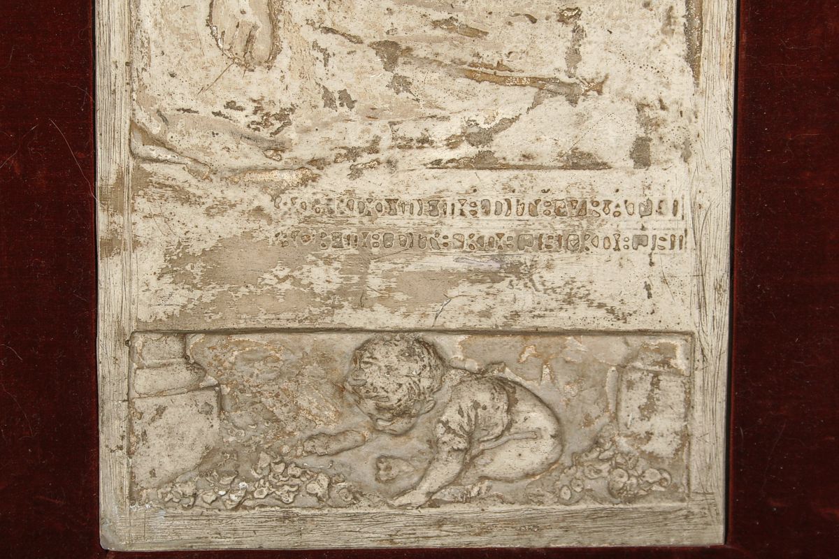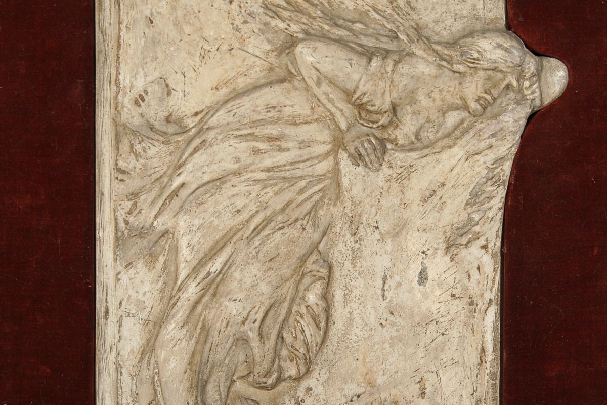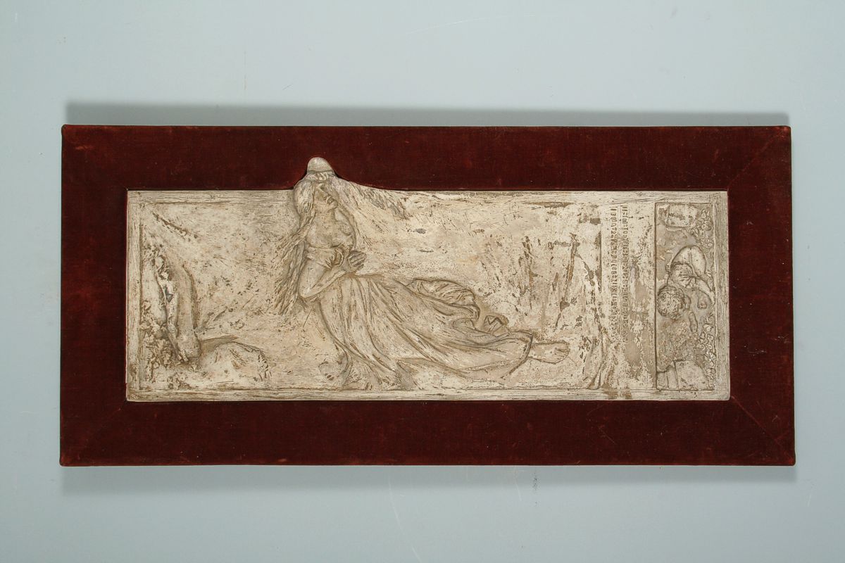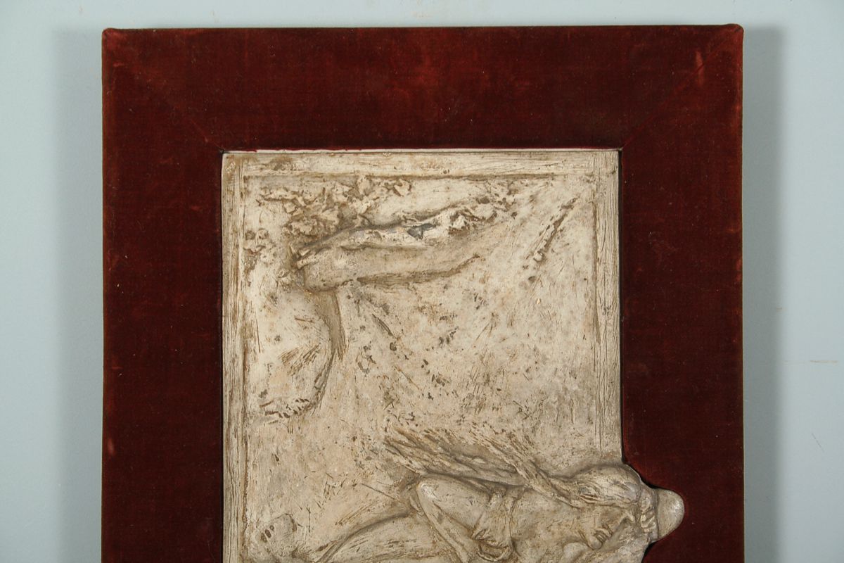 secesní reliéf s názvem Poklad, autor Stanislav Sucharda, patinovaná sádra, zcela původní adjustace, 59 x 28 cm, značeno v textu SUCHARDA