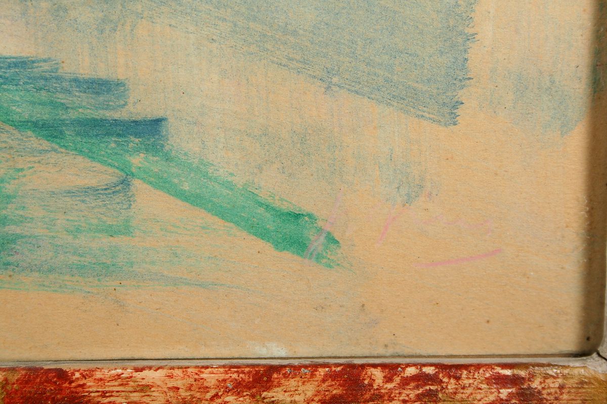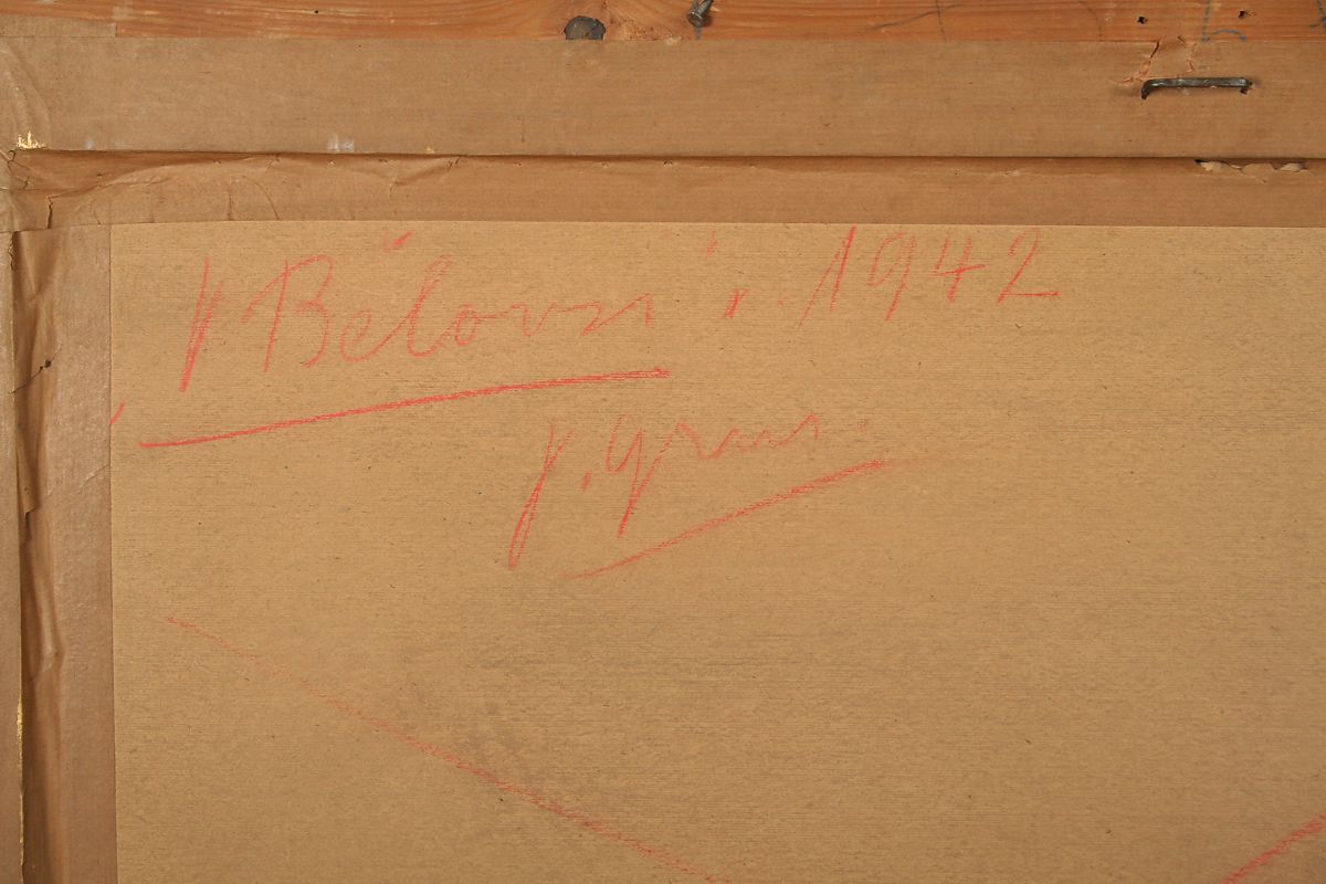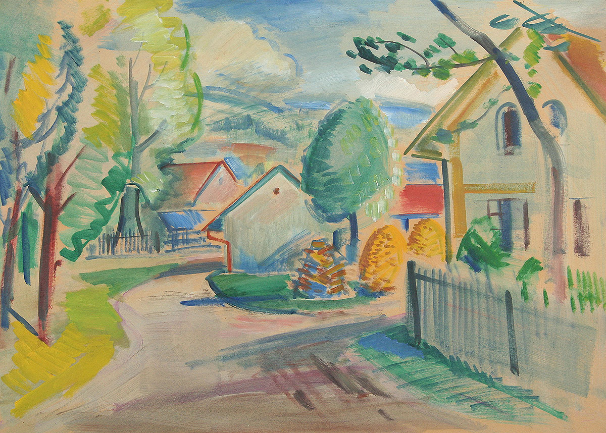 cesta s architekturou domů v Bělovsi v Náchodě, kvaš a tempera na kartonu, 48 x 69 cm s rámem 64 x 85 cm, autor Jaroslav Grus, podepsáno vpravo dole a na zadní straně autodedikace " V Bělovsi 1946 " J. Grus, obraz pochází z významné náchodské sbírky, rámováno v původním rámu pod sklem