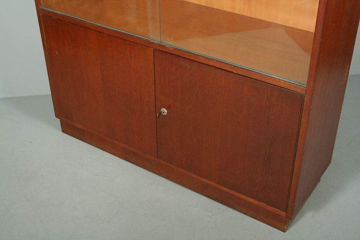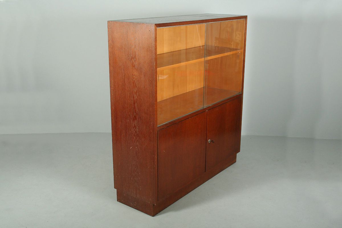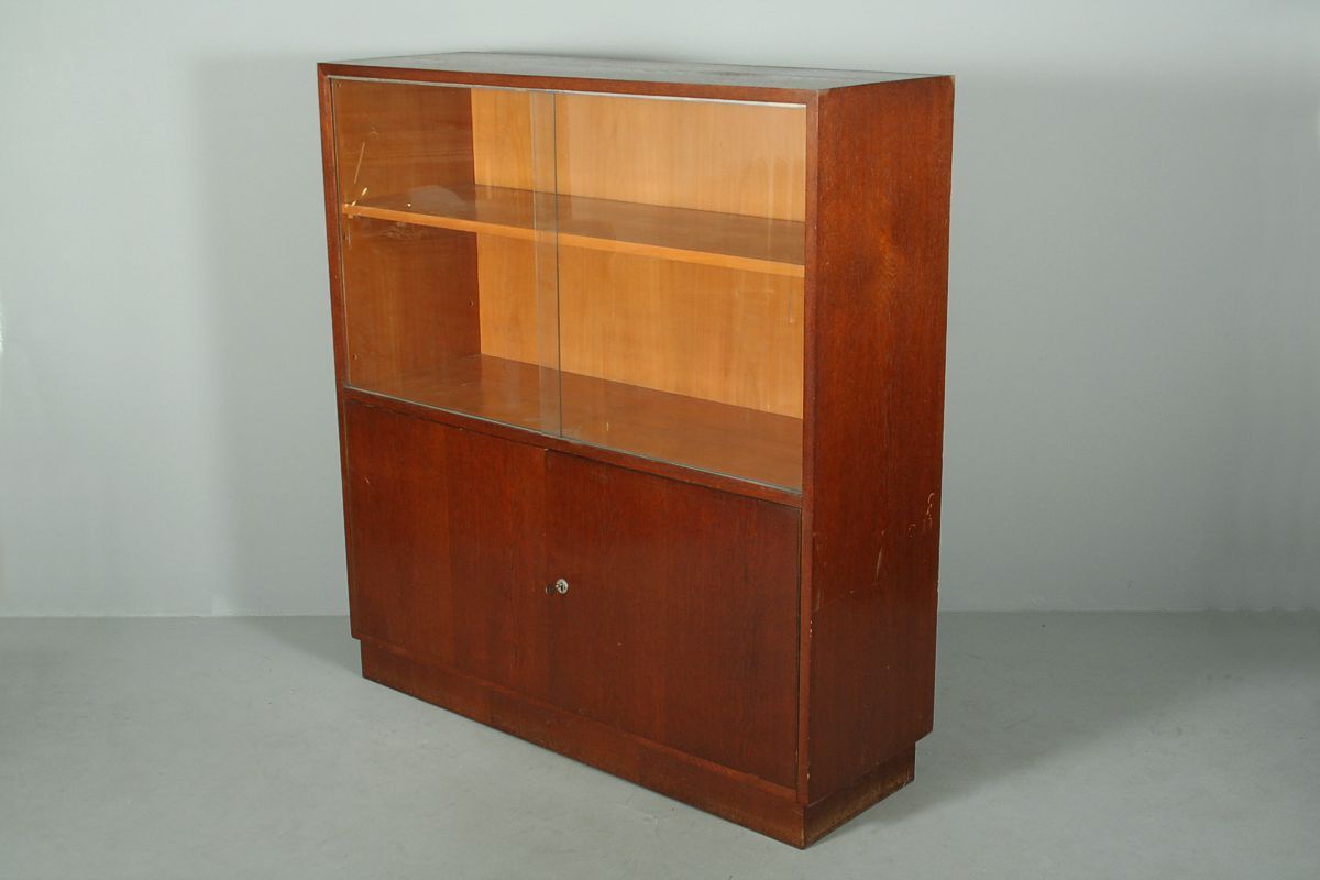 hranatá knihovna s dvířky ve spodní části a zasouvacími skly v kovových pojezdech v horní části, celá ve stylu funkcionalismu, jednoduchý a střídmý design vycházející z návrhů Jindřica Halabaly 30. léta 20. století, původní slušný stav, výška 130 x 120 x 39 cm, možno dokoupit druhou identickou knihovnu, která má v horní části stopy po jednom květináči za 2000,-Kč