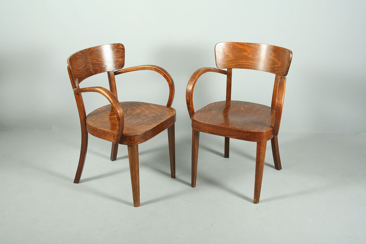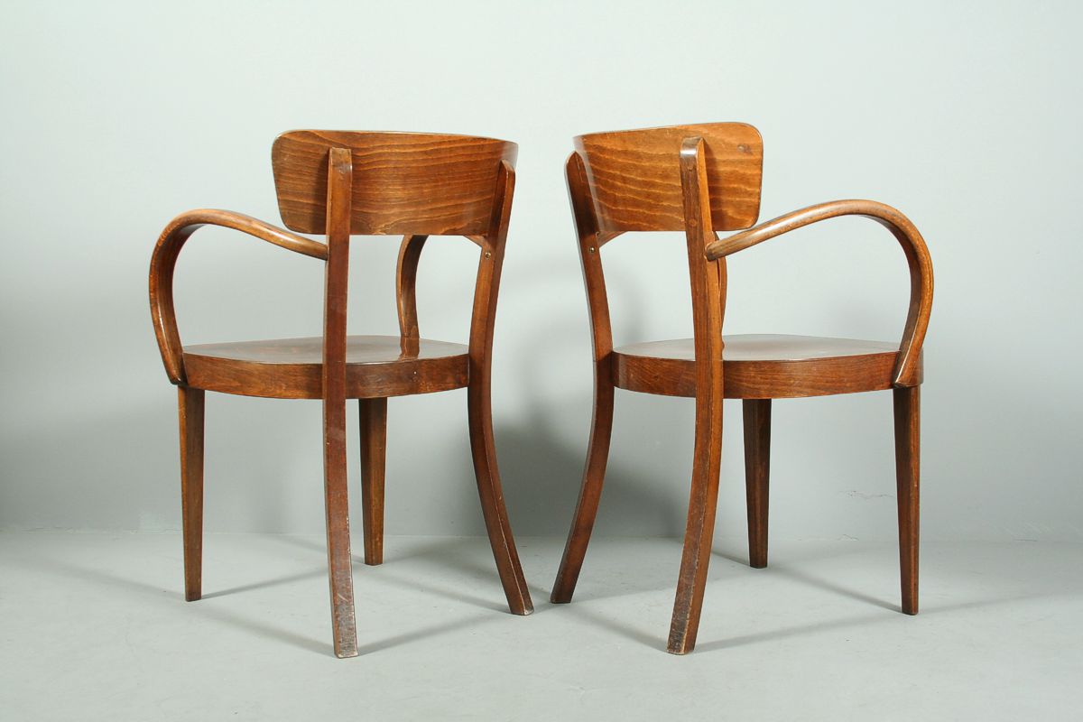 dvě celodřevěná křesílka s ohýbanými područkami, značené vinětou a vypálenou značkou výrobce Fischel, pěkný původní stav z 30. let 20. století, 80 x 57 x 57 cm, výše sedu 45 cm