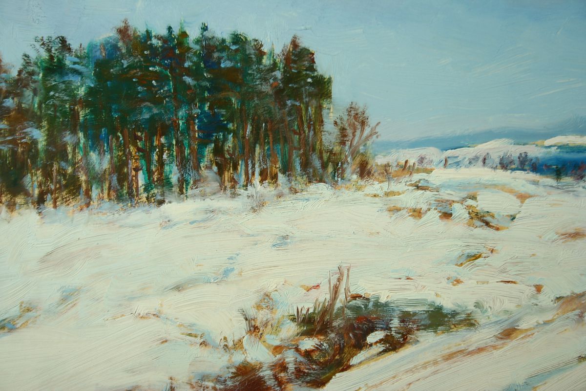 obraz zimní krajiny, olej na kartonu 34 x 49 cm, s rámem 53 x 68 cm, autor František Škrabánek, podepsáno vpravo dole F. Škrabánek, rámováno ve zlaceném rámu pod sklem