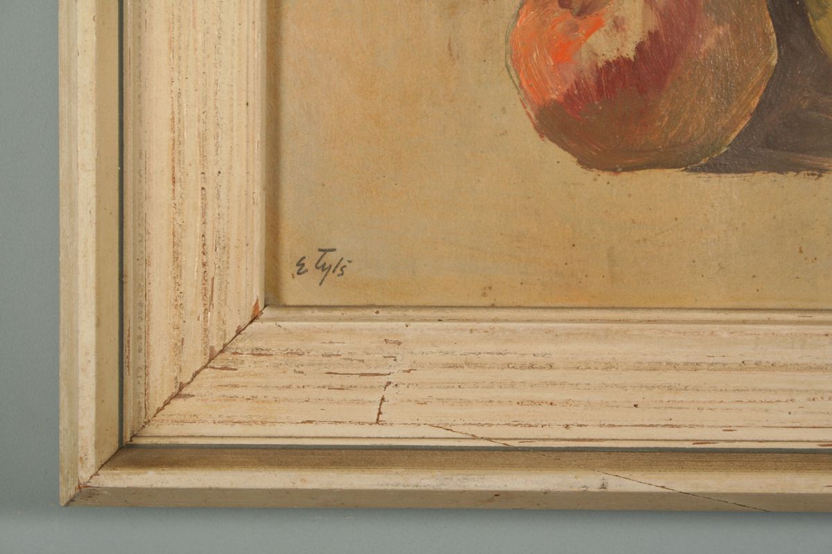 obraz zátiší s vínem jablky a hruškou, olej na lepence 34 x 50 cm s rámem 44 x 61 cm, autor Emil Tylš, podepsáno vlevo dole E. Tylš, rámováno