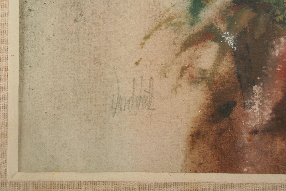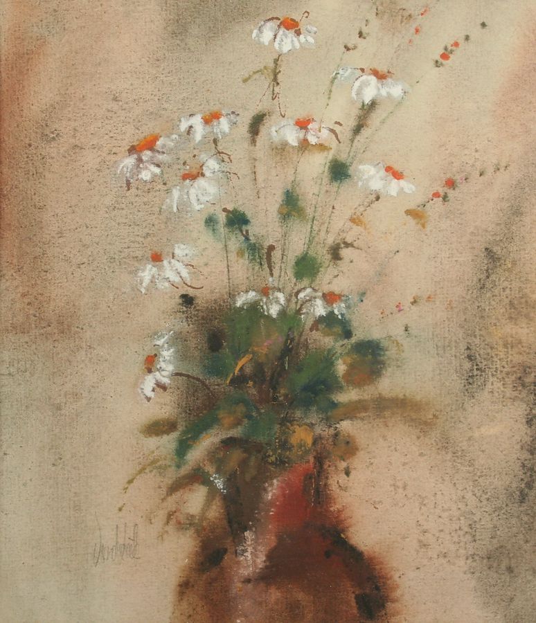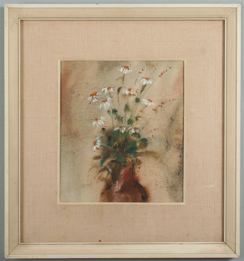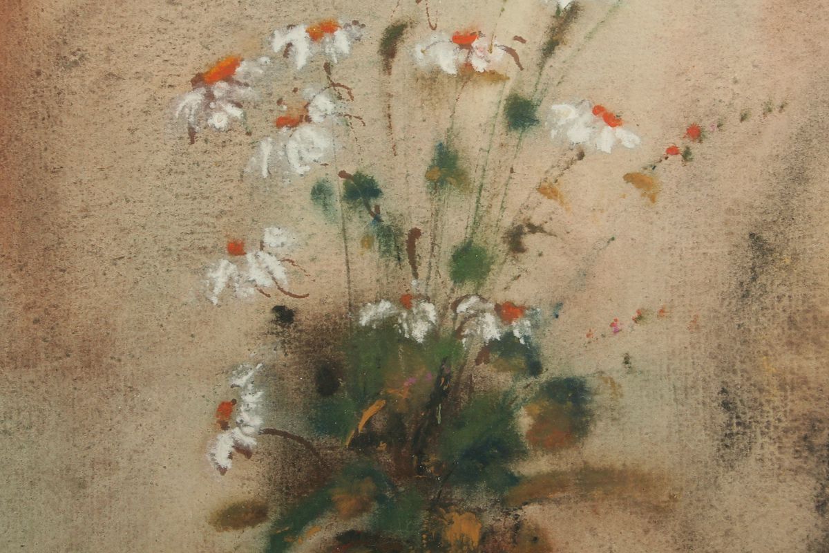 obraz luční kytice ve váze, kvaš na papíře 24 x 21 cm s rámem 43 x 40 cm, autor Josef Vondráček, podepsáno vlevo dole tužkou Vondráček (synem), rámováno v paspartě a rámu pod sklem