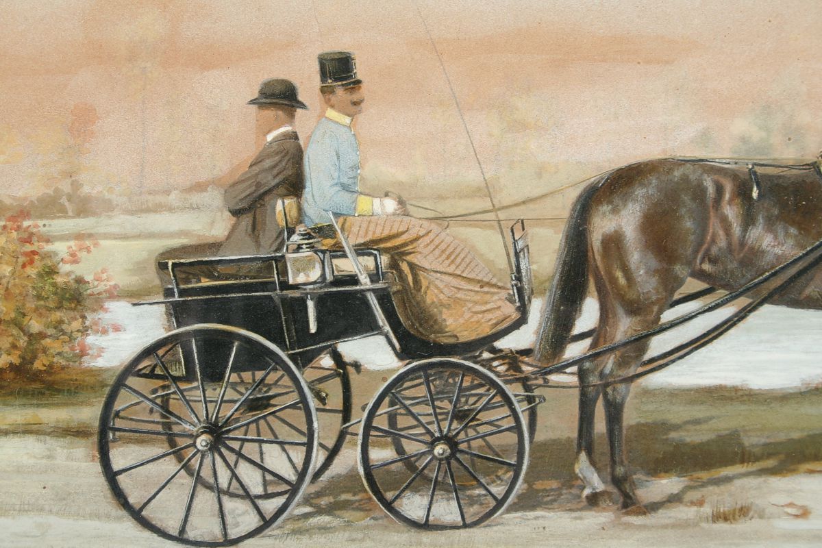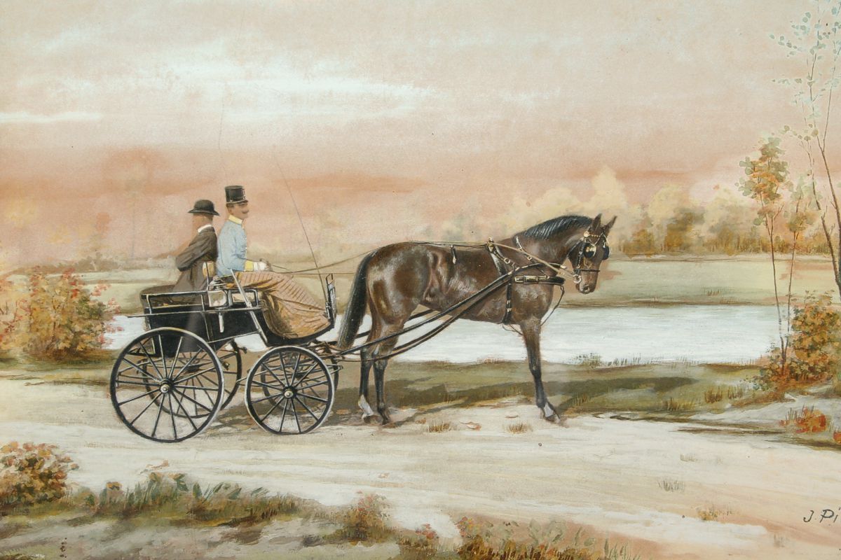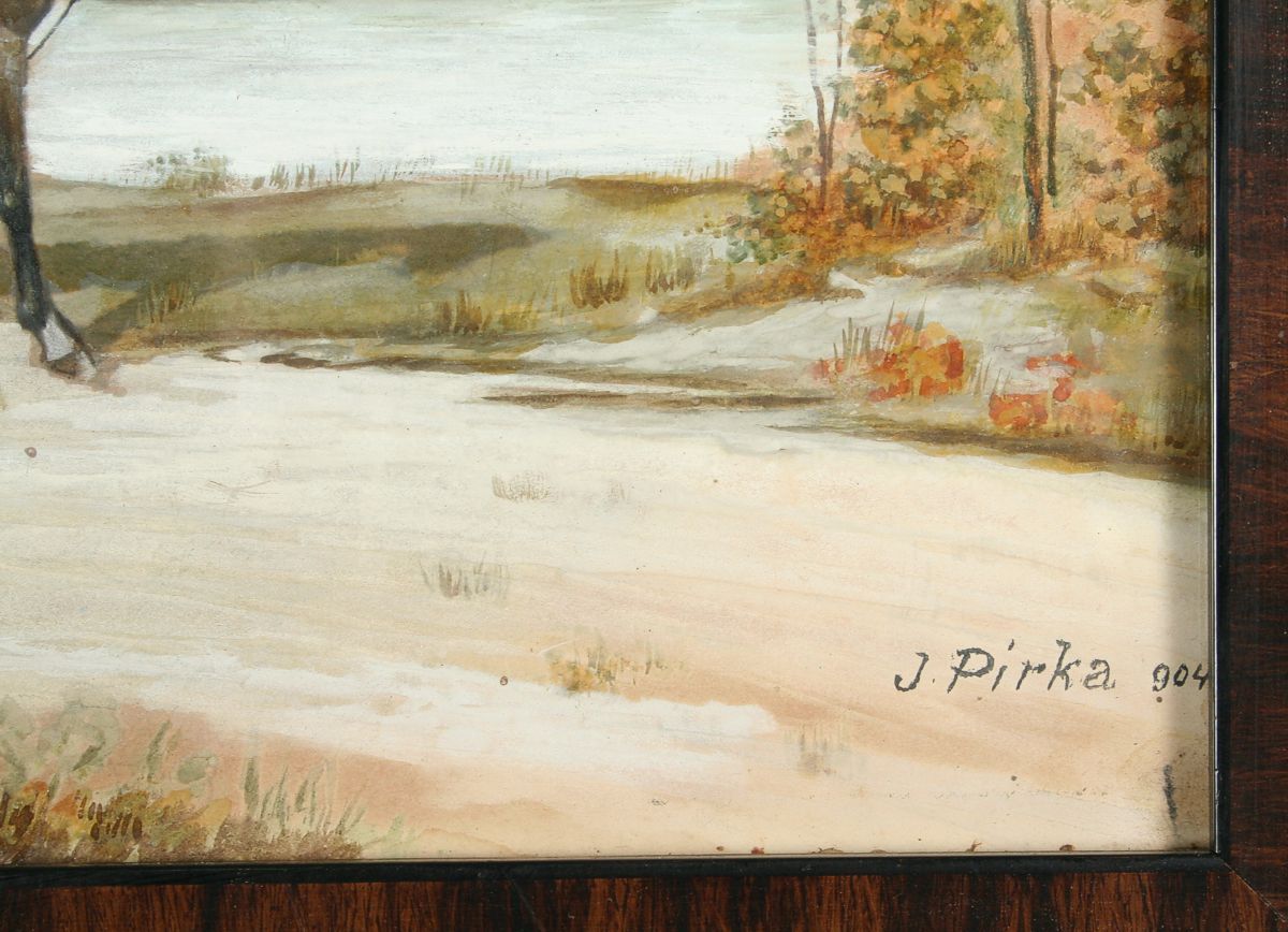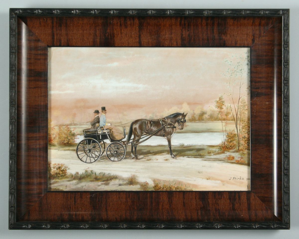 obraz z roku 1904 arcivévoda František Ferdinand de Este při vyjížďce do okolí Konopiště, kvaš na lepence, 22 x 30 cm s rámem 32 x 41 cm, autor J. Pírka, podepsáno vpravo dole J. Pírka 904, na zadní straně rozsáhlý přípis "...... arcivévoda František Ferdinand de Este při vyjížďce do okolí Konopiště...... ", rámováno pod sklem