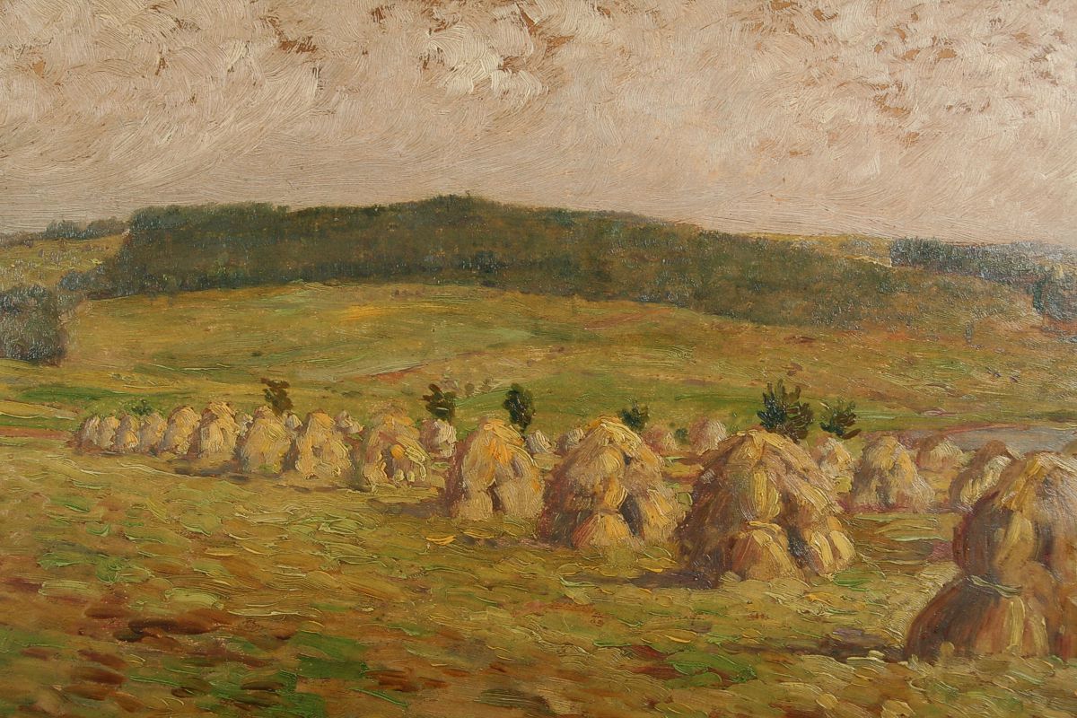 obraz letní krajiny s panáky a lesem, olej na kartonu 32 x 43 cm s rámem 42 x 54 cm, autor Karel Beneš, podepsáno vpravo dole K. Beneš a na zadní straně autorský přípis 1916, rámováno