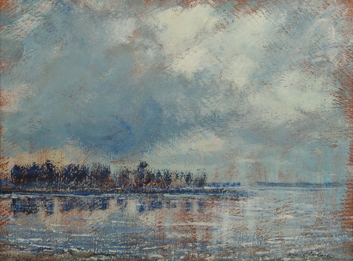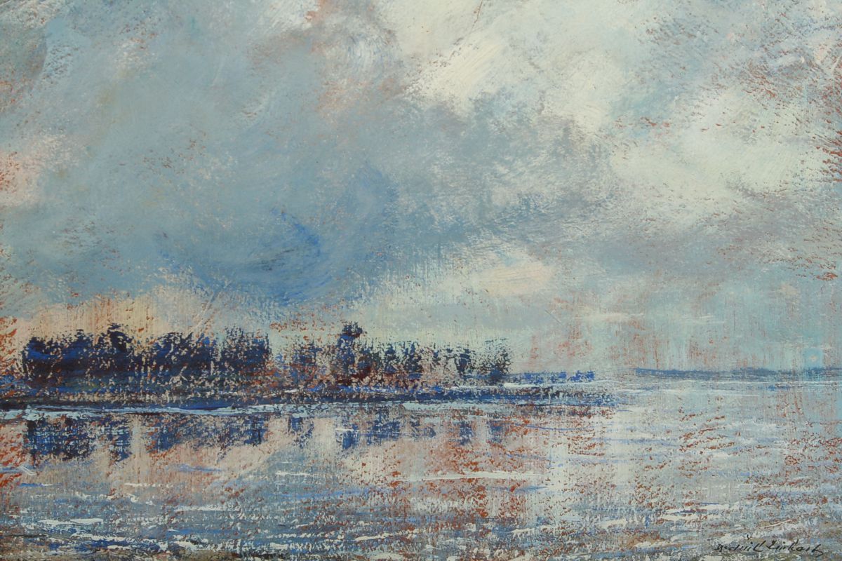 obraz krajiny s vodní nádrží Rozkoš, olej na lepence, lepenka 29 x 39 s rámem 41 x 51 cm, podepsáno vpravo dole Bedřich Linhart, rámováno v původním rámu pod sklem
