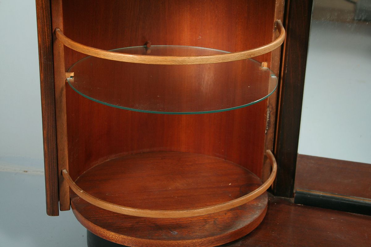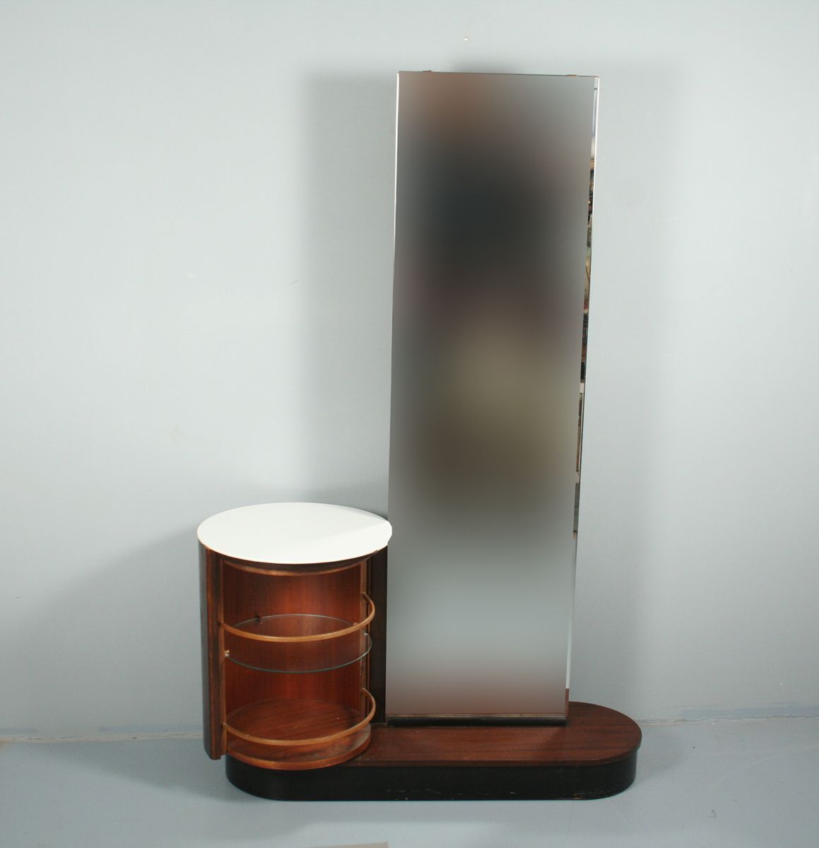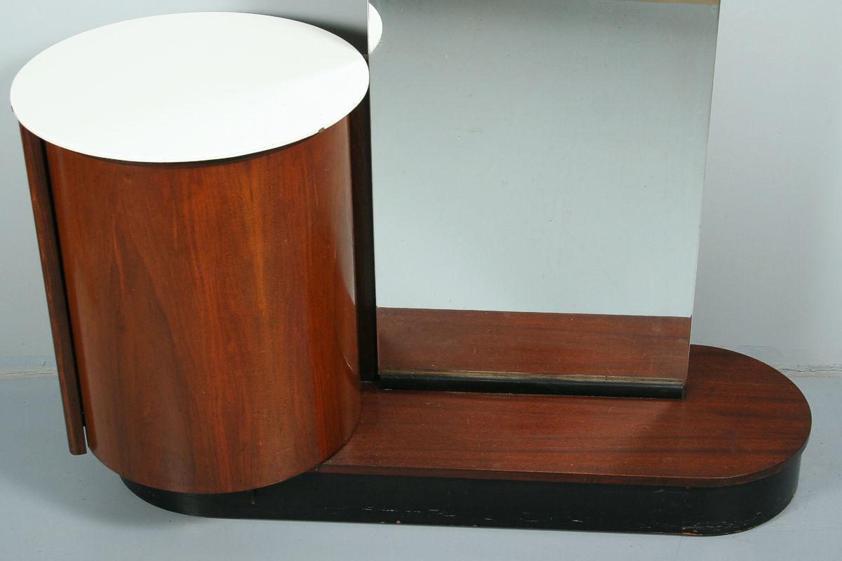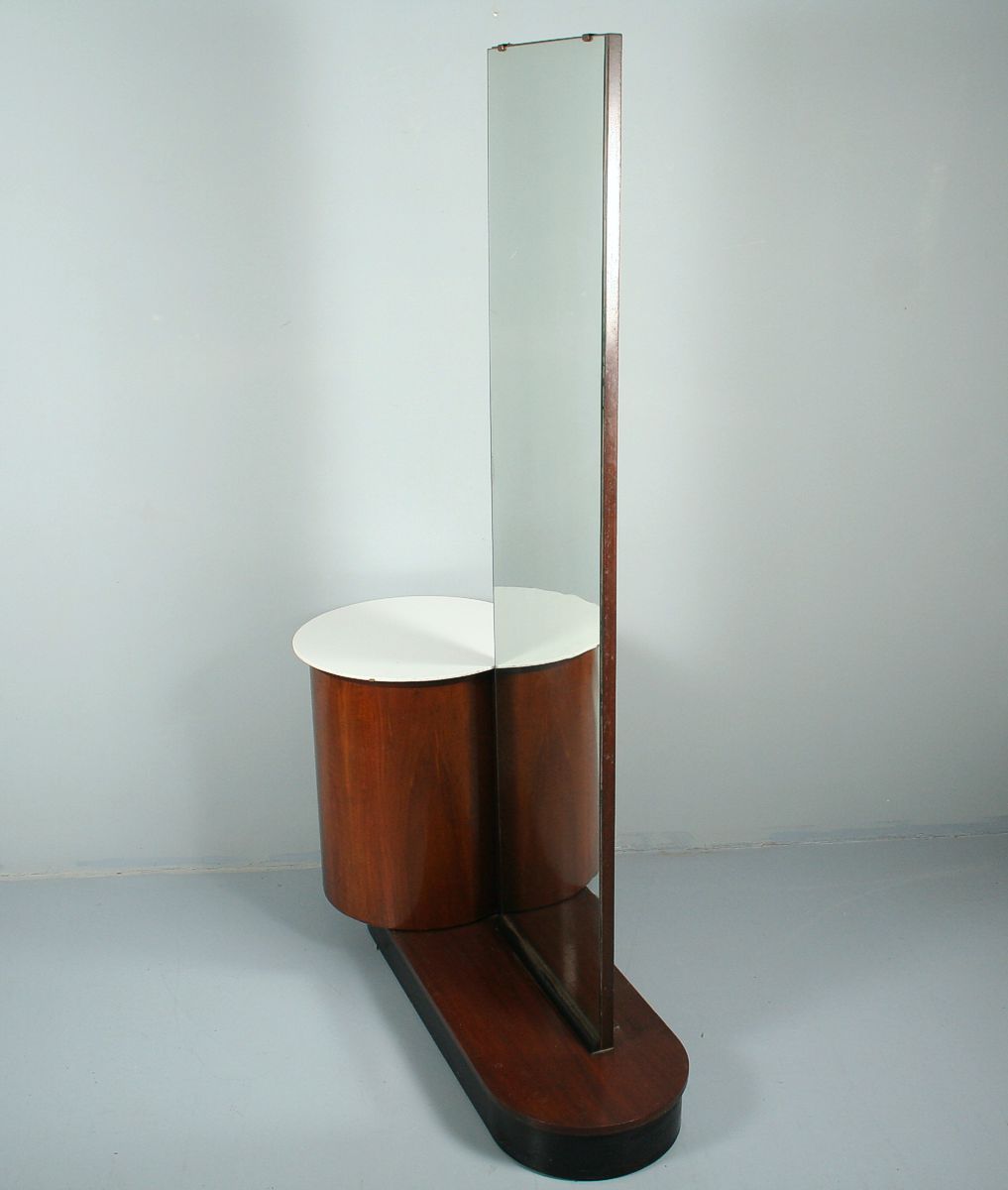 toaletka se zrcadlem a otočnou sříňkou, ořechová dýha, lehce fasetované původní zrcadlo, opaxitové bílé kulaté sklo, otvírání otáčením, uvnitř skleněná police, zcela původní stav, autor návrhu pro Spojené UP závody Jindřich Halabala, výška celkem 166 cm, šíře 107 cm, Φ opaxitového skla 45 cm, šíře zrcadla 44,5 cm