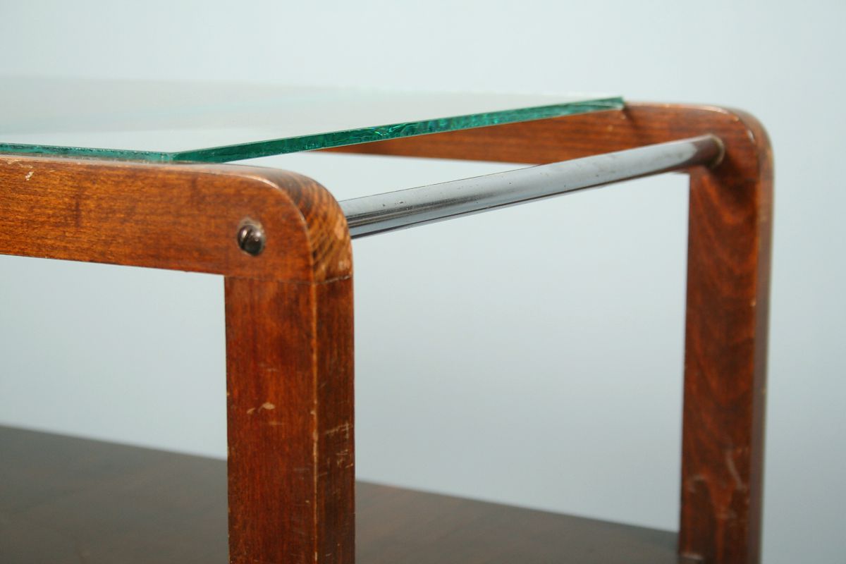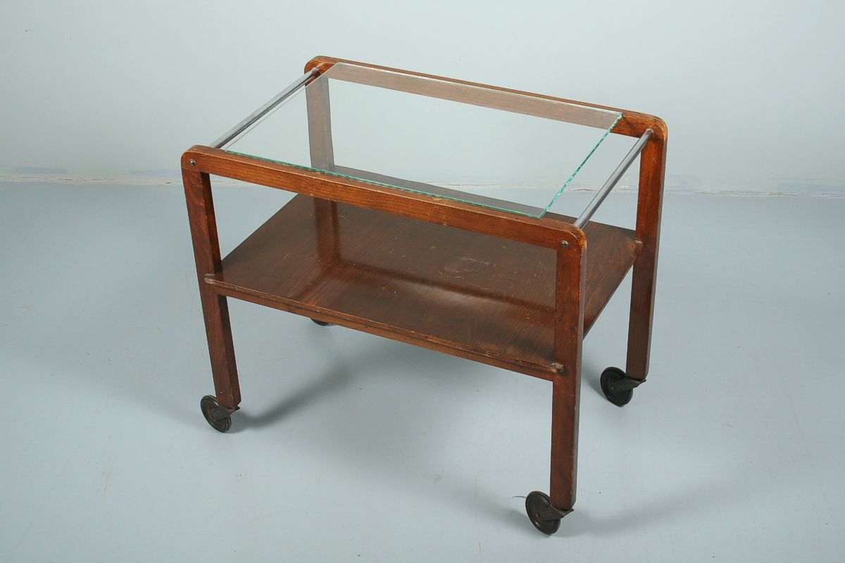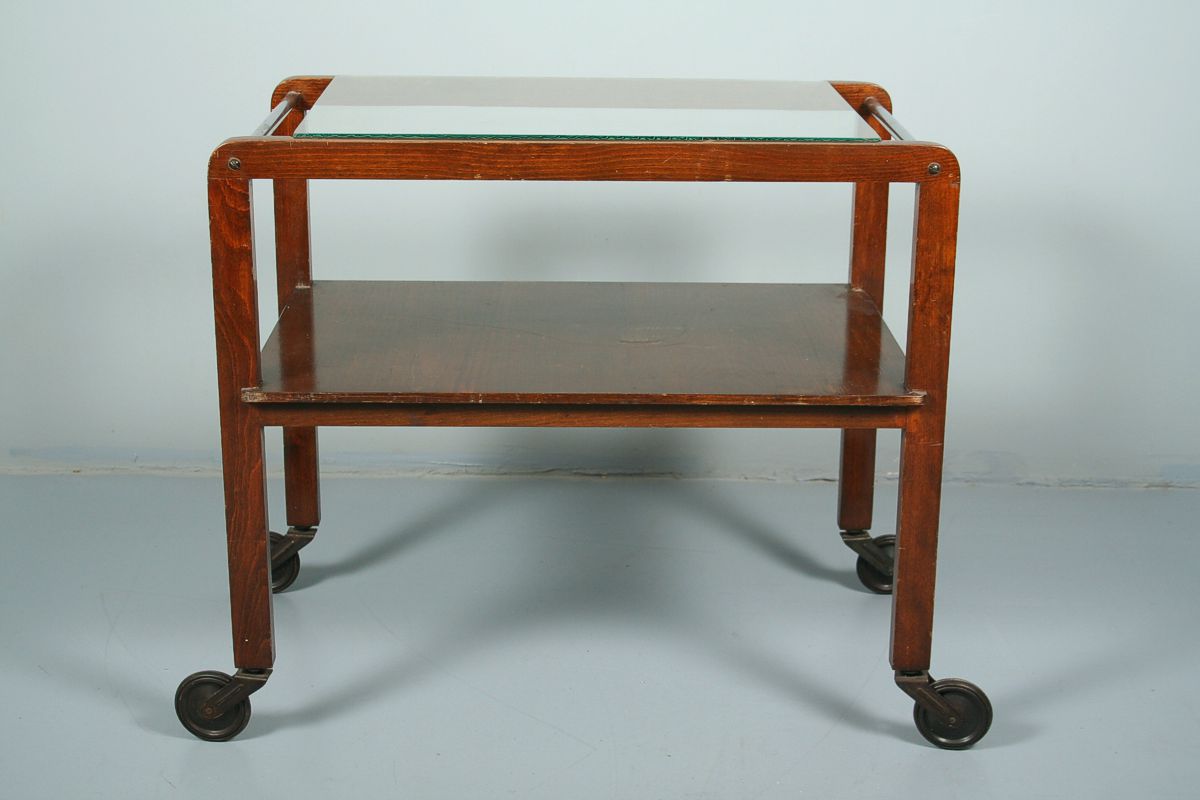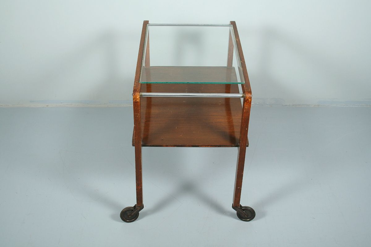 servírovací stolek na čtyřech nožkách s otočnými kolečky, skleněná deska zasazená do lakovaného dřeva, chromované prvky, skvěle vede trajektorii posuvu, zcela původní stav, na spodní desce zbytek viněty Thonet, 58 x 65 x 42 cm