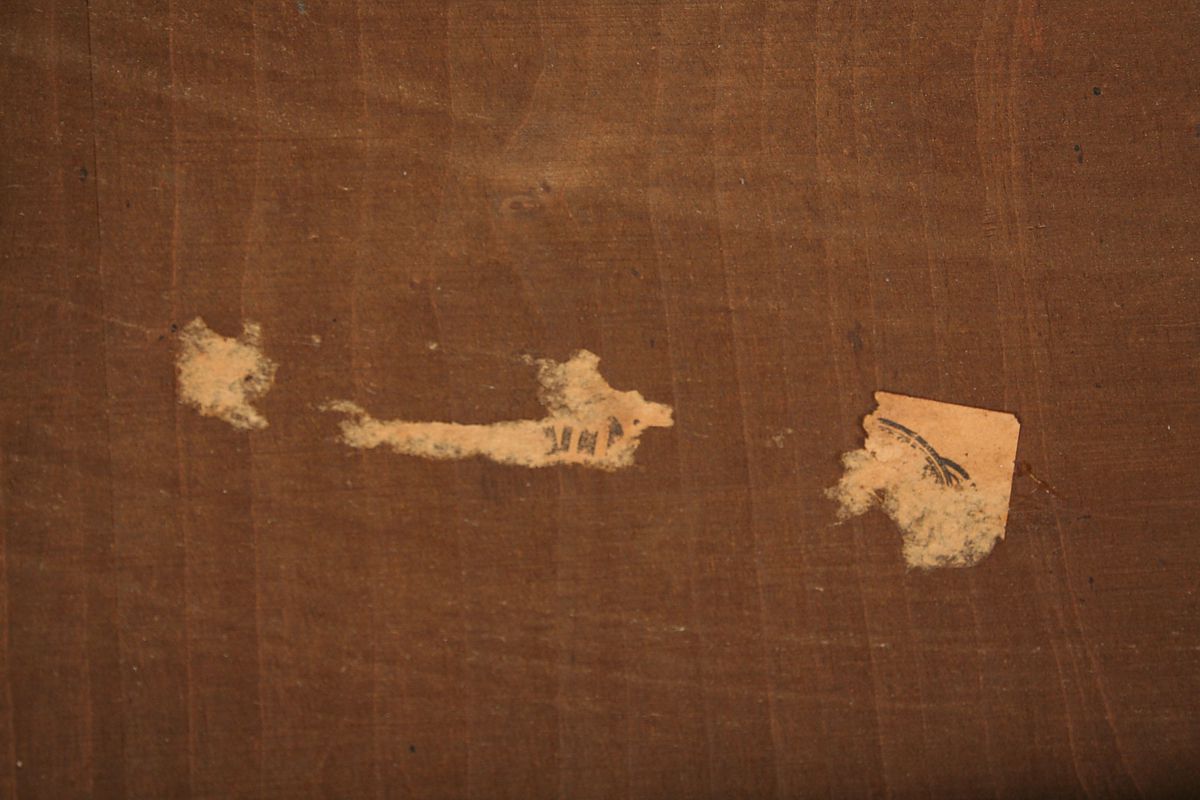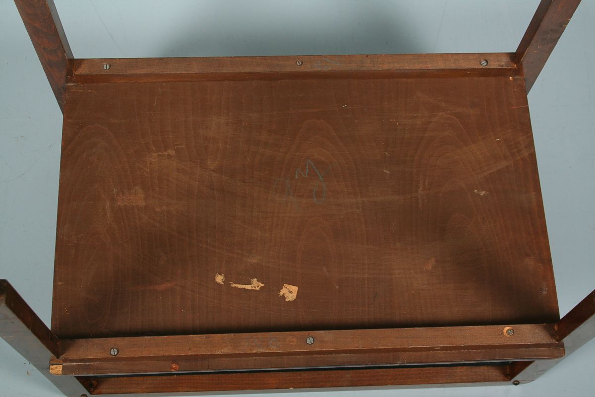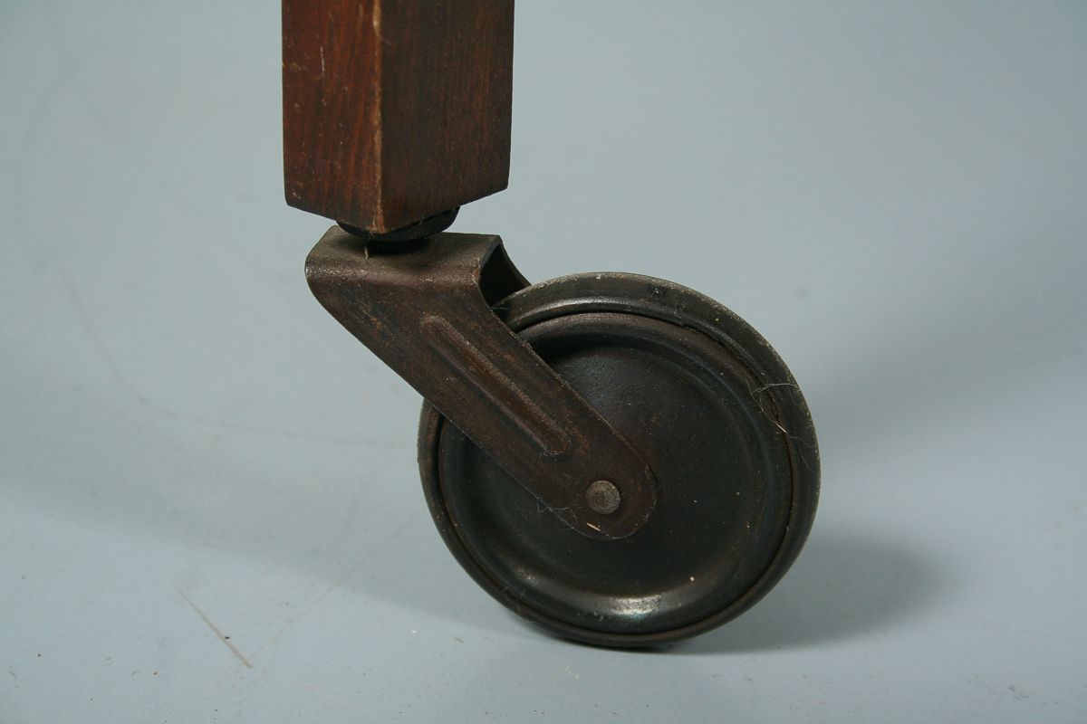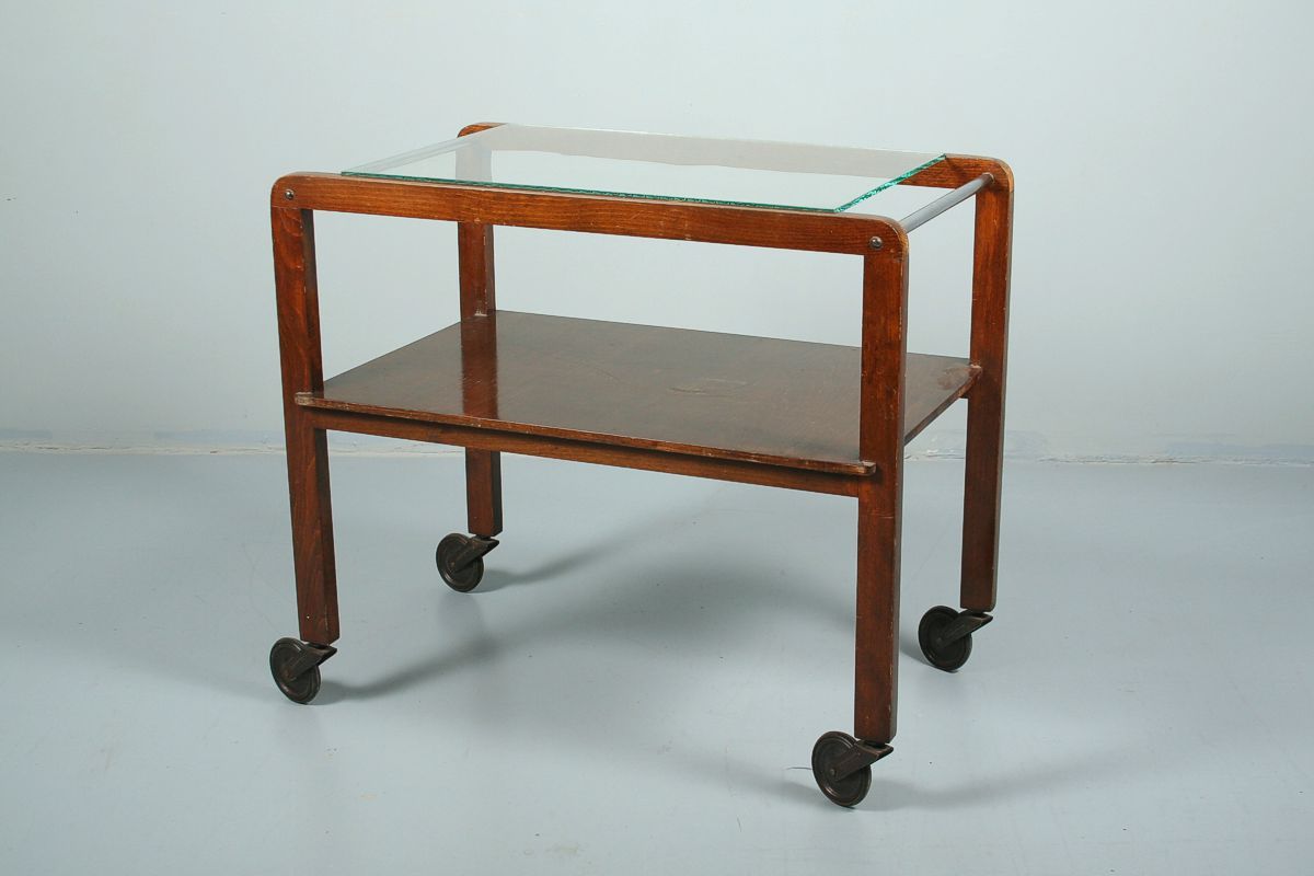 servírovací stolek na čtyřech nožkách s otočnými kolečky, skleněná deska zasazená do lakovaného dřeva, chromované prvky, skvěle vede trajektorii posuvu, zcela původní stav, na spodní desce zbytek viněty Thonet, 58 x 65 x 42 cm