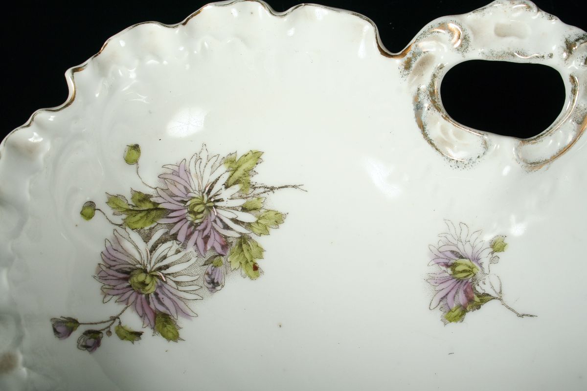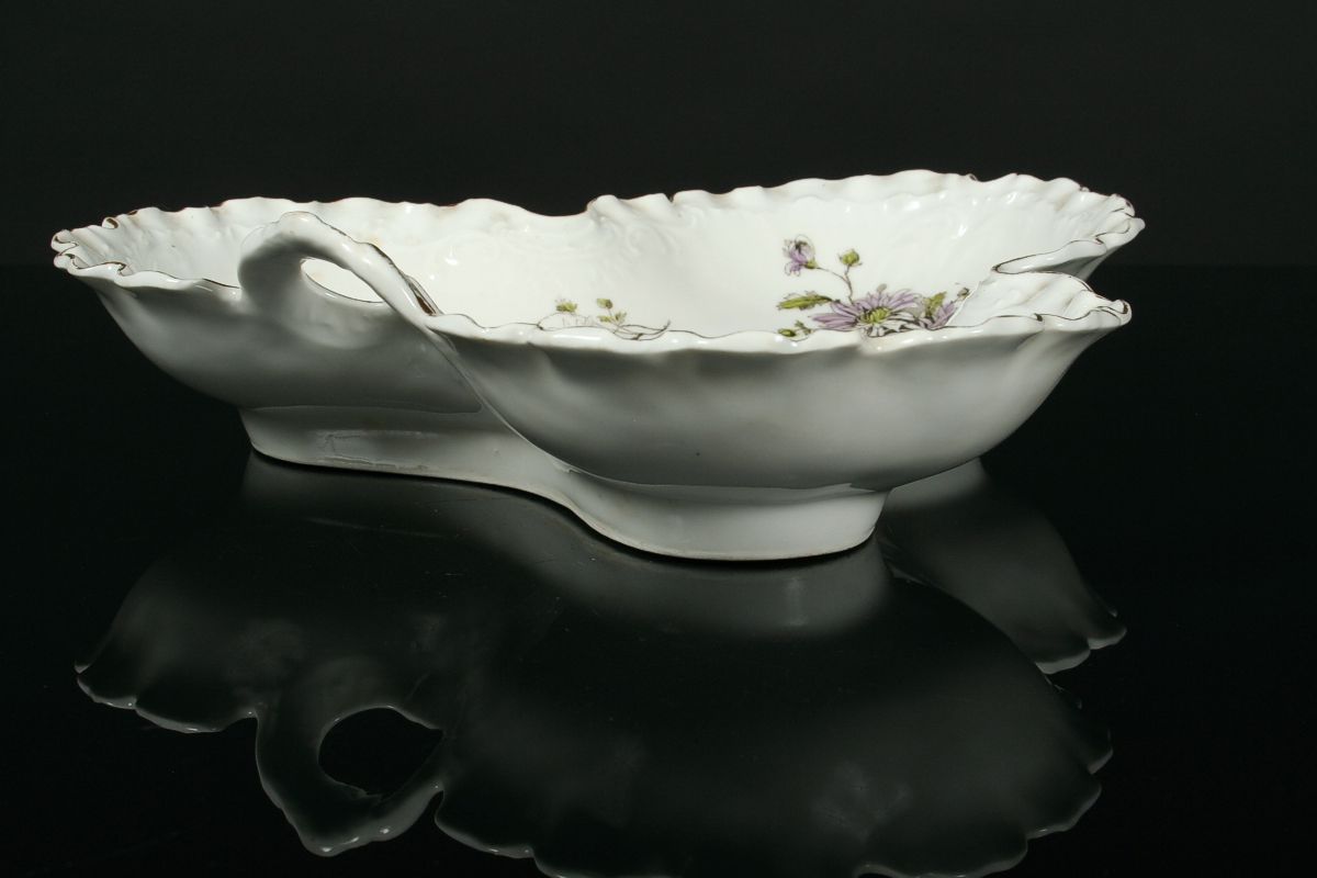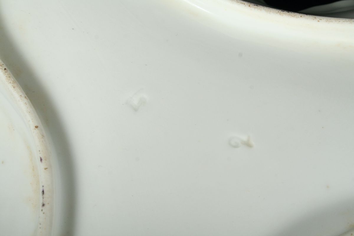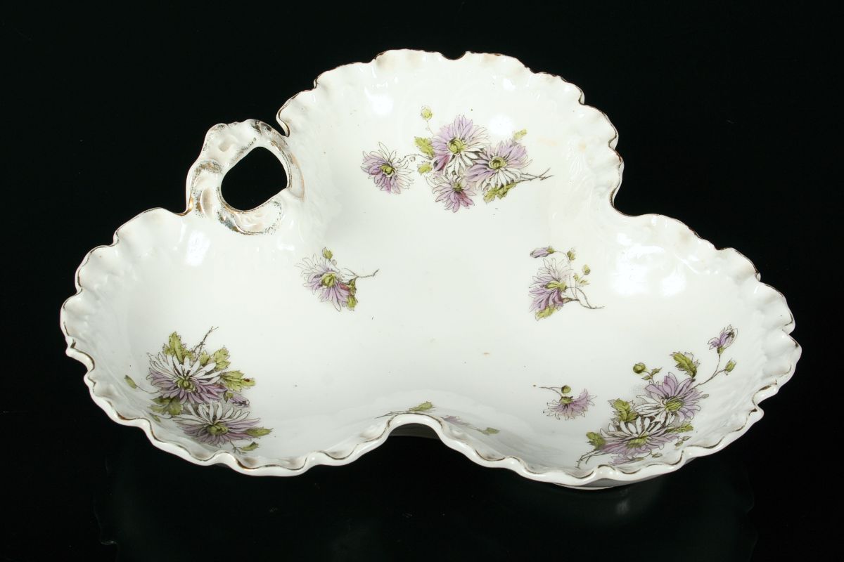 ozdobná mísa s ouškem, bílý glasovaný porcelán po obvodu zvlněný, jemný reliéfní a malovaný dekor rokajů a květin, značeno tlačenou značkou Loket 2. polovina 19. století, 29 x 30 x 7,5 cm