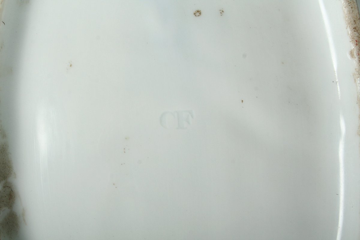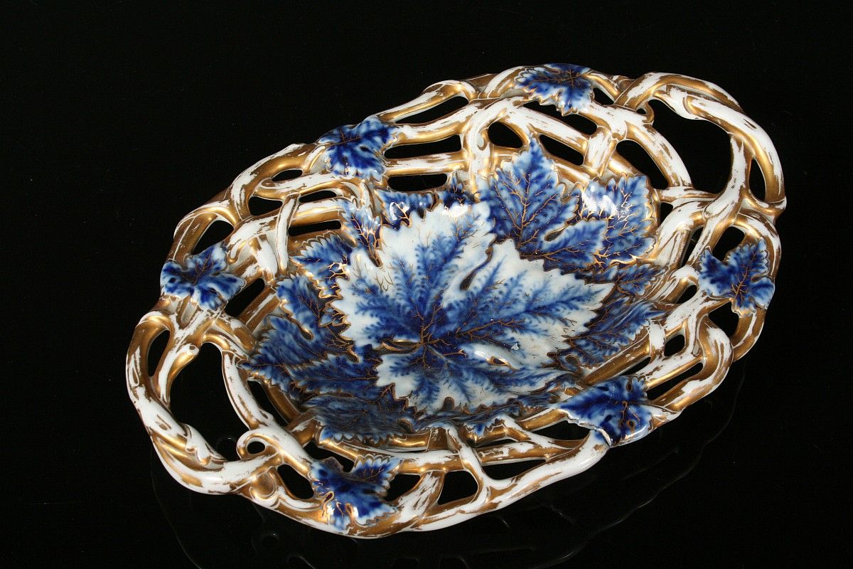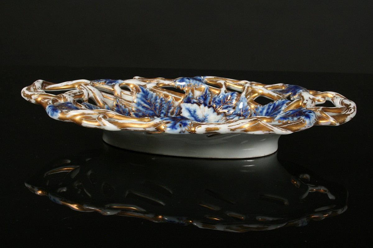ozdobná mísa na ovoce, ve tvaru propletené vinné révy, kobaltem malovaný porcelán, zlacené detaily, značeno na dně tlačenou značkou CF Cristian Fischer, Březová 1846-1853, 31 x 21 x 5 cm