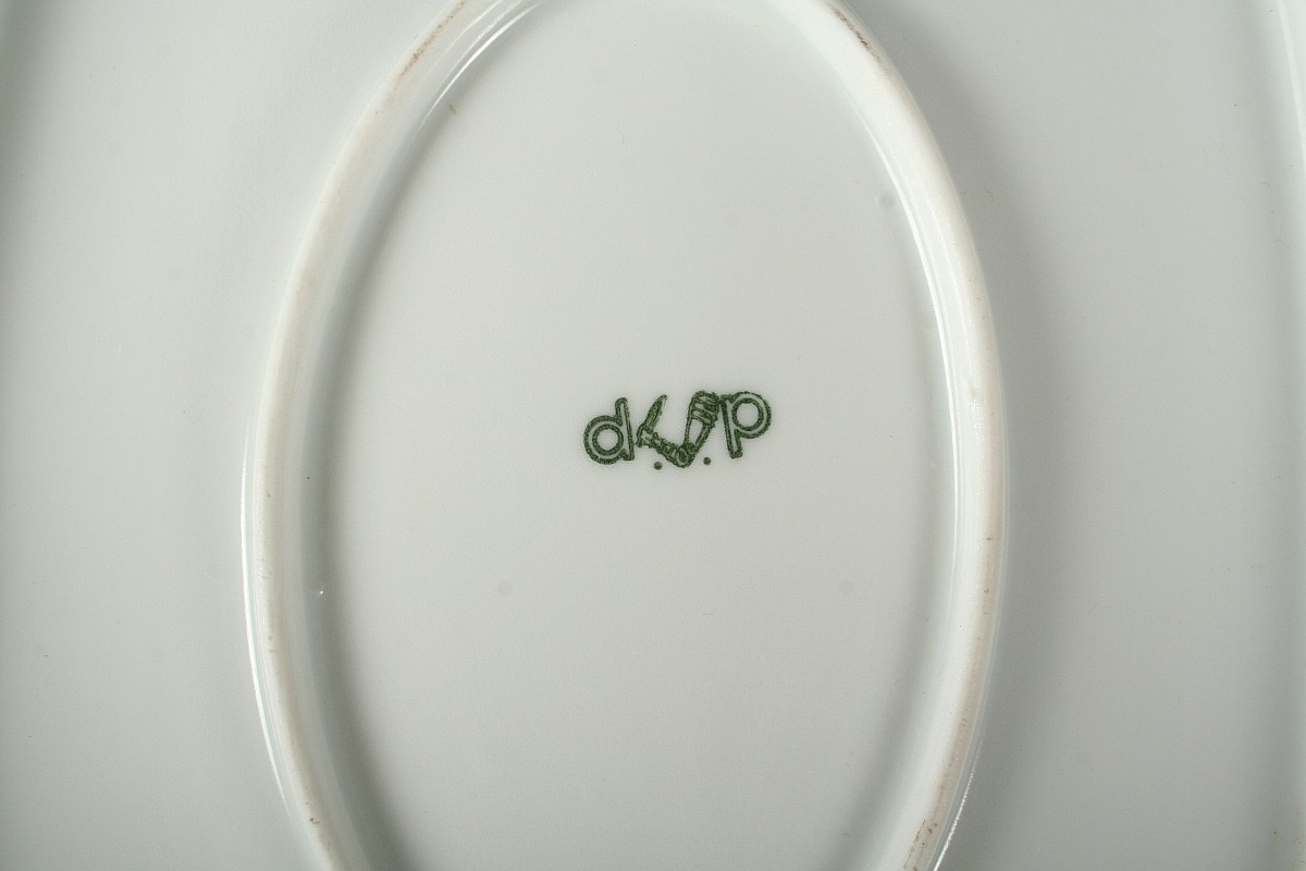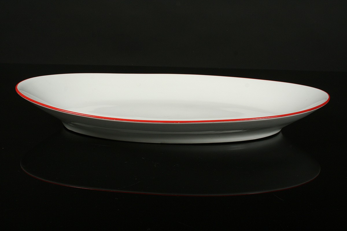 velký oválný talíř na rybu k jídelnímu servisu od známého autora českého designu Ladislava Sutnara, z bélého tenkého porcelánu s črvenou linkou po obvodu, značeno tištěnou značkou DP Loket, 40 x 25 cm