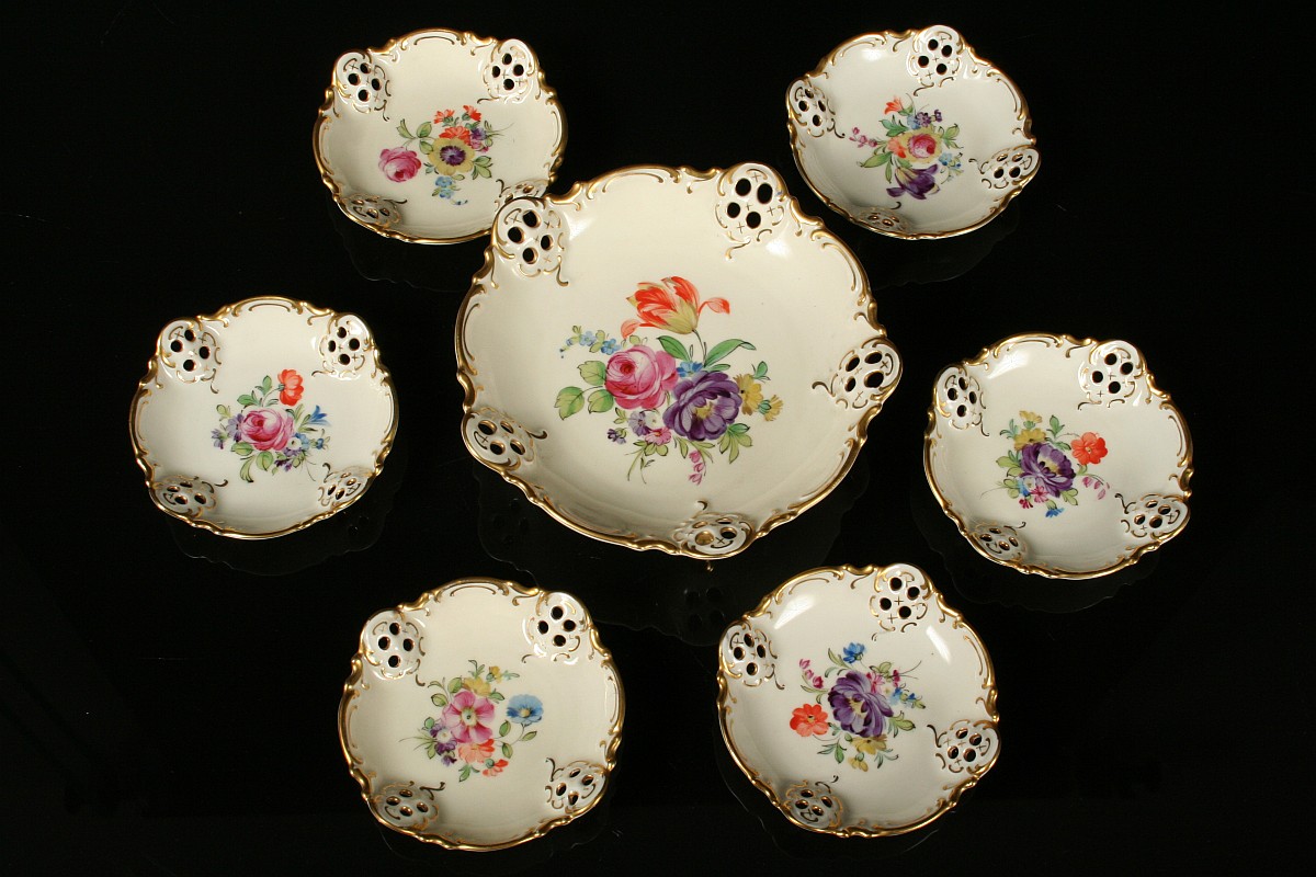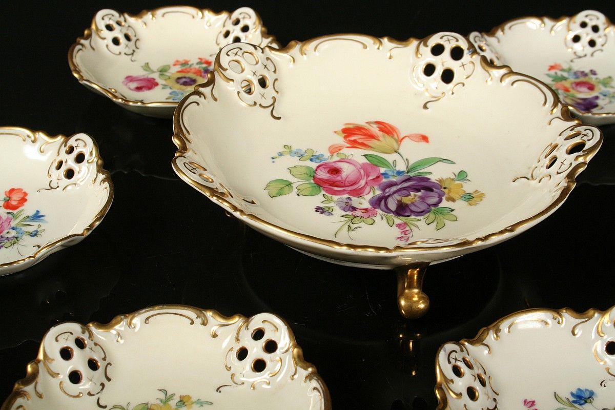 porcelánová ručně malovaná desertní souprava, misky na drobné pochutiny, cukrovinky, nebo oříšky, fajnový porcelán v barvě slonové kosti, rokajovité tvary v rokokovém stylu, rokajovité okraje po obvodu perforované, jedna větší miska na třech nožkách, 5 x 16,5 cm, a šest menších misek, všechny s centrálním, ručně malovaným motivem pestrých květin, všechny kusy značeny na dně Carlsbad Gloria Elite-Ivory (Nová Role)