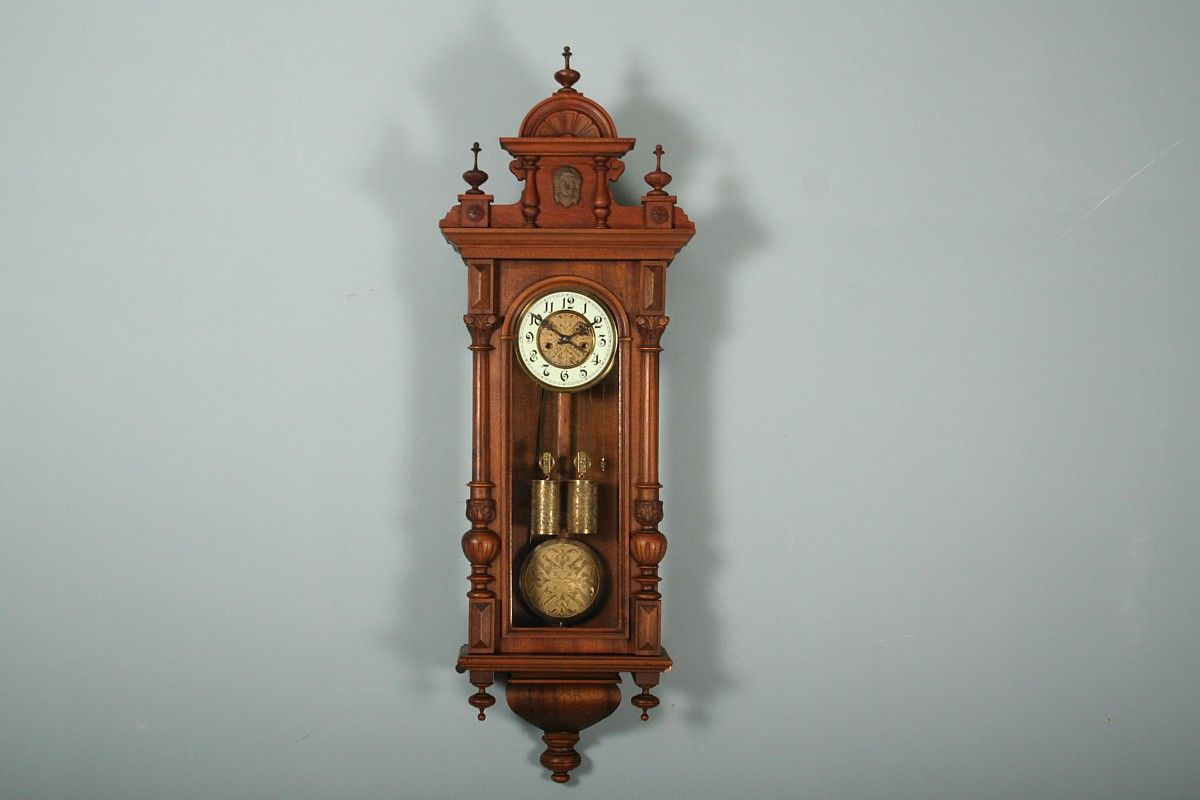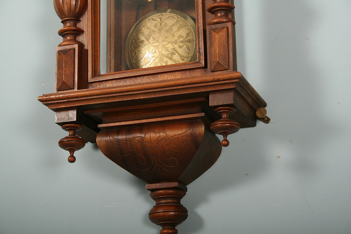 závěsné bicí hodiny bohatě gravírované v dřevěné vyřezávané skříni v pseudorenesančním stylu dýhované ořechem menších rozměrů, v pěkném původním stavu včetně původní koruny z přelomu 19. a 20. století, ciferník smaltovaný s bohatě gravírovaným středem dvěmi závažími a pendlem, stroj závažový značený okřídleným kolem, půlové bití do gongové tyče, funkční s klíčkem, 100 x 39 cm