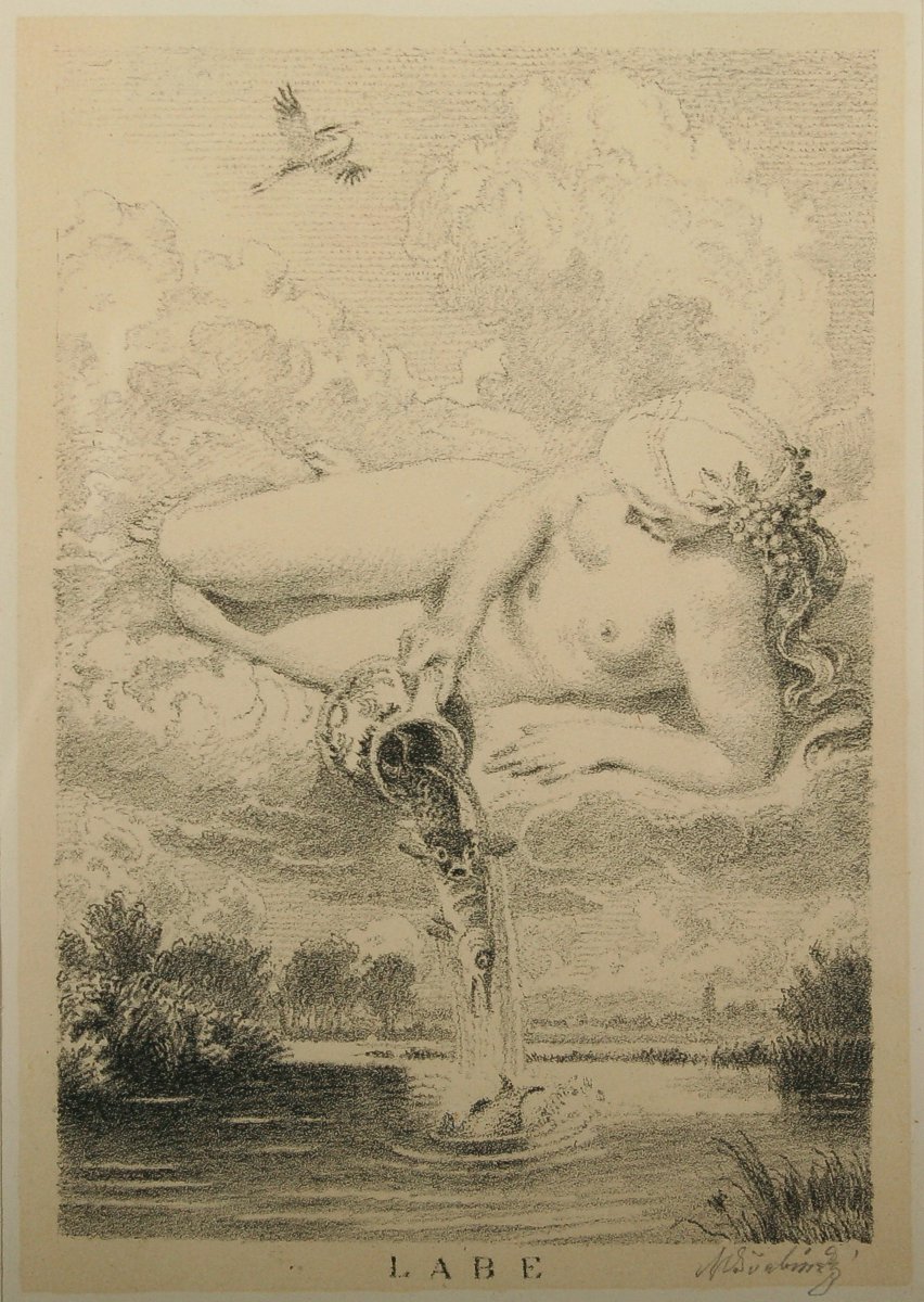 alegorie Labe, litografie na papíře 19 x 13 cm s rámem 34 x 27 cm, autor Max Švabinský, podepsáno v vpravo dole tužkou M. Švabinský, rámováno v paspartě a rámu pod sklem