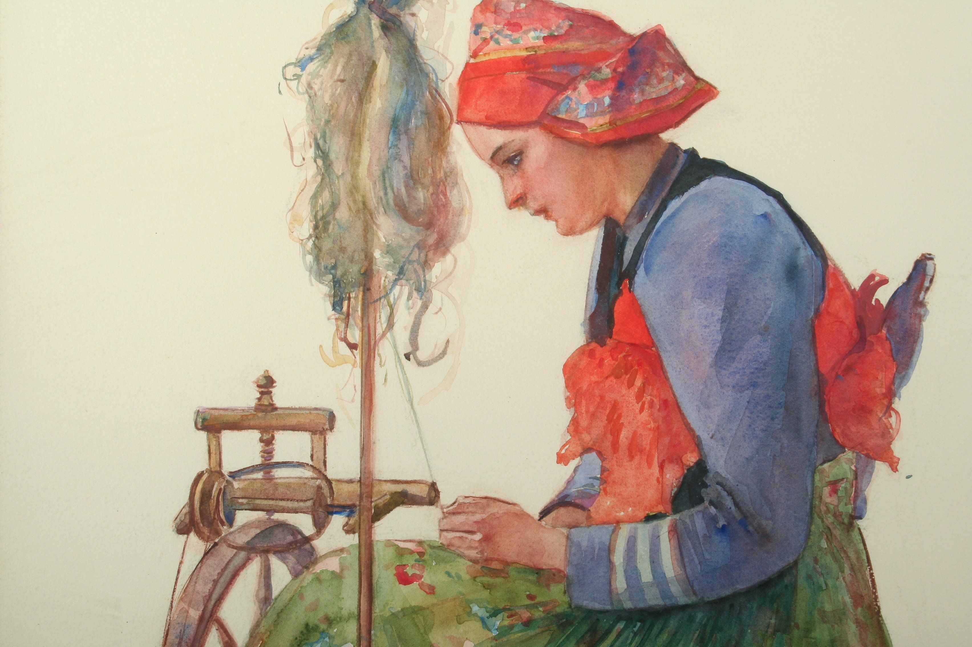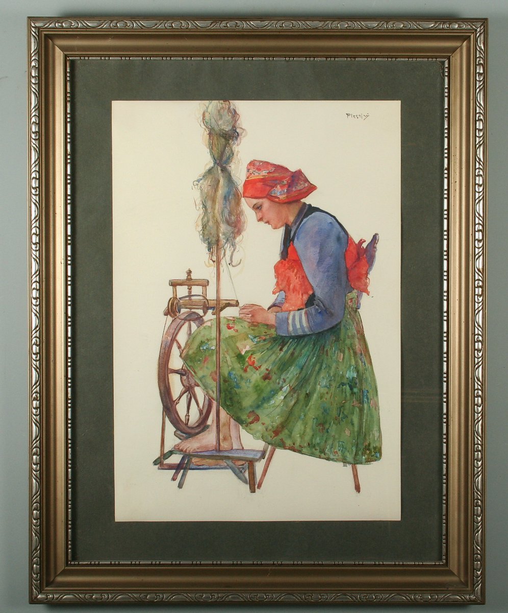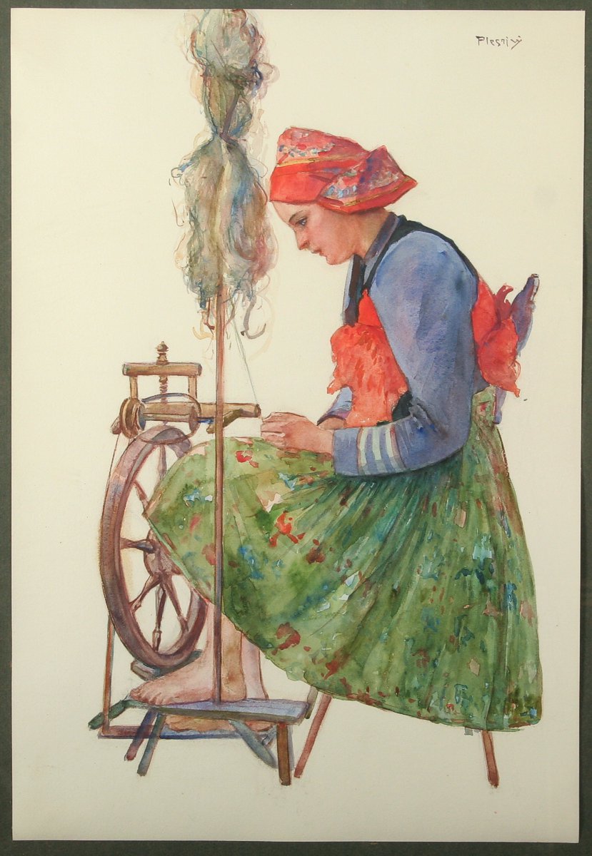 dívka u kolovratu, předlena, akvarel na papíře 55 x 37 cm s rámem 76 x 59 cm, autor Vincent Plesnivý, podepsáno vpravo nahoře Plesnivý, rámováno v původním rámu a paspartě pod sklem