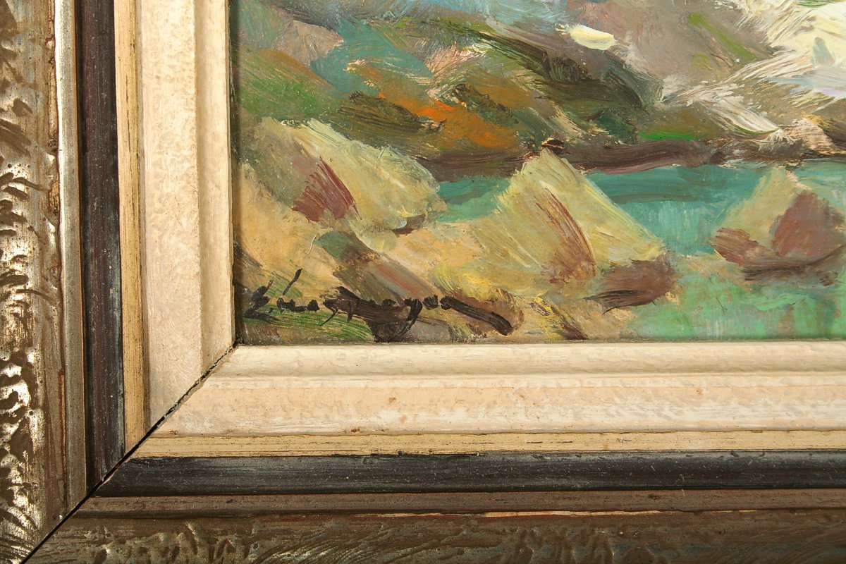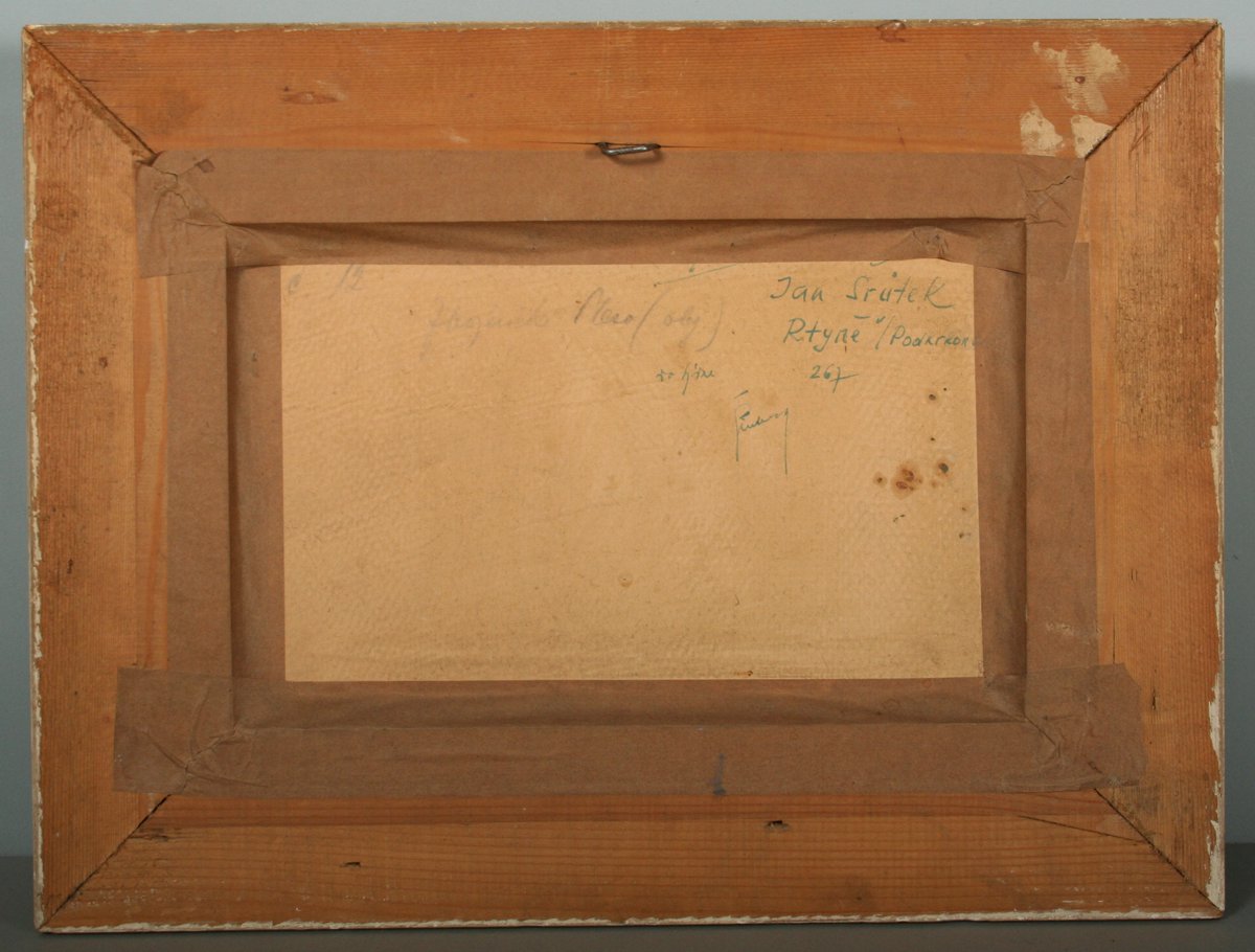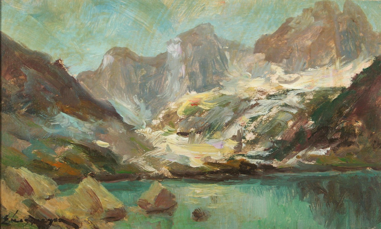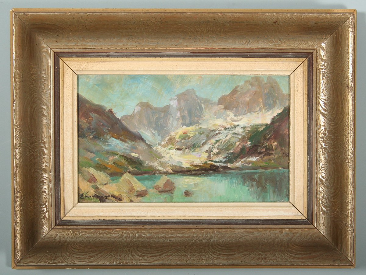 obraz jarní horské krajiny, Zbojnícké pleso v Tatrách, olej na kartonu 16 x 25 cm s rámem 30 x 39 cm, autor Emanuel Hosperger, podepsáno vlevo dole E. Hosperger na zadní straně přípis s dedikací, rámováno v původním rámu