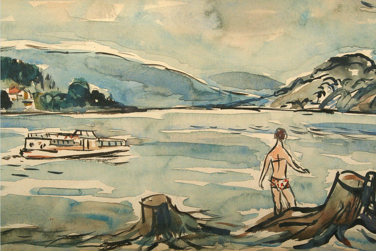obraz, koupání na přehradě s parníkem, akvarel na papíře 17 x 39 cm s rámem 35 x 57 cm, autor František Emler, podepsáno vlevo dole F. Emler 83, rámováno v původním rámu a paspartě pod sklem