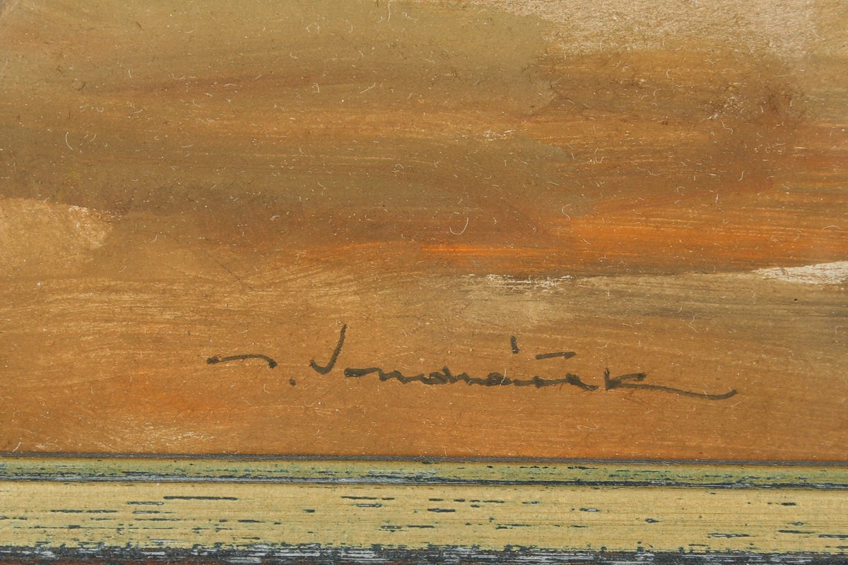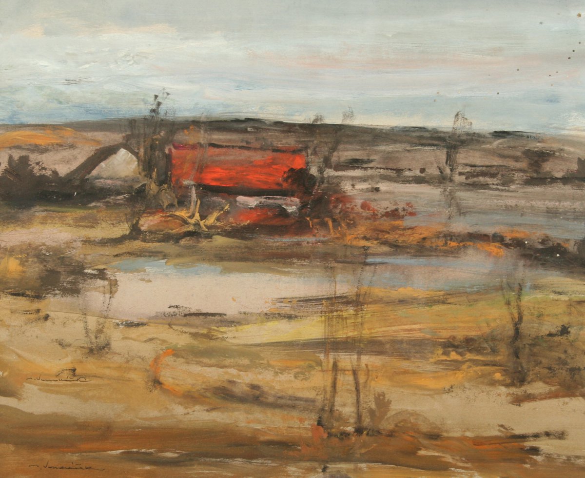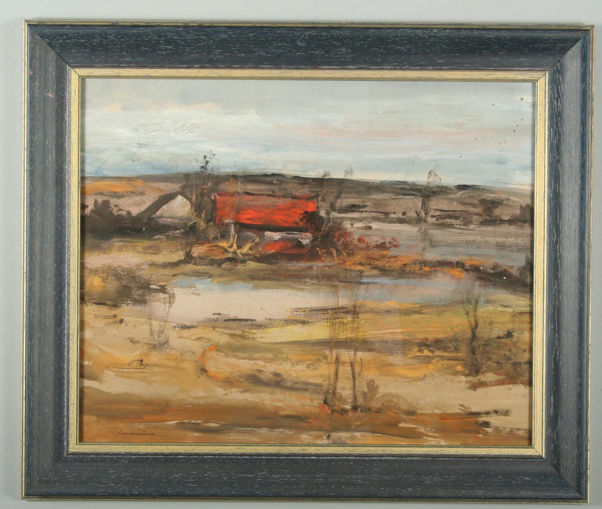 obraz krajiny s mokrinami a chalupou, tempera na papíře, 32 x 40 cm, s rámem 43 x 51 cm, autor Josef Vondráček, podepsáno vlevo dole J. Vondráček, rámováno pod sklem