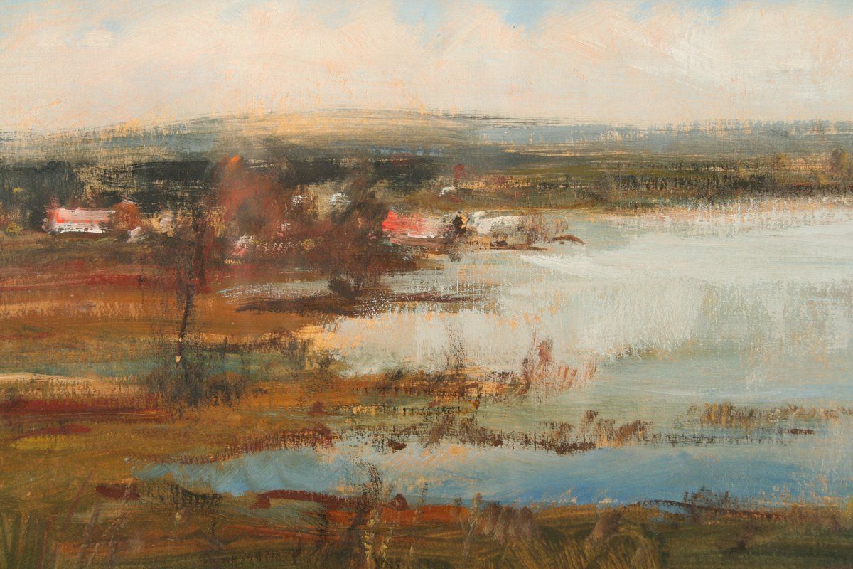 obraz krajiny s nádtrží Rozkoš, olej na lepence, 17 x 40 cm, s rámem 38 x 62 cm, autor Josef Vondráček, podepsáno vpravo dole špatně čitelně J. Vondráček, rámováno v původním rámu a paspartě pod sklem