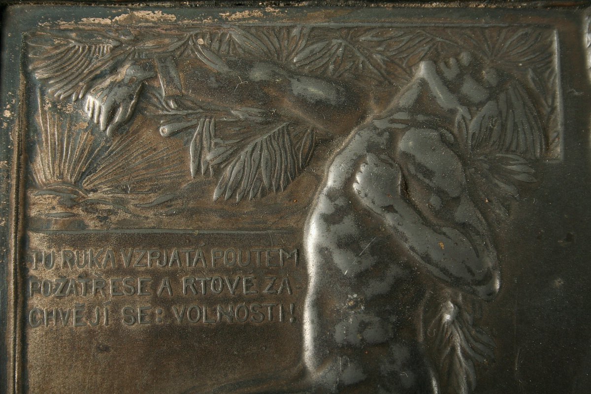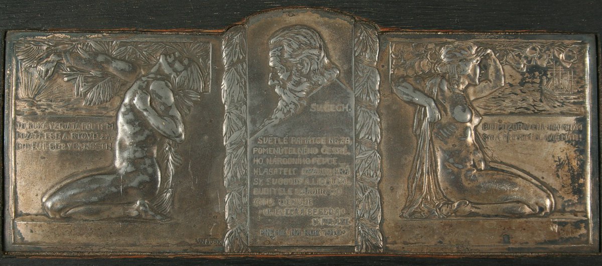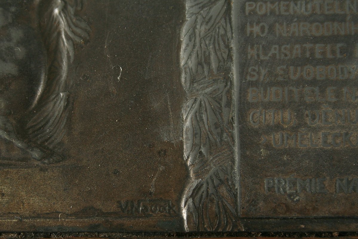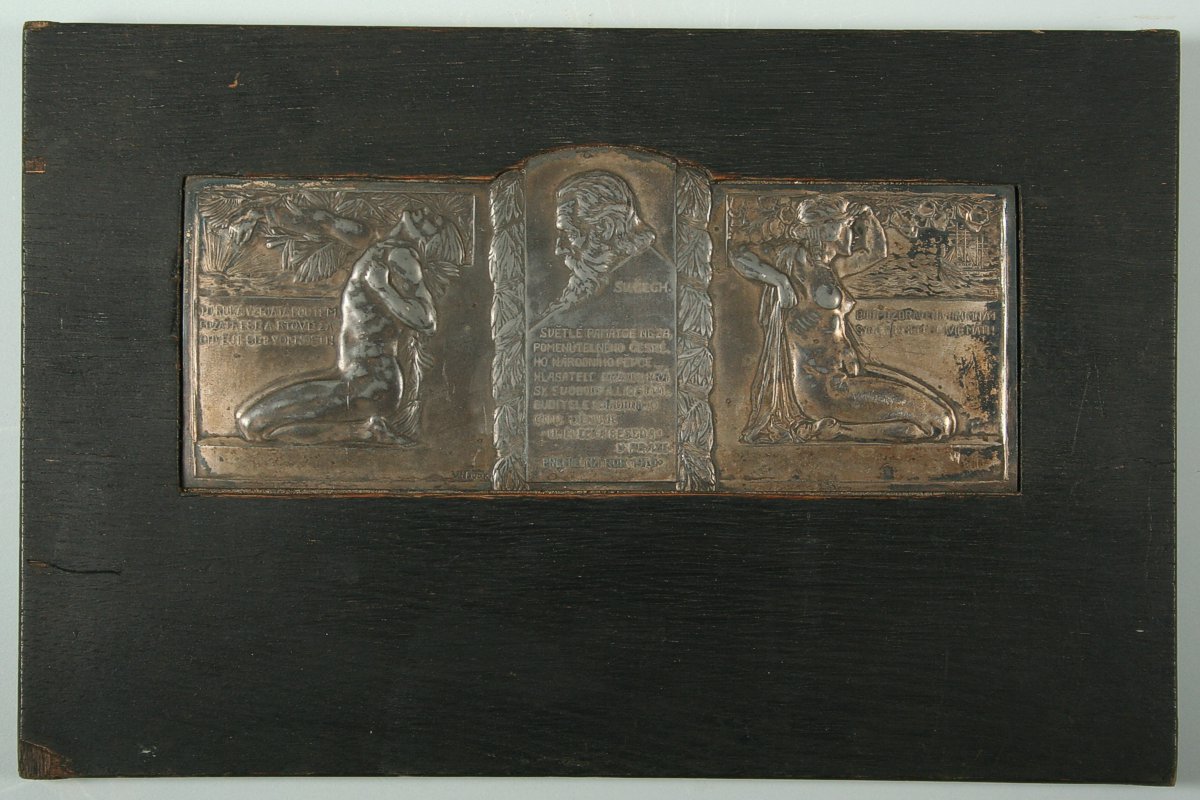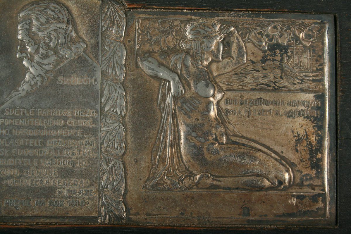 plaketa Sv. Čecha secesně stylizovaná s alegoriemi po stranách, autor Václav Novák (1880 – 1917), vytvořeno jako prémie Umělecké besedy v Praze na rok 1910, litý obecný kov, značeno V. Novák, adjustováno do desky z černě mořeného dřeva, 22 x 33 cm