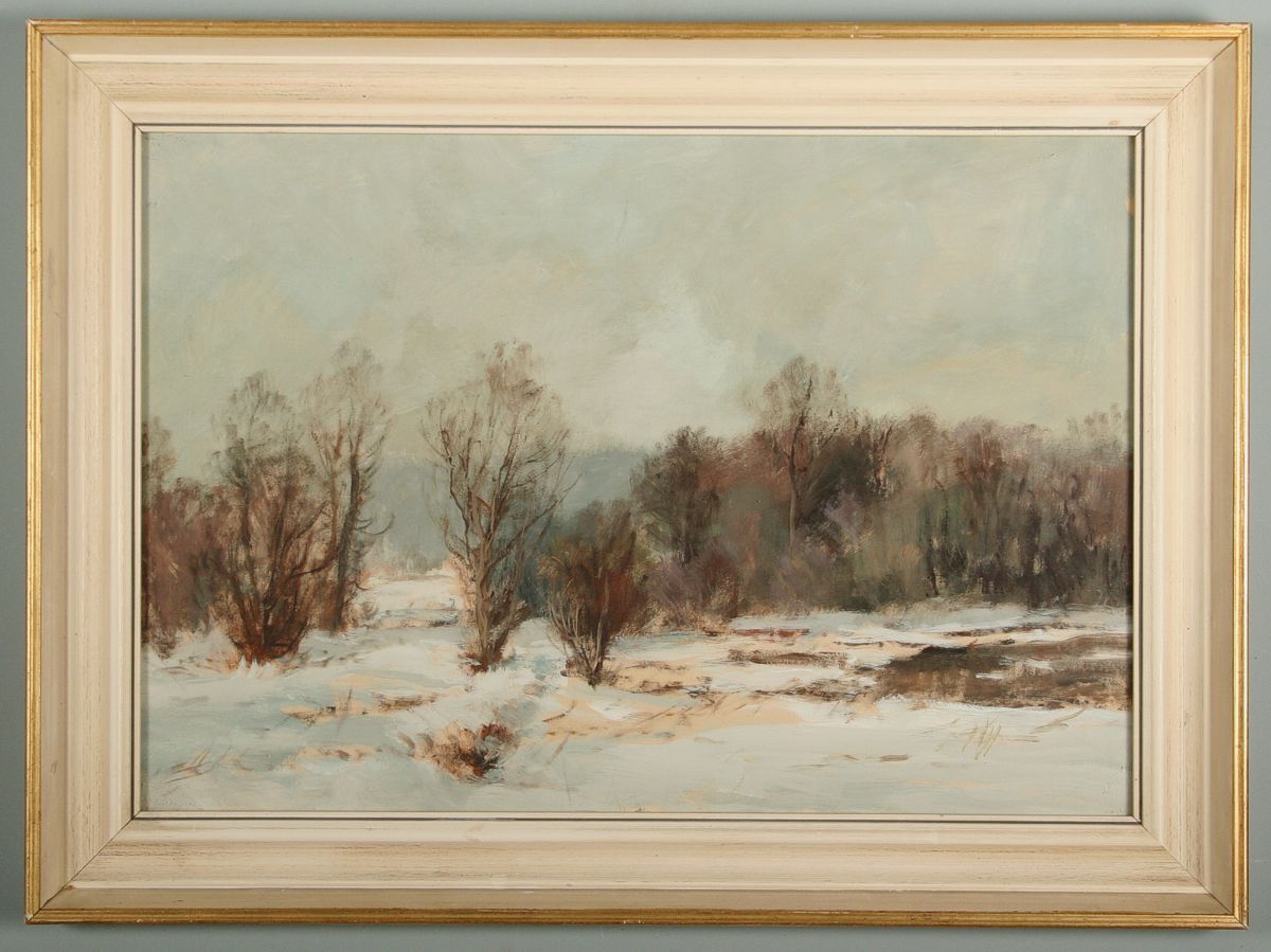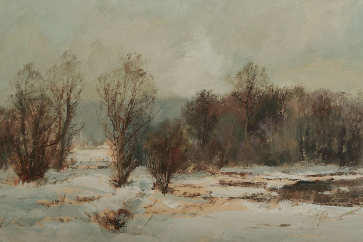 obraz zimní krajiny u Rozkoše, tempera na papíře, 34 x 49 cm, s rámem 44 x 59 cm, autor Josef Vondráček, podepsáno vpravo dole špatně čitelně J. Vondráček, rámováno v původním rámu pod sklem