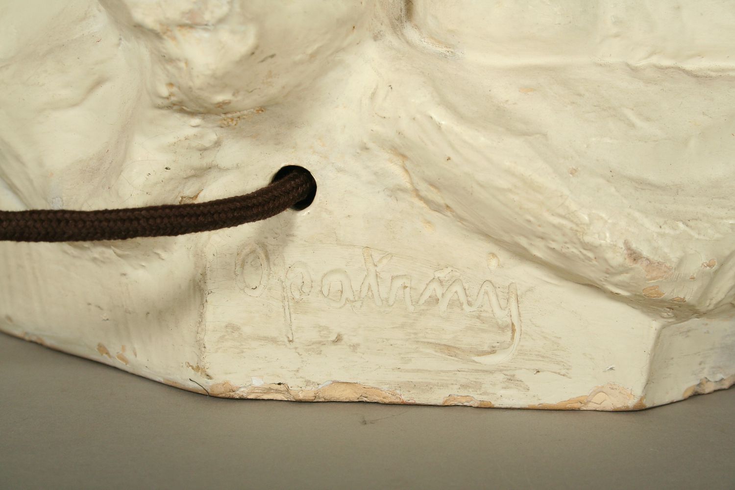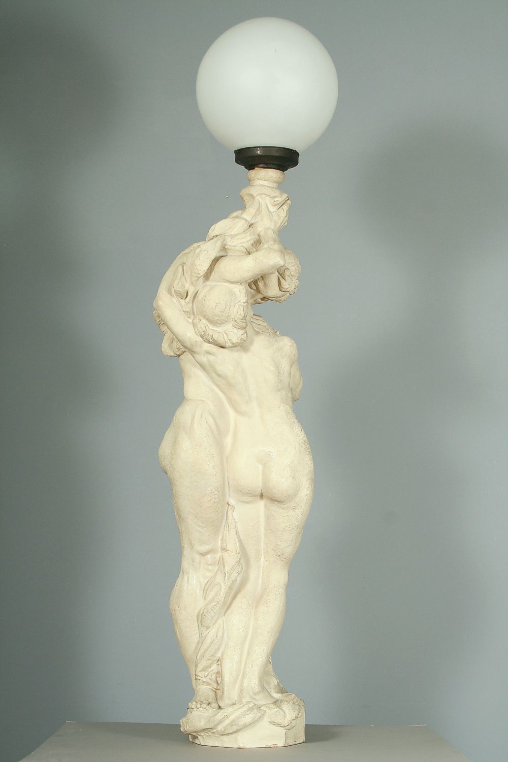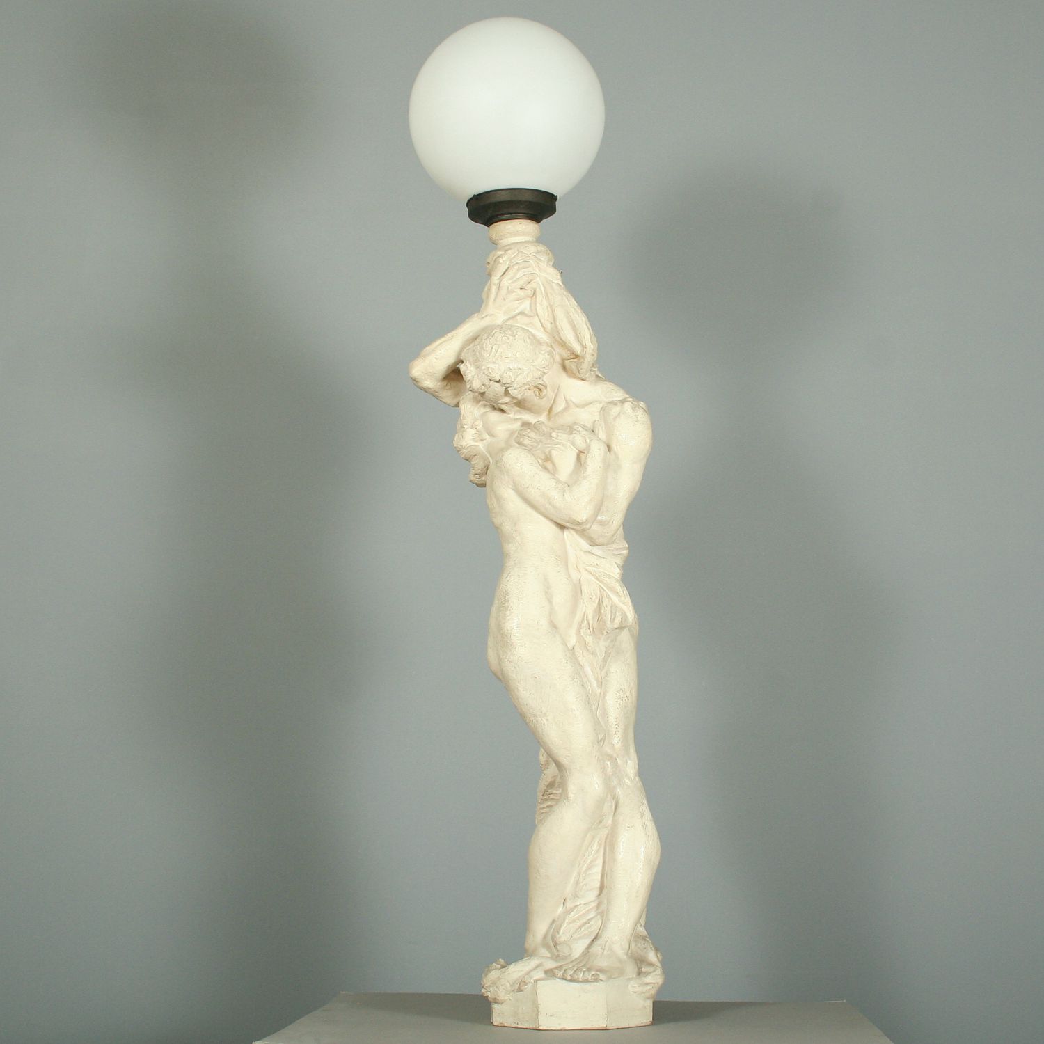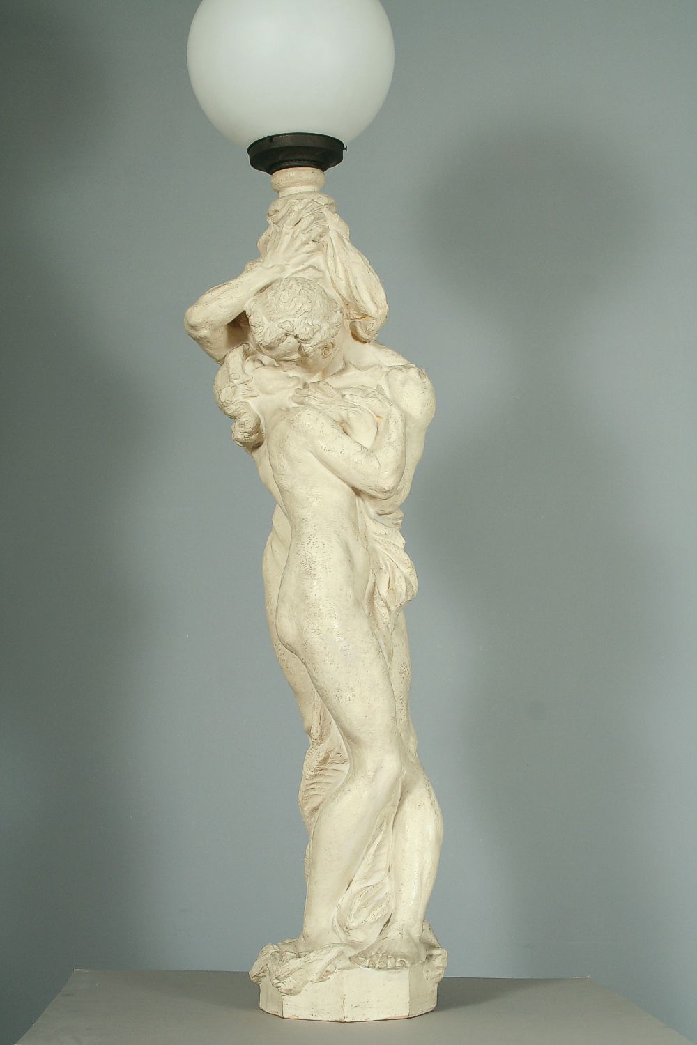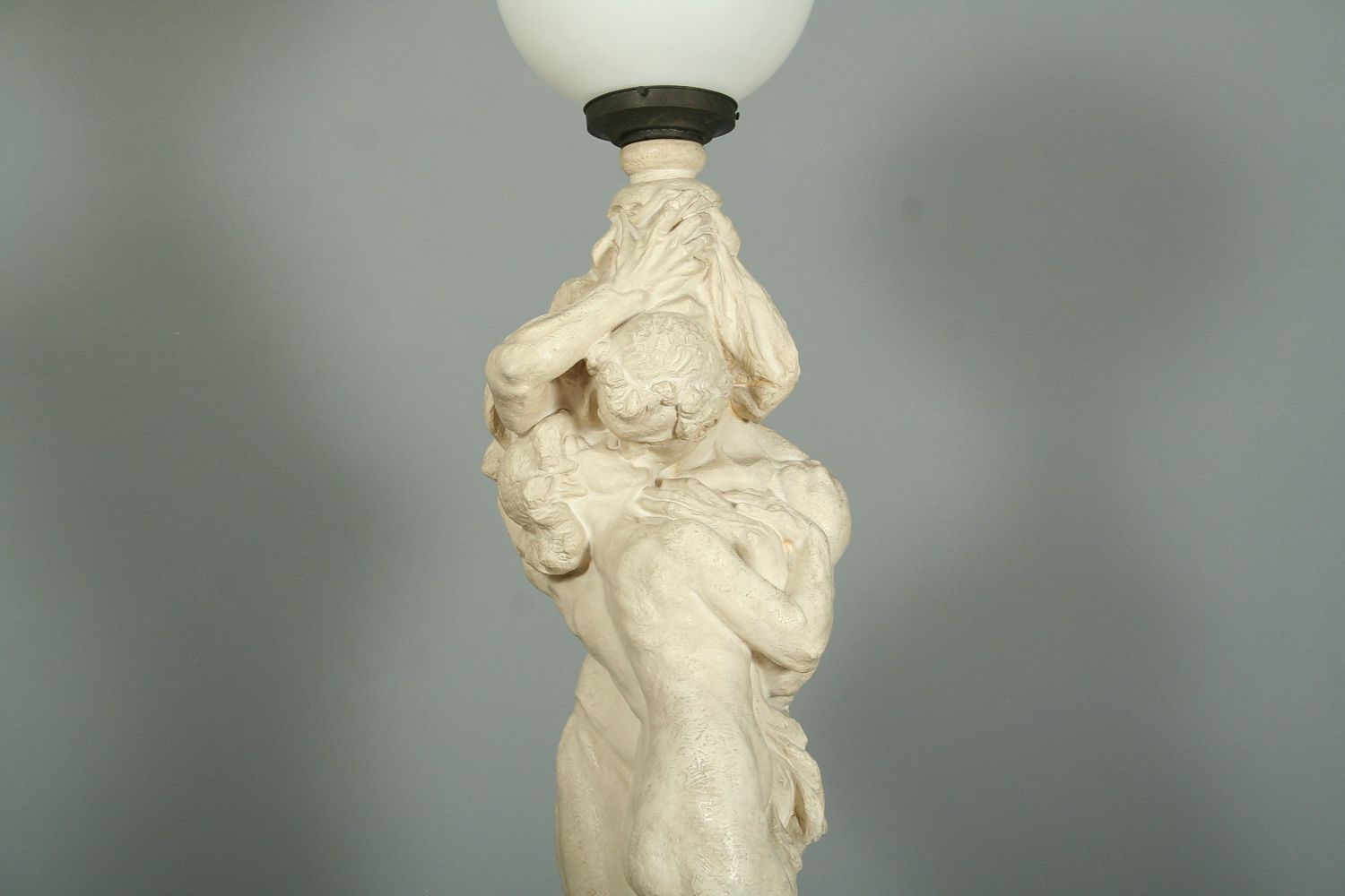 veliká figurální lampa s motivem milenců, patinovaná keramika značená Bechyně číslo modelu 525, autor Karel opatrný, výška 150 cm, podepsáno na podstavci Opatrný, původní skleněné stínidlo, funkční stav