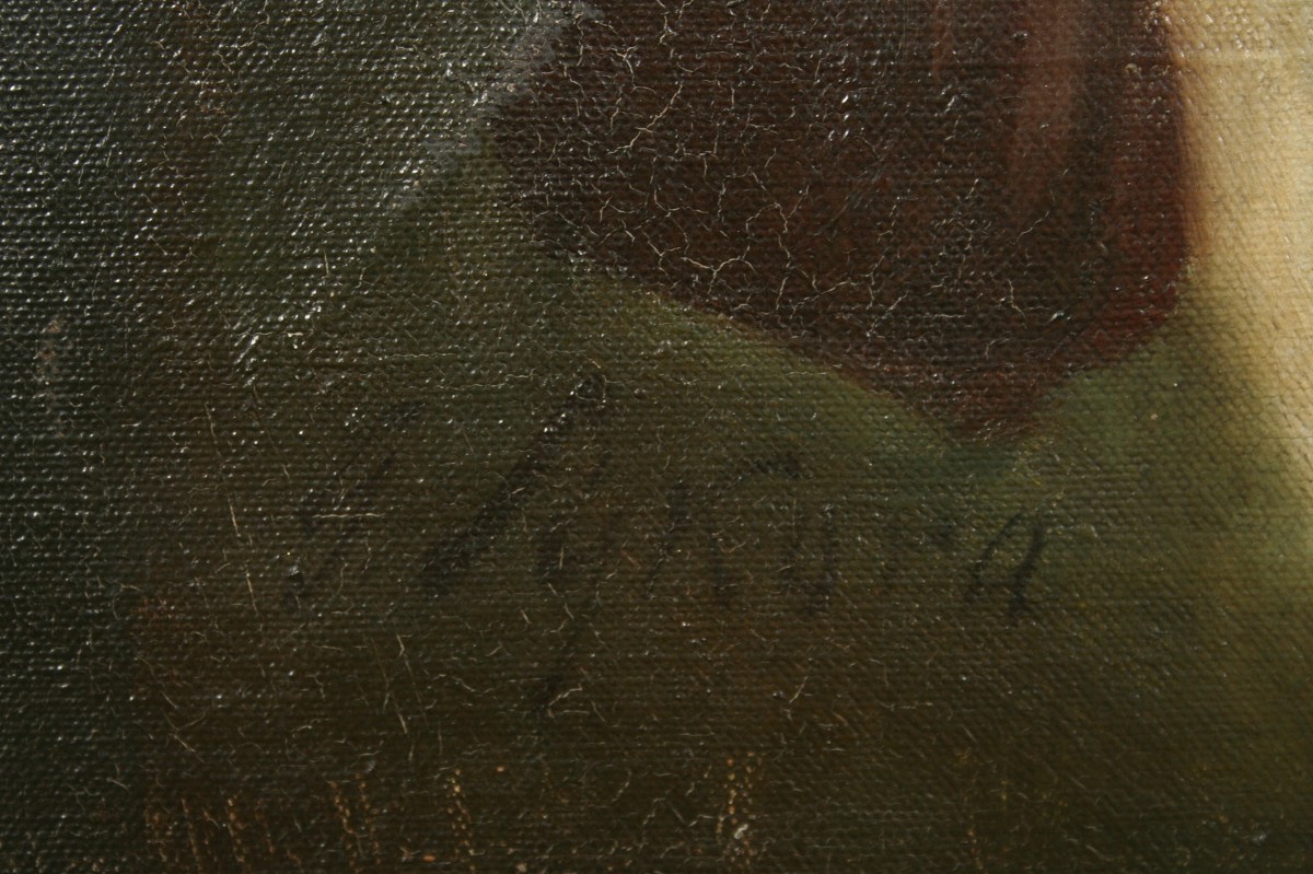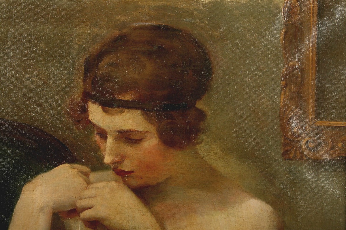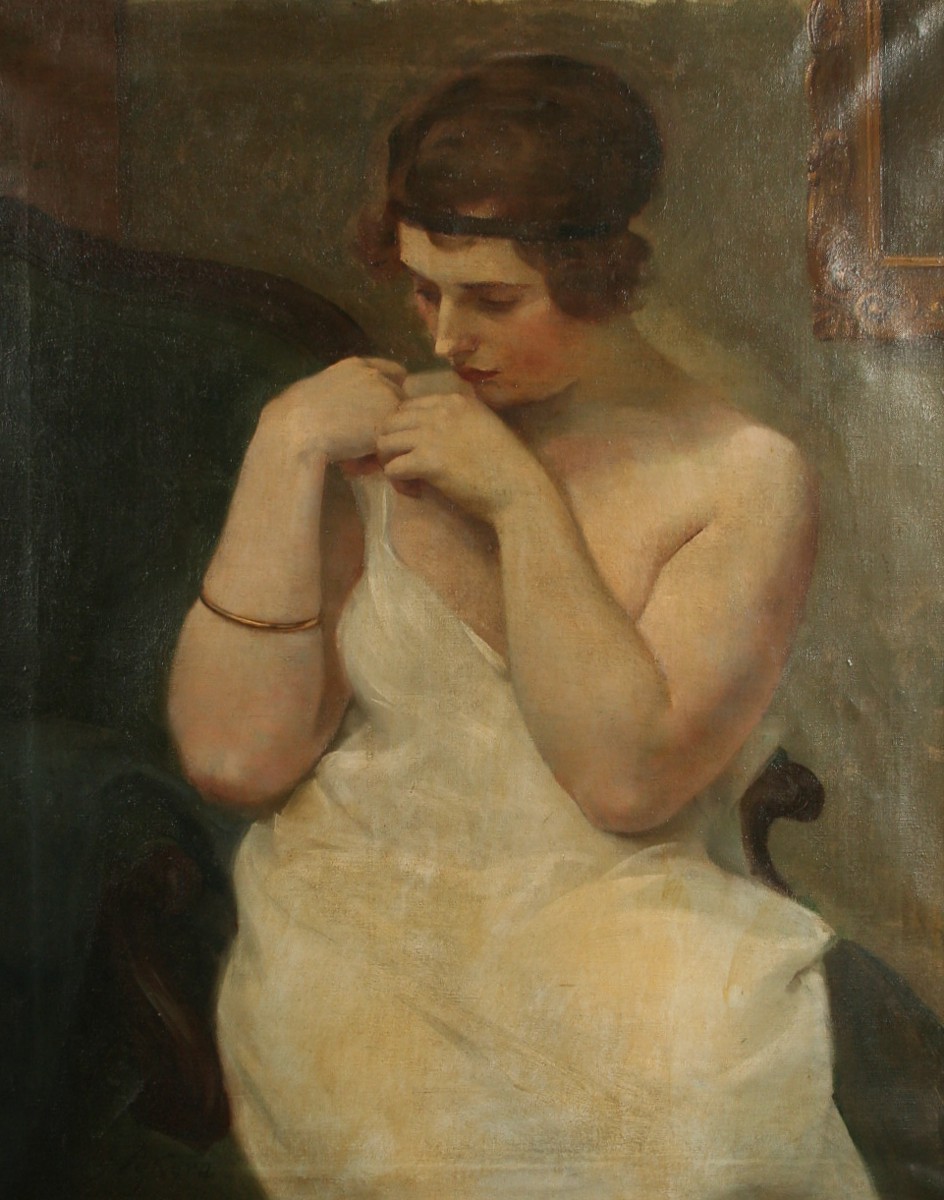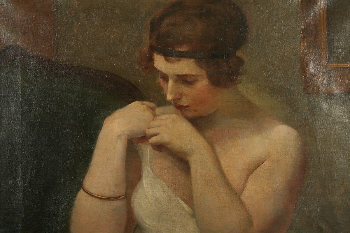 obraz cudné dívky při raní toaletě v interieru, olej na plátně 78 x 64 cm s rámem 98 x 84 cm, autor Gustav Sýkora, podepsáno vlevo dole G. Sýkora, rámováno v původním zdobeném rámu, obraz pochází z významné náchodské pozůstalosti