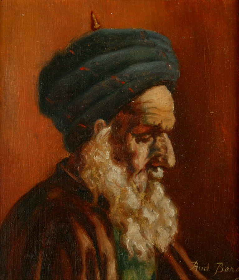 starý obraz, portrét starce patrně Araba, olej na dřevěné desce, 17 x 15 cm s rámem 24 x 22 cm, autor Rudolf Beneš, podepsáno vpravo dole Rud. Beneš, rámováno v původním rámu