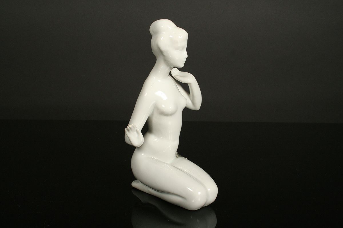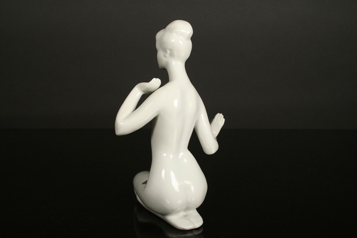 stylizovaná soška, sedící dívčí akt 60. léta tzv bruselský styl, bílý porcelán glazovaný značený na dně starou tištěnou značkou Royal DUX Duchcov, 50 - 60. léta 20. století, koncem 70. let se již tato značka nepoužívala, výška 18 cm