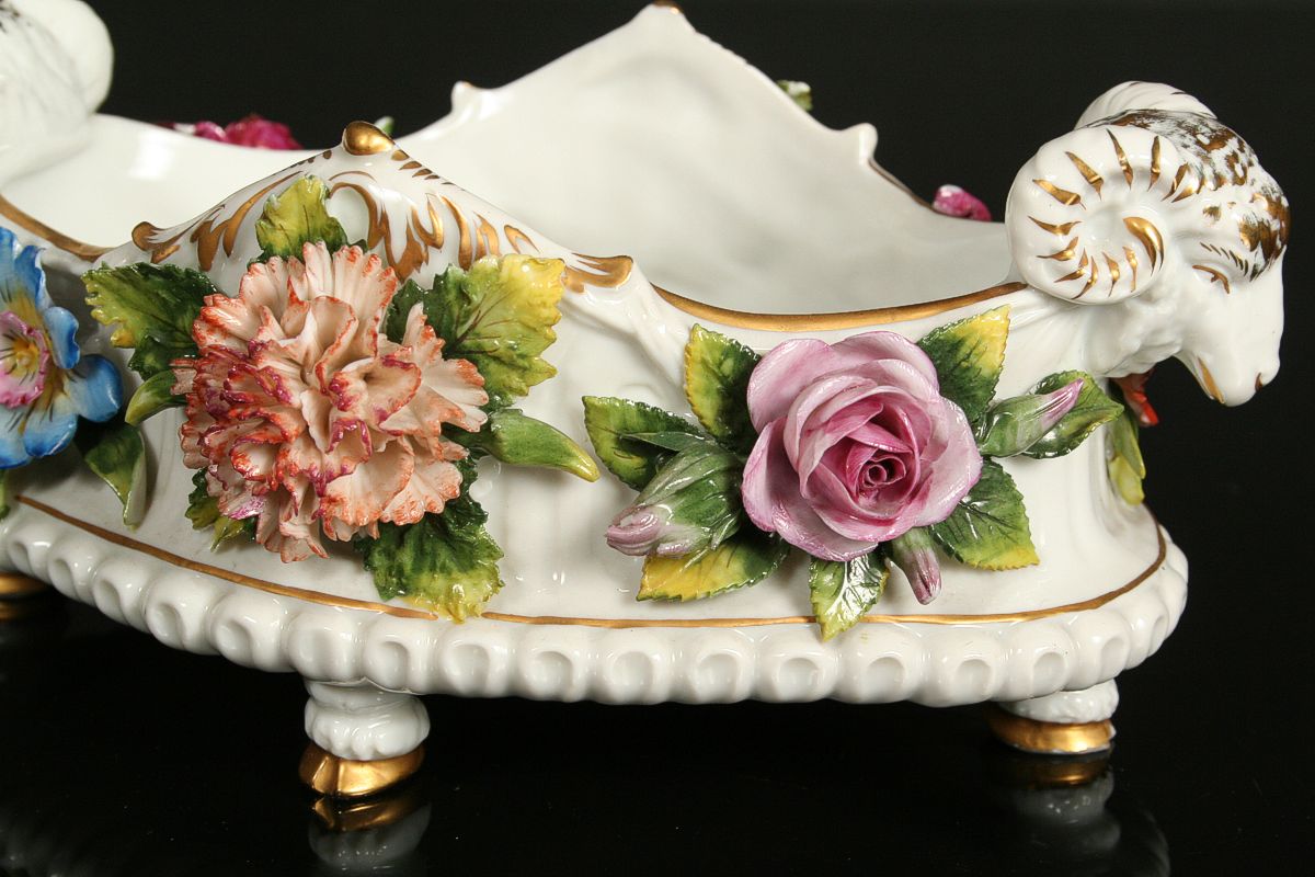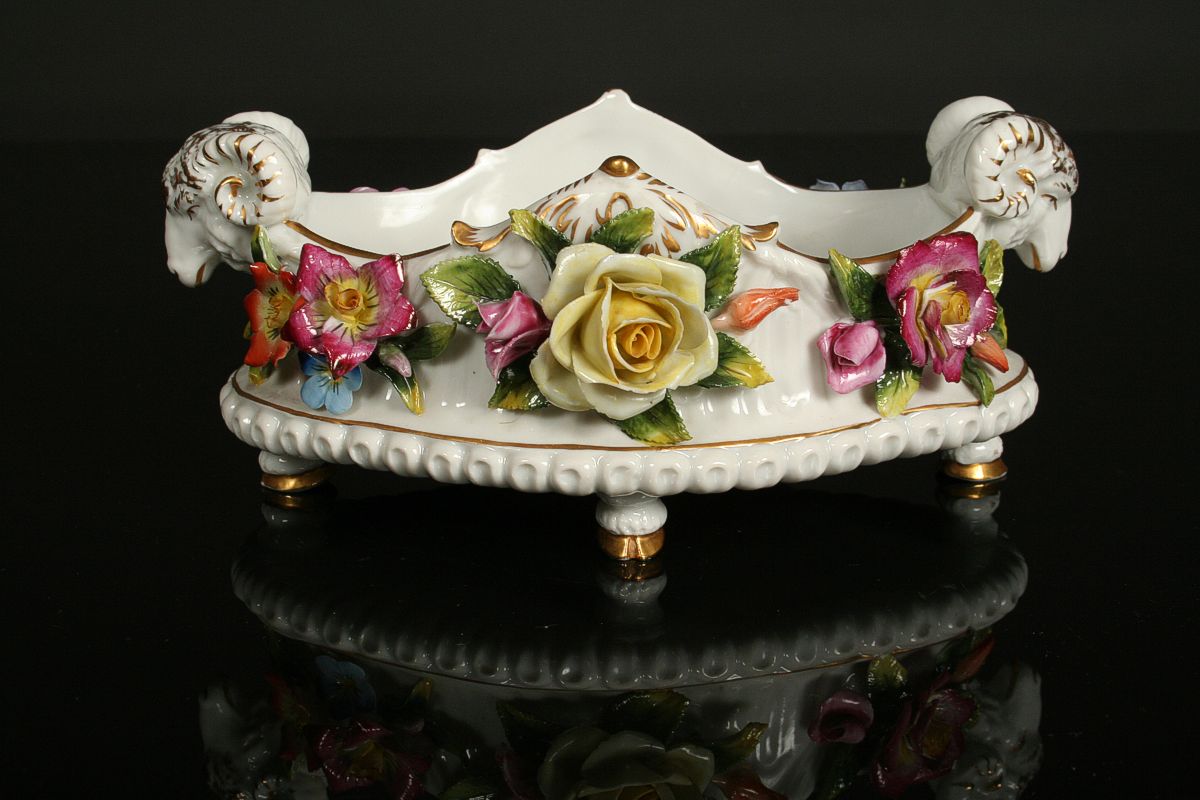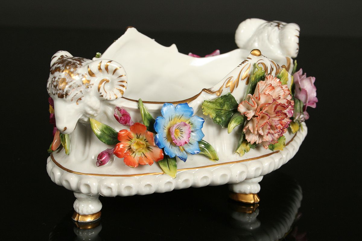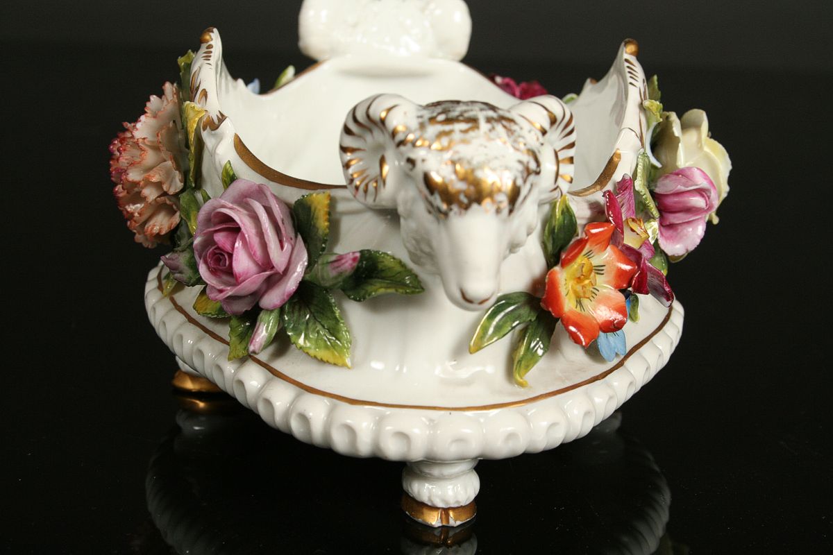 miska s beraními hlavičkami na čtyrech nožkách bohatě opsypaná plastickými květy, bílý malovaný porcelán, zlacené detaily, značeno na dně modrou značkou MZ s korunkou Volkstedt, 8 x 20 cm