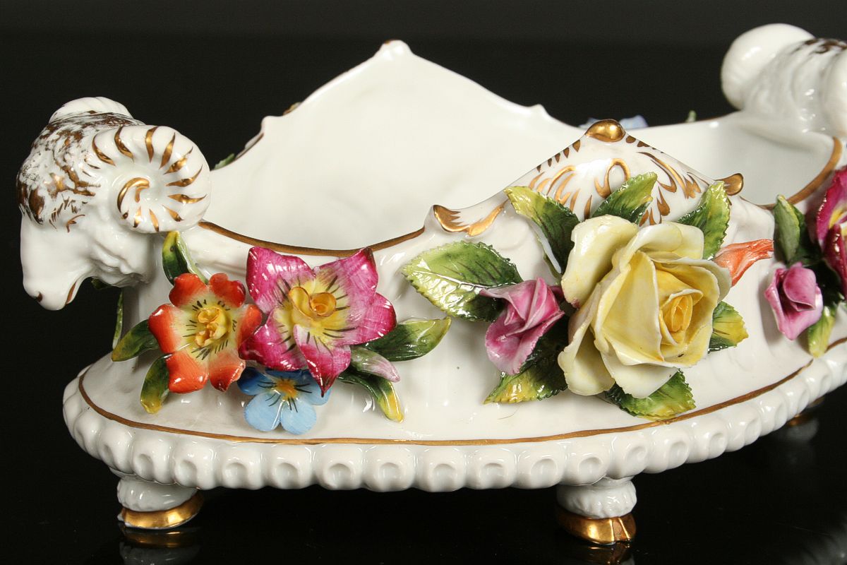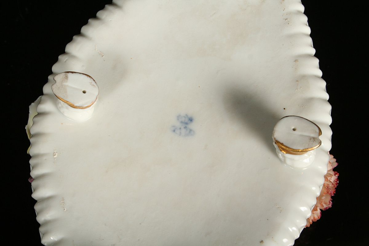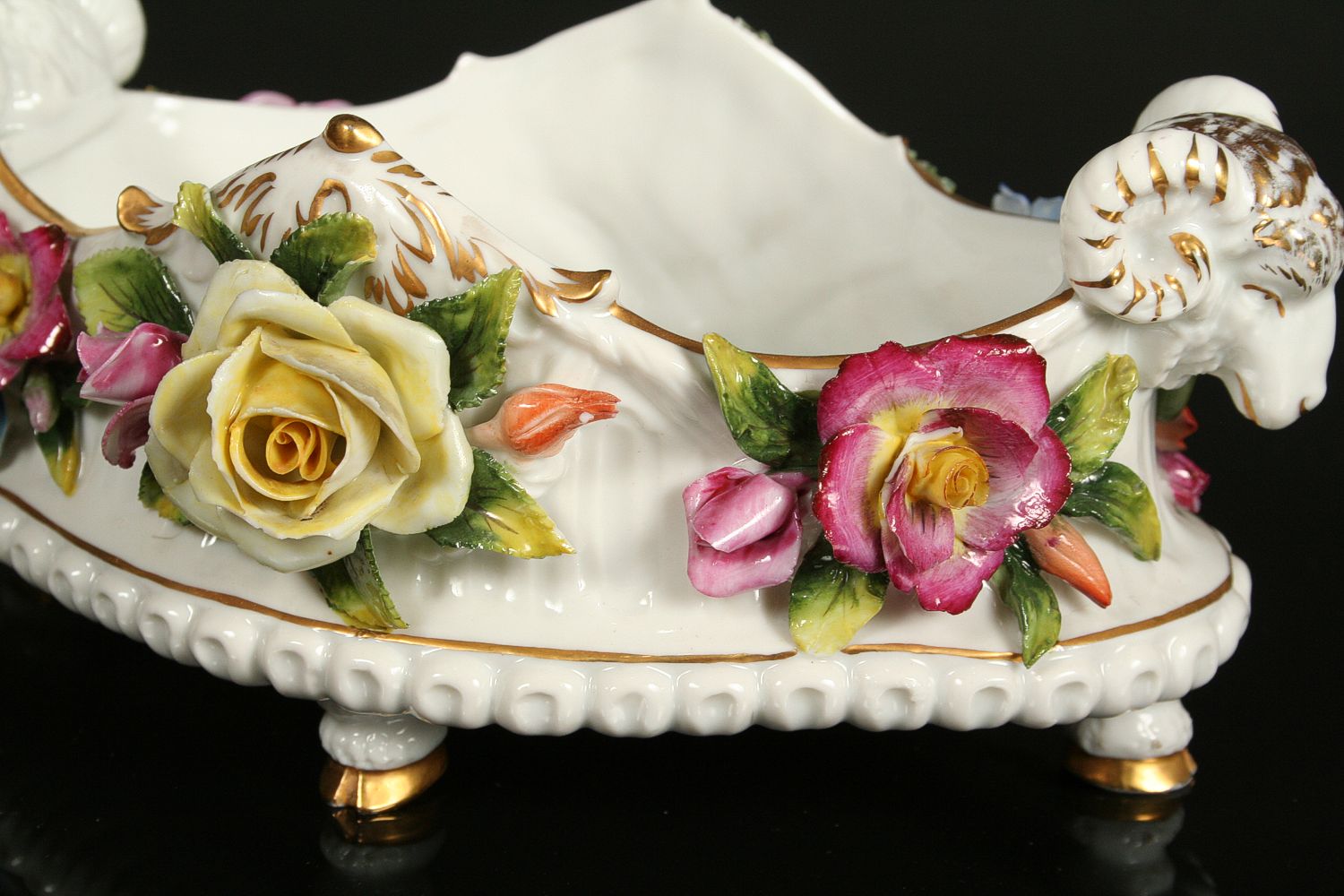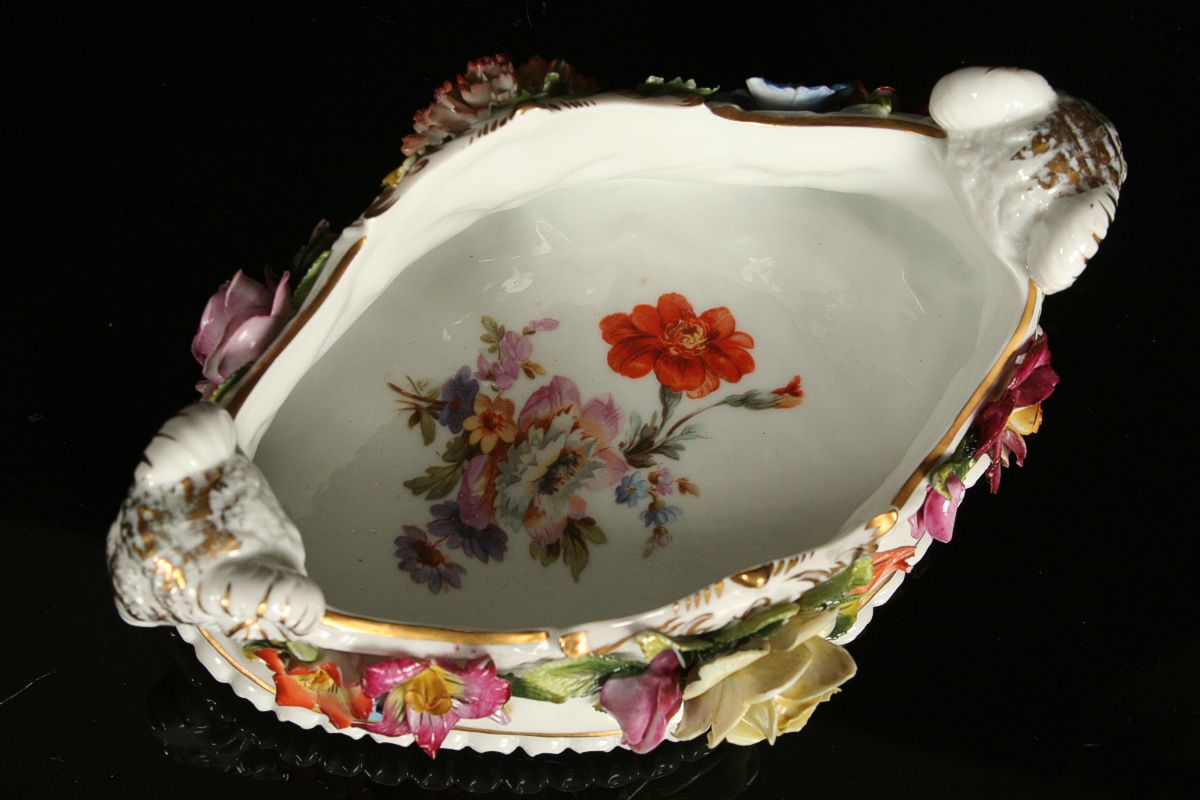 miska s beraními hlavičkami na čtyrech nožkách bohatě opsypaná plastickými květy, bílý malovaný porcelán, zlacené detaily, značeno na dně modrou značkou MZ s korunkou Volkstedt, 8 x 20 cm