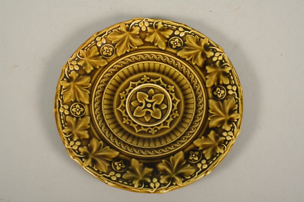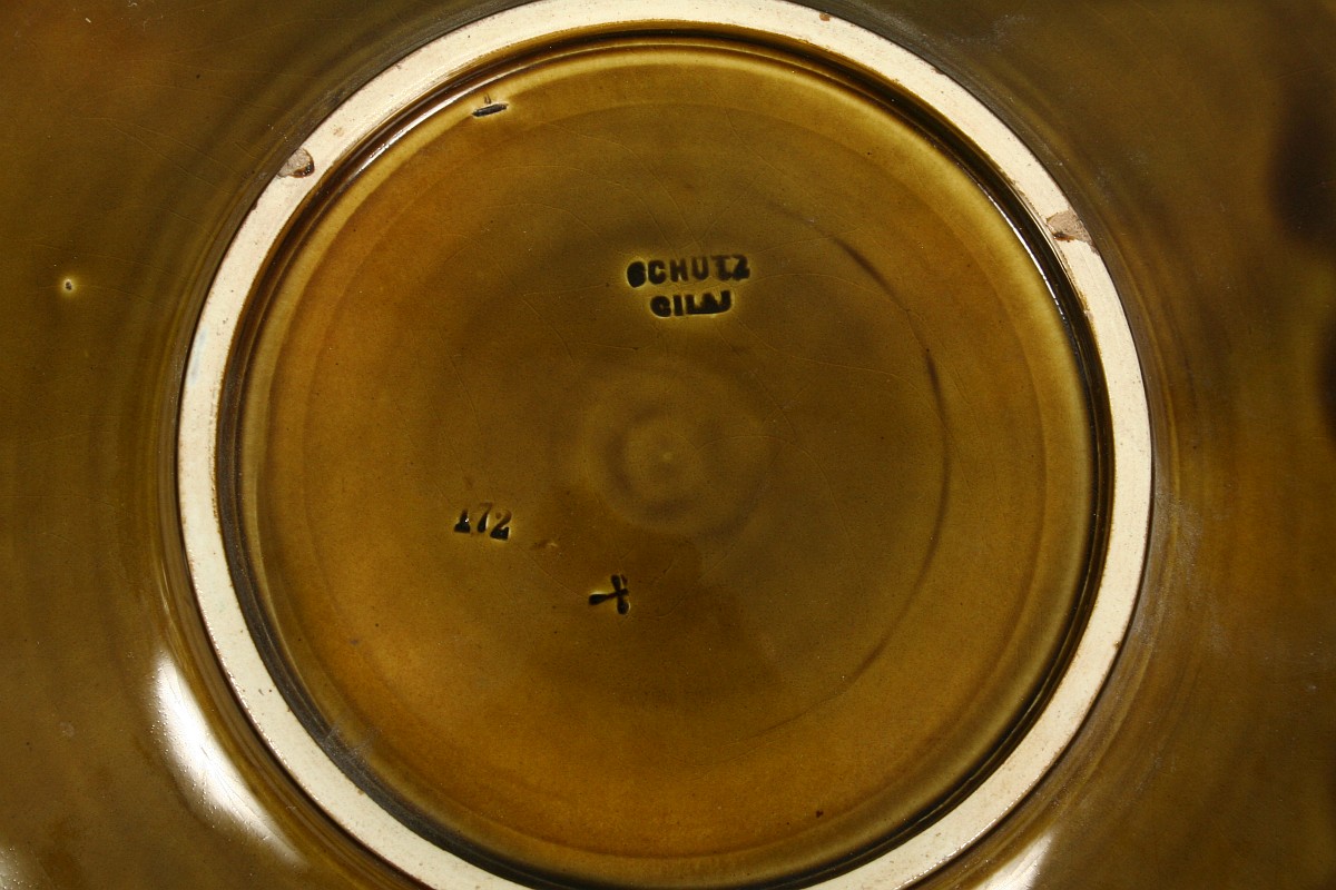 keramický talíř s bohatým plasticky tvarovaným dekorem, barvená a glazovaná keramika, značeno na dně Schütz CILAI Olomoučany, 24 cm