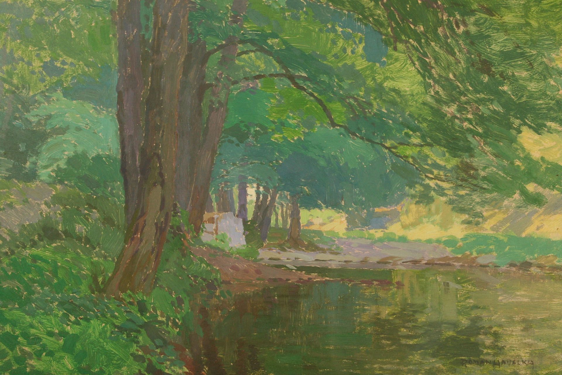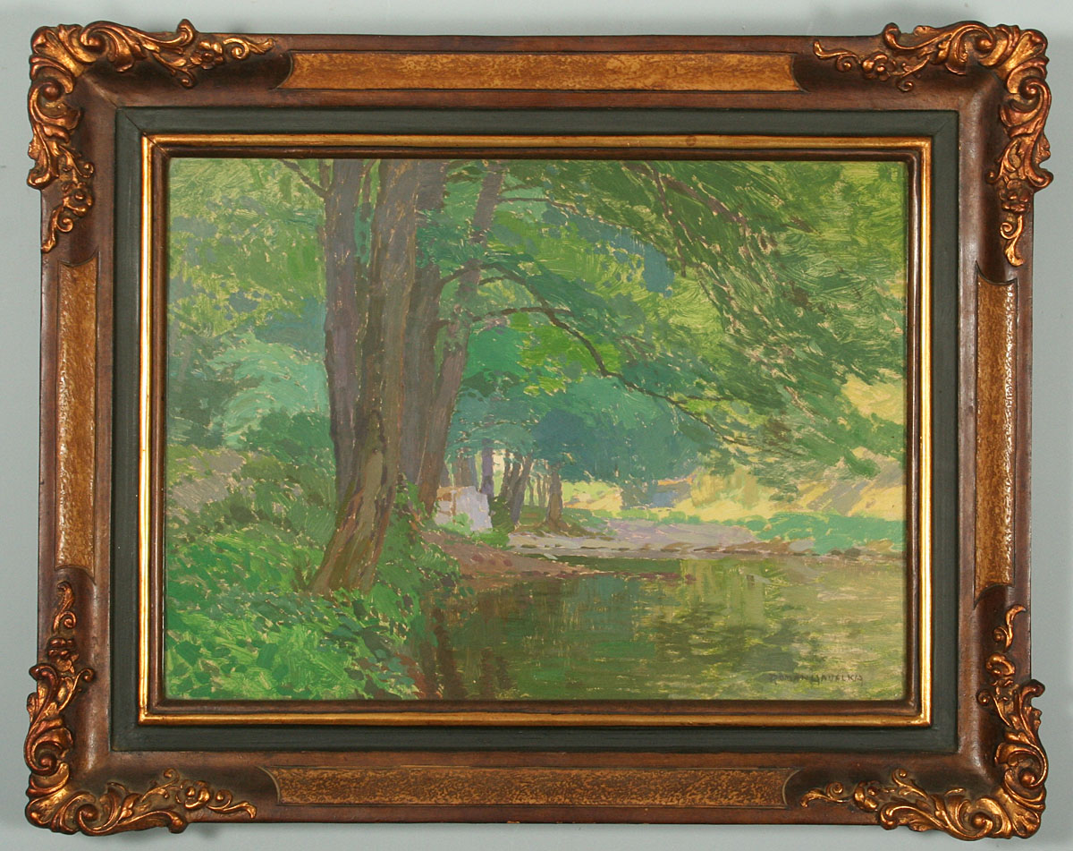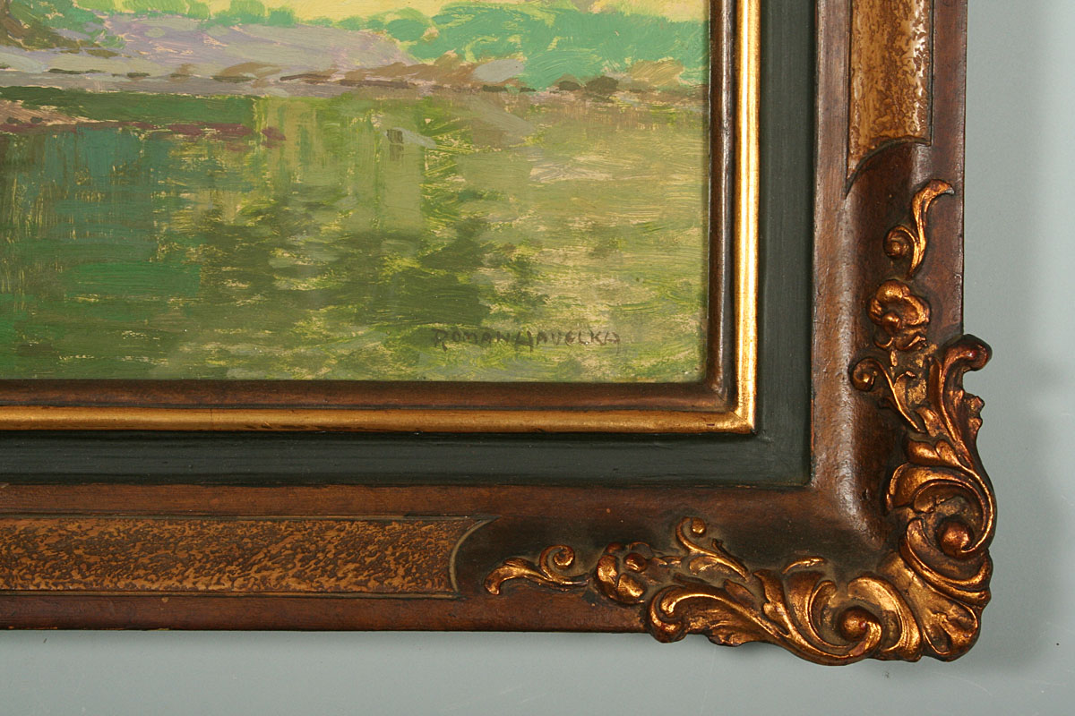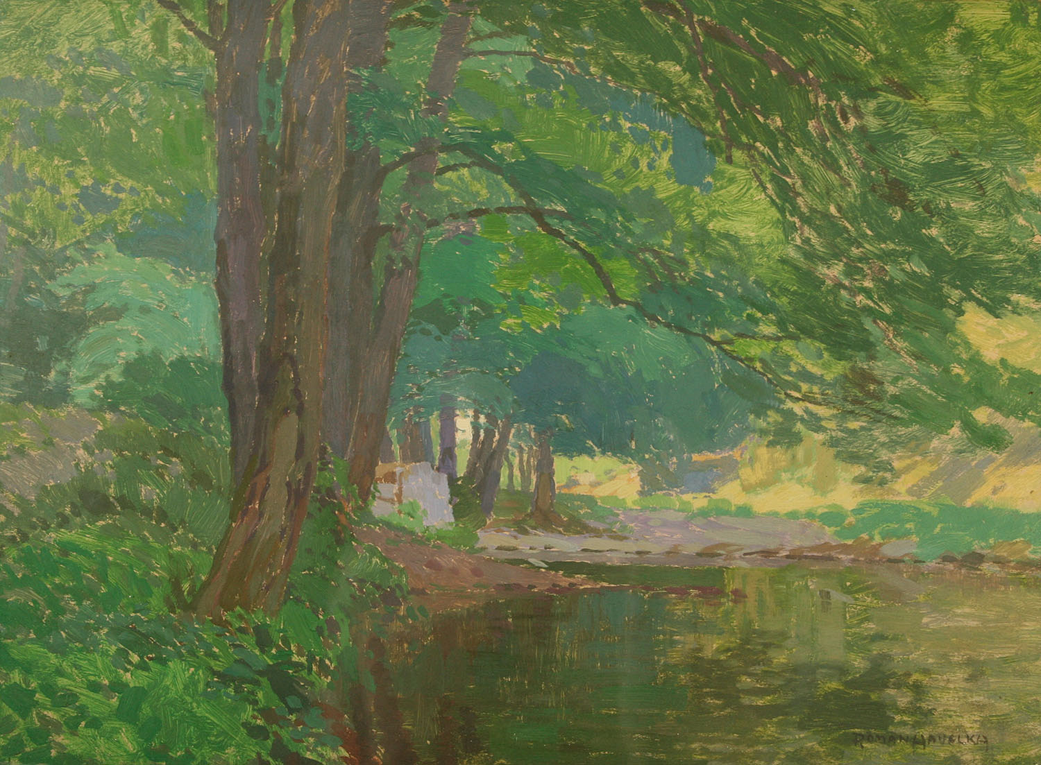 obraz tůňky v lese za slunečního svitu, olej na kartonu 33 x 45 cm s rámem 47 x 60 cm, autor Roman Havelka, podepsáno vpravo dole Roman Havelka, na zadní straně viněta rámeře, zcela původní adjustace, rámováno ve zdobeném rámu pod sklem