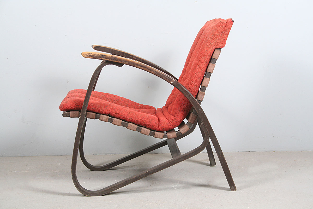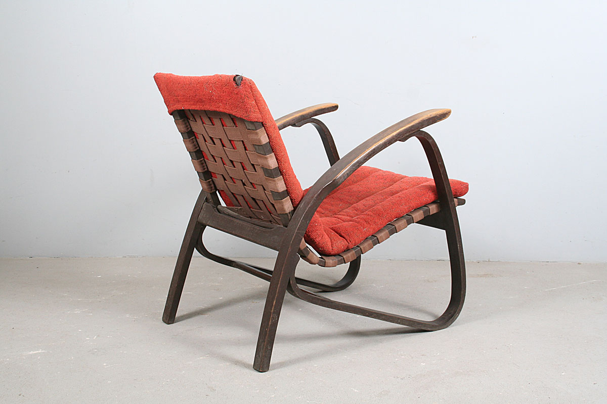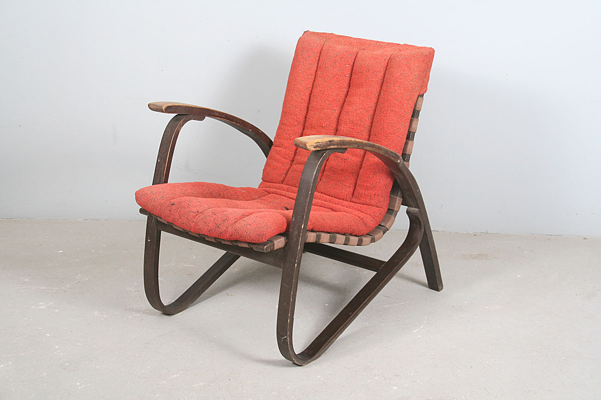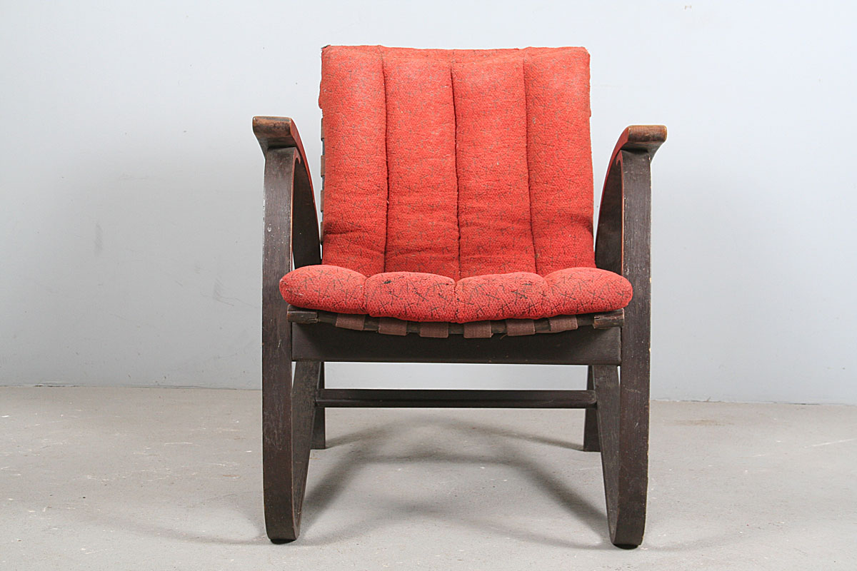 ikonické křeslo design Jan Vaněk, ohýbané mořené bukové dřevo avantgardních tvarů, původní polstrování uchycené ke křeslu pouze v horní části opěrky, popruhy nepotrhané, dřevo nepopraskané, konstrukce nerozviklaná, velmi příjemný posed, područky a lak omšelé, 78 x 62 x 77 cm