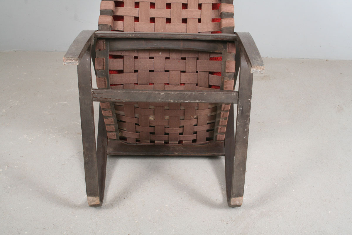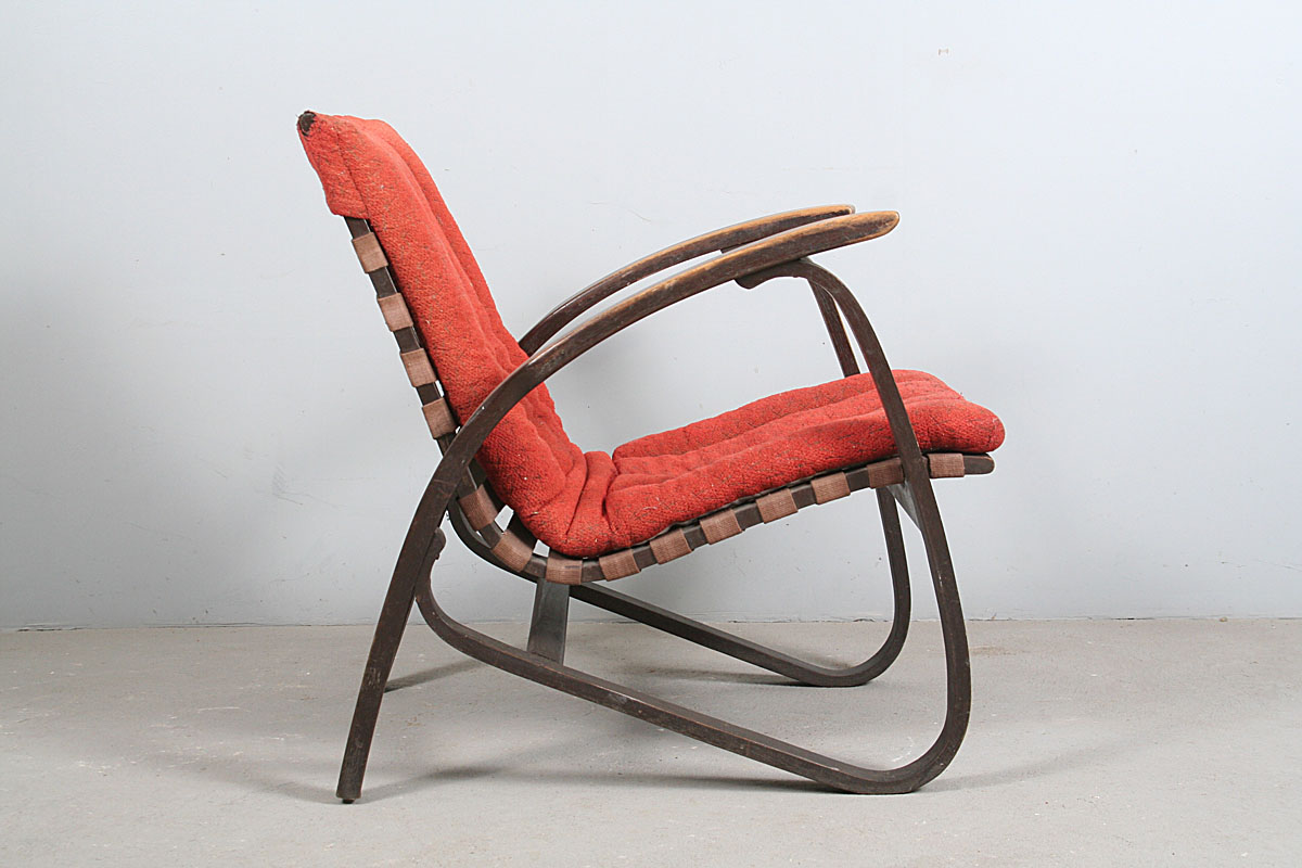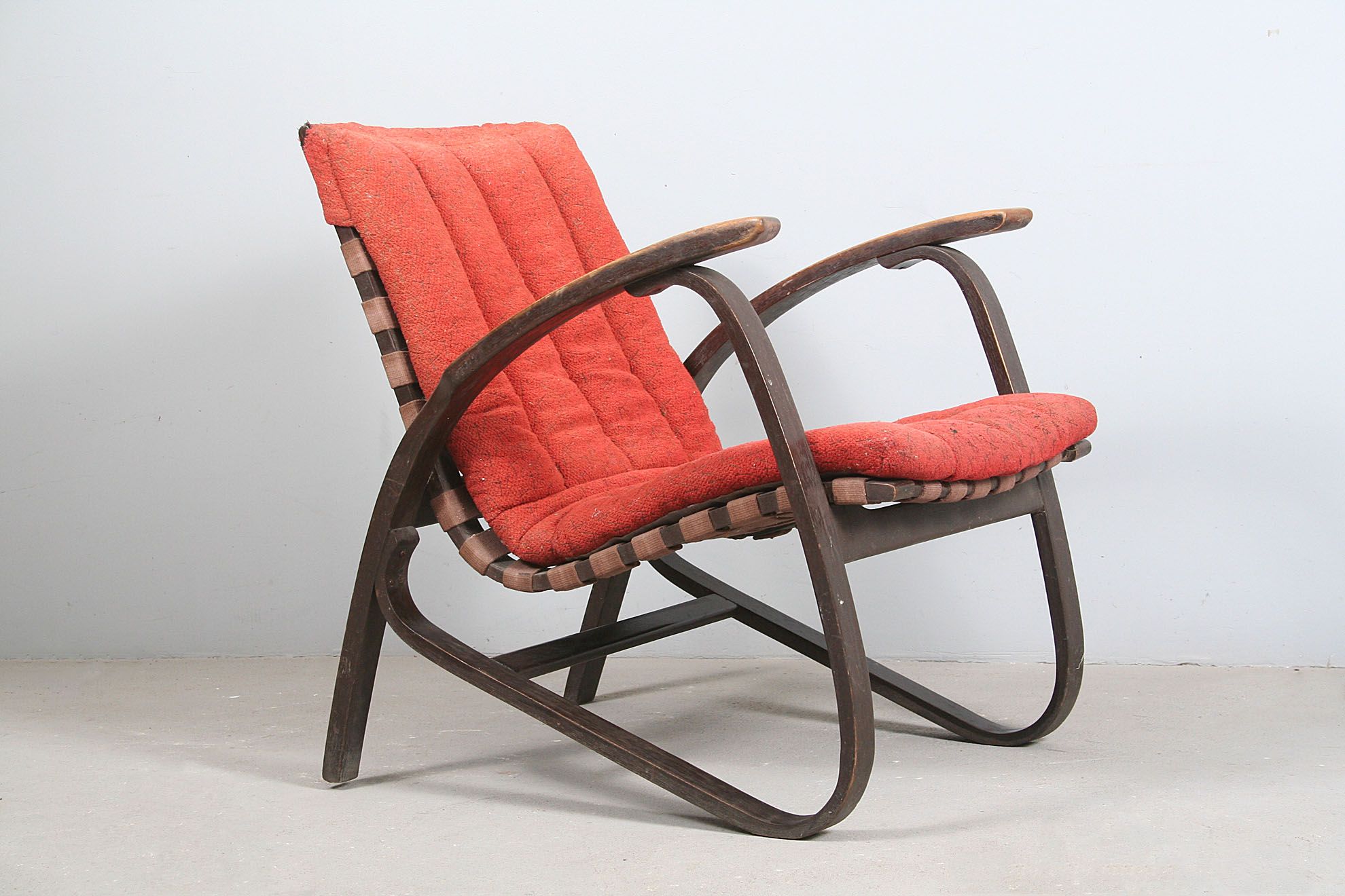 ikonické křeslo design Jan Vaněk, ohýbané mořené bukové dřevo avantgardních tvarů, původní polstrování uchycené ke křeslu pouze v horní části opěrky, popruhy nepotrhané, dřevo nepopraskané, konstrukce nerozviklaná, velmi příjemný posed, područky a lak omšelé, 78 x 62 x 77 cm