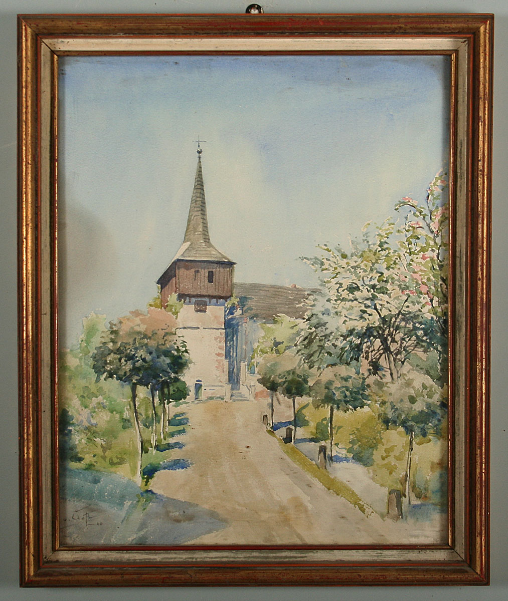 jarní pohled na rozkvetlé stromy u cesty k zvoničce v Hronově, akvarel na papíře 38 x 30 cm, s rámem 45 x 37 cm, autor Otakar Štáfl, podepsáno v levo dole O. Štáfl 40, rámováno v původním rámu pod sklem