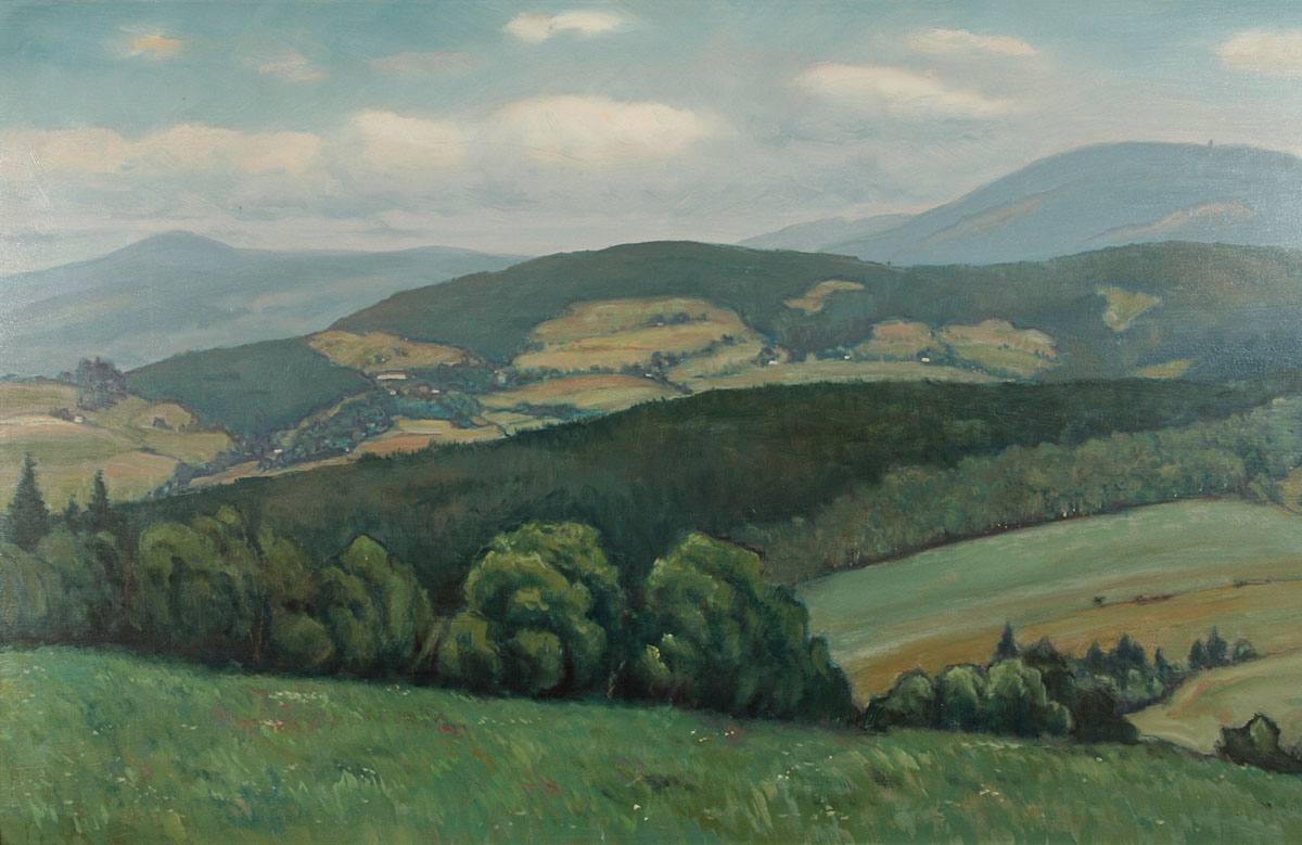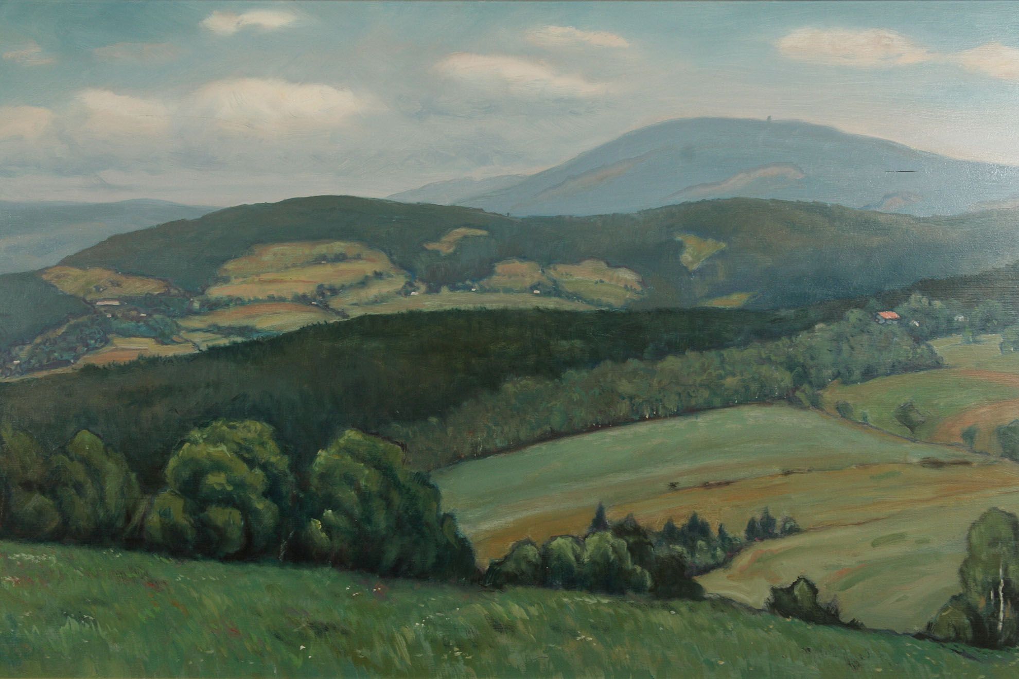 obraz hornaté krajiny, olej na desce 55 x 112 cm s rámem 66 x 122 cm, autor Jindřich Šimek, podepsáno vpravo dole J. Šimek 75 a ze zadu na desce autorský štítek, rámováno