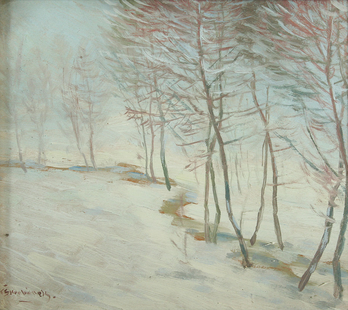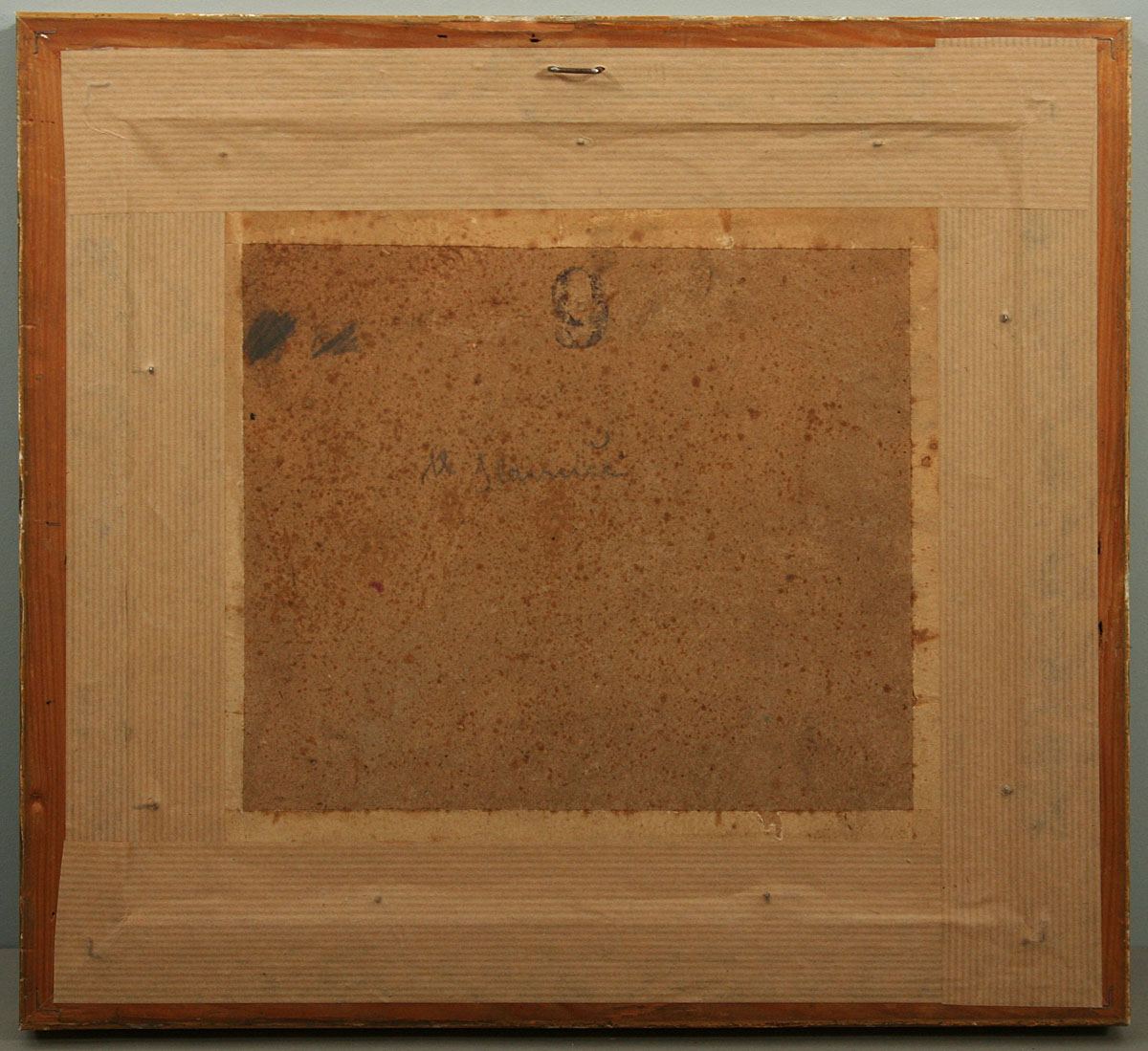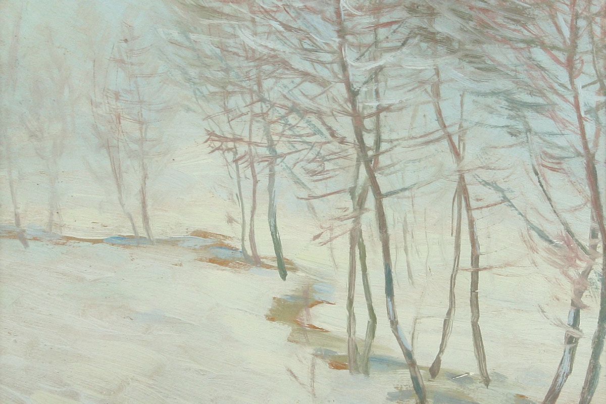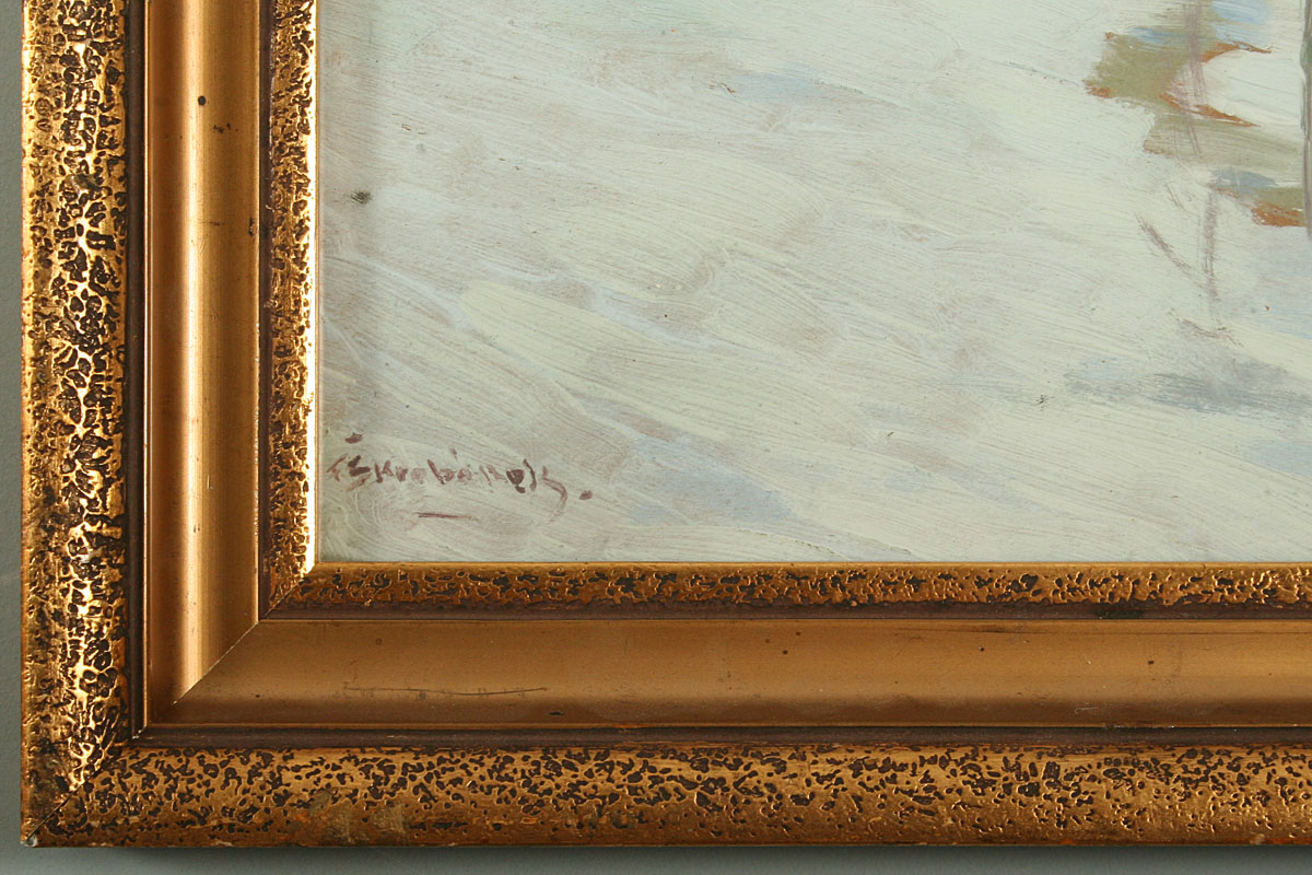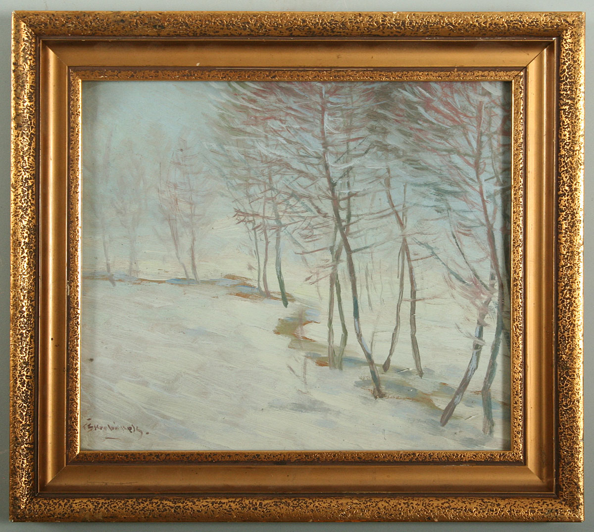 obraz zimní krajiny se zasněženým potokem u Slavníče (asi Nohavický potok), olej na kartonu 24 x 27 cm s rámem 32 x 35 cm, autor František Škrabánek, podepsáno vlevo dole F. Škrabánek, na zadní straně číslo 9 a autorský přípis U Slavníče, rámováno ve zlaceném rámu pod sklem