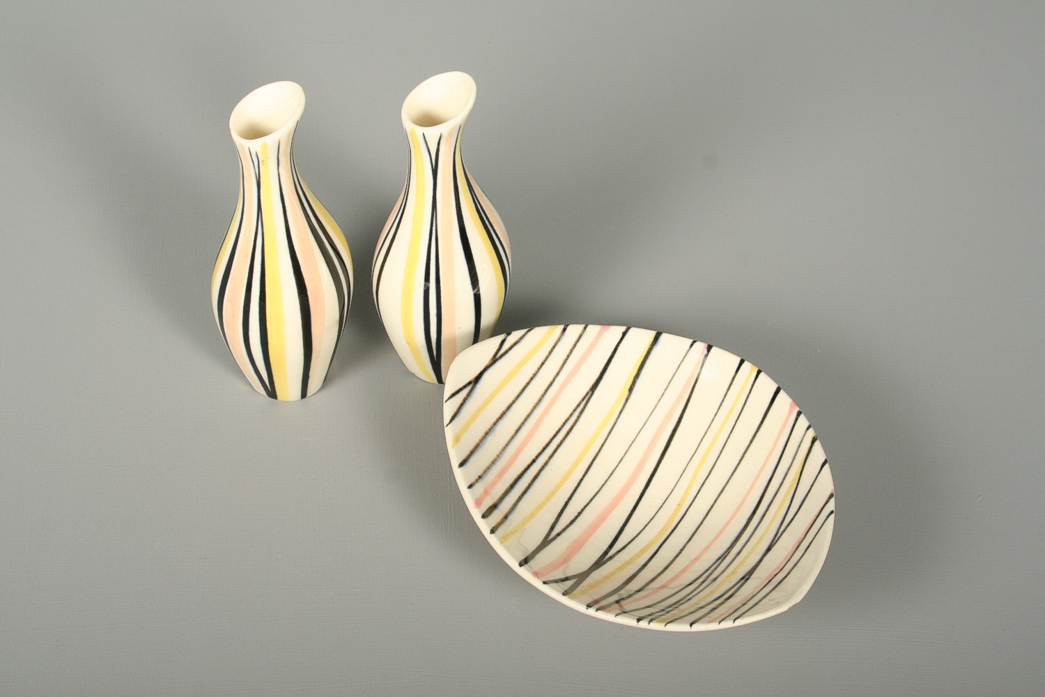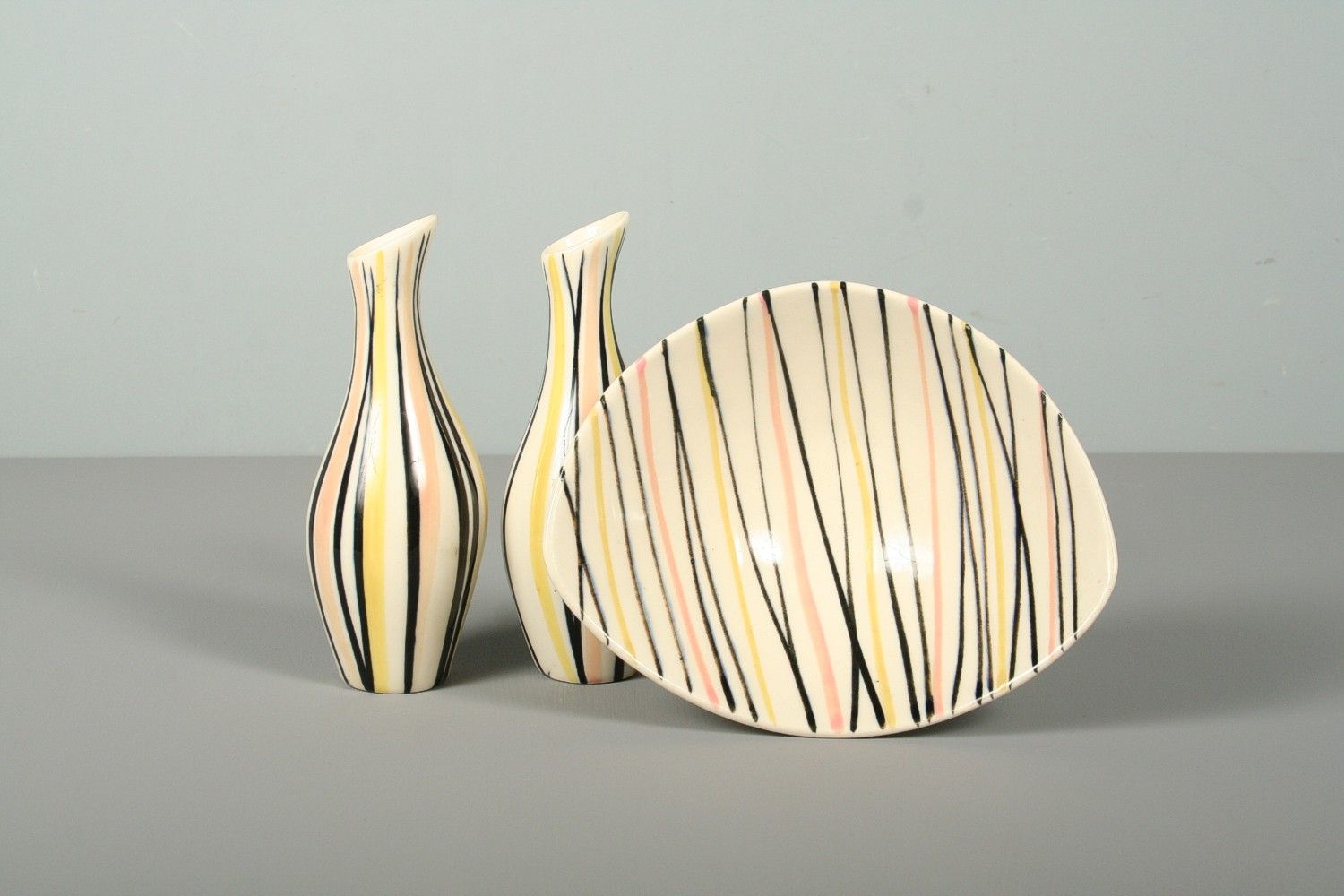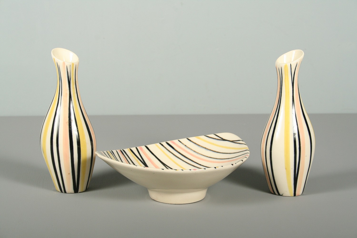 keramická miska a dvě vázičky na kvítka, dekorované barevnými linkami ve stylu 60. let, na dně značeno Ditmar Urbach, vázy 16 cm, miska 17 x 14 x 6 cm