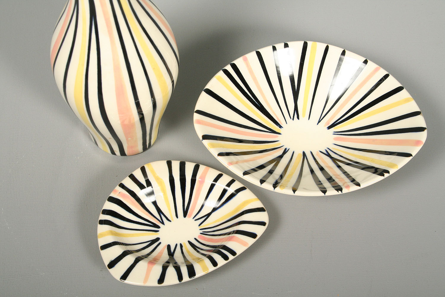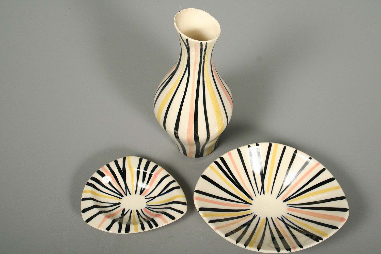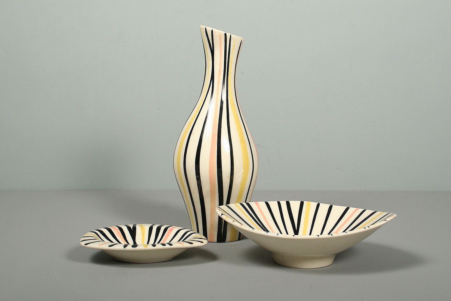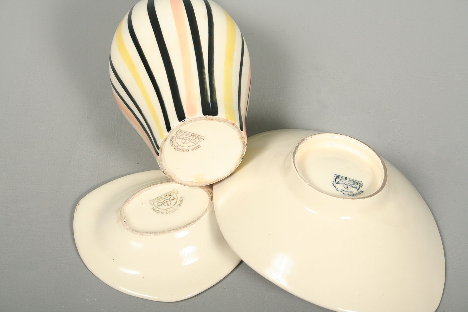 keramická váza a dvě misky, dekorované barevnými linkami ve stylu 60. let, na dně značeno Ditmar Urbach, váza 24 cm, miska 18 x 14,5 x 6 cm a menší 13 x 11 x 2,5 cm