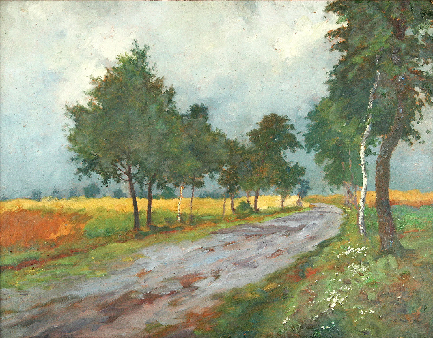 obraz letní krajiny s cestou, olej na kartonu, 34 x 44 cm s rámem 49 x 59 cm, autor Karel Beneš, podepsáno vpravo dole K. Beneš, rámováno v původním zdobeném rámu pod sklem