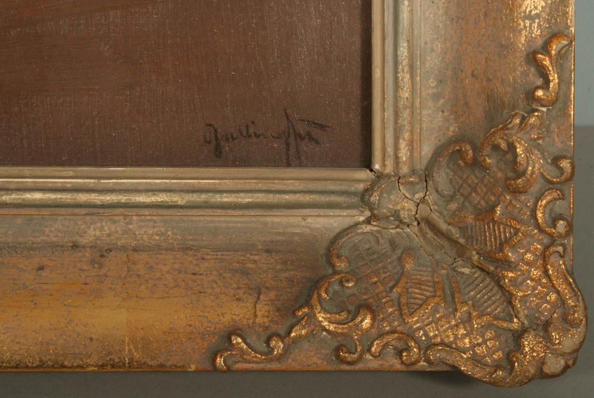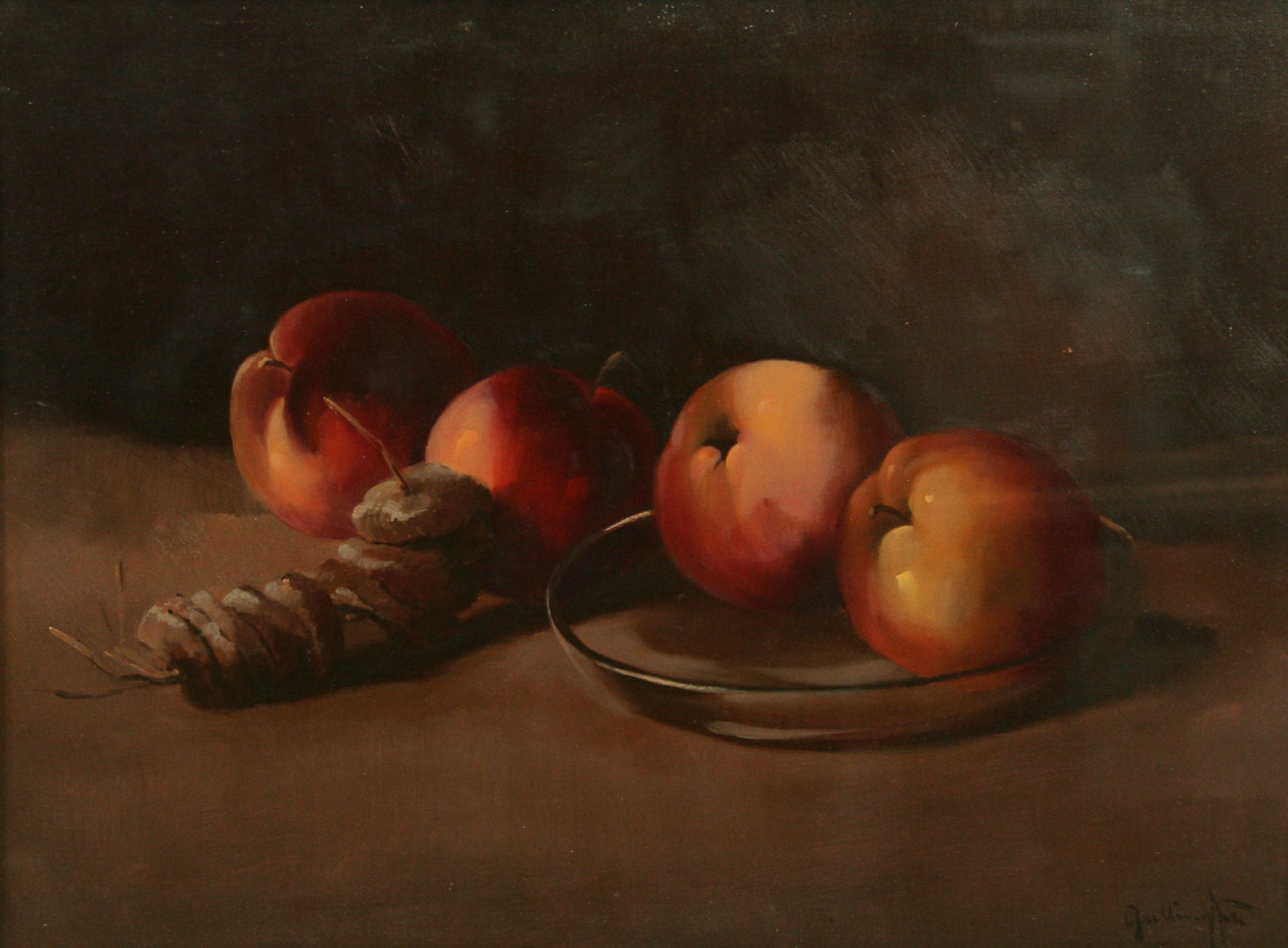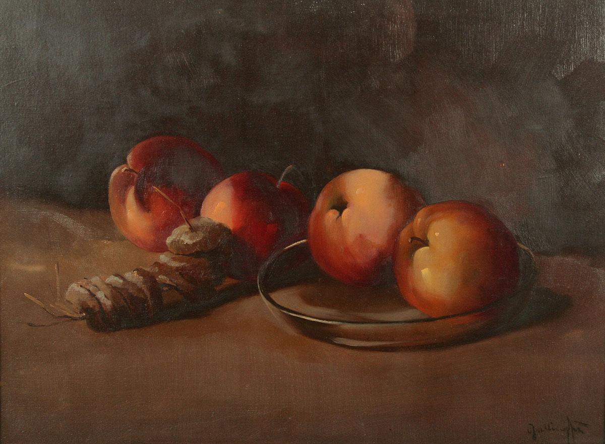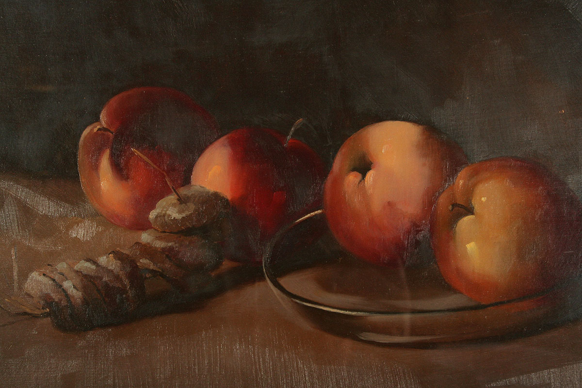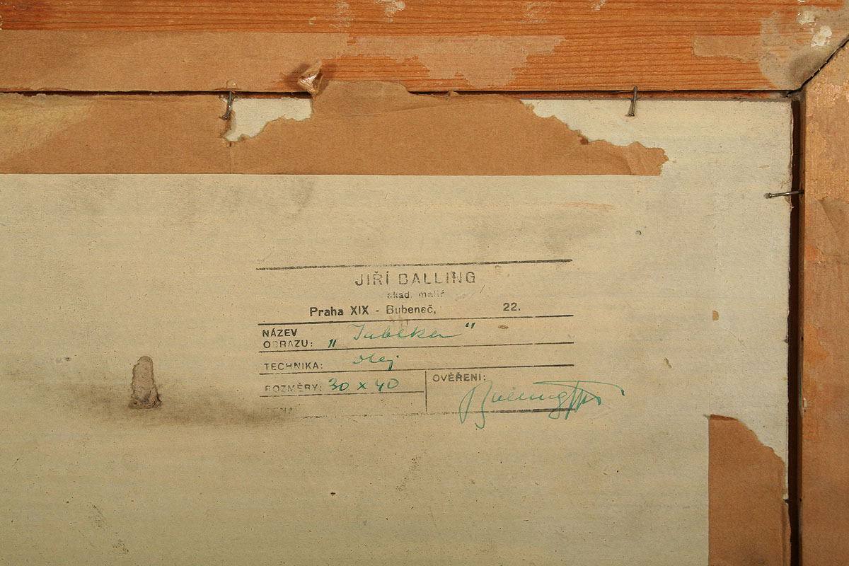 zátiší s miskou jablky a fíky, olej na kartonu 30 x 40 cm s rámem 41 x 51 cm autor Jiří Balling, podepsáno vpravo dole Balling Jiří, na zadní straně autorské razítko s přípisem, rámováno v původním zdobeném rámu pod sklem